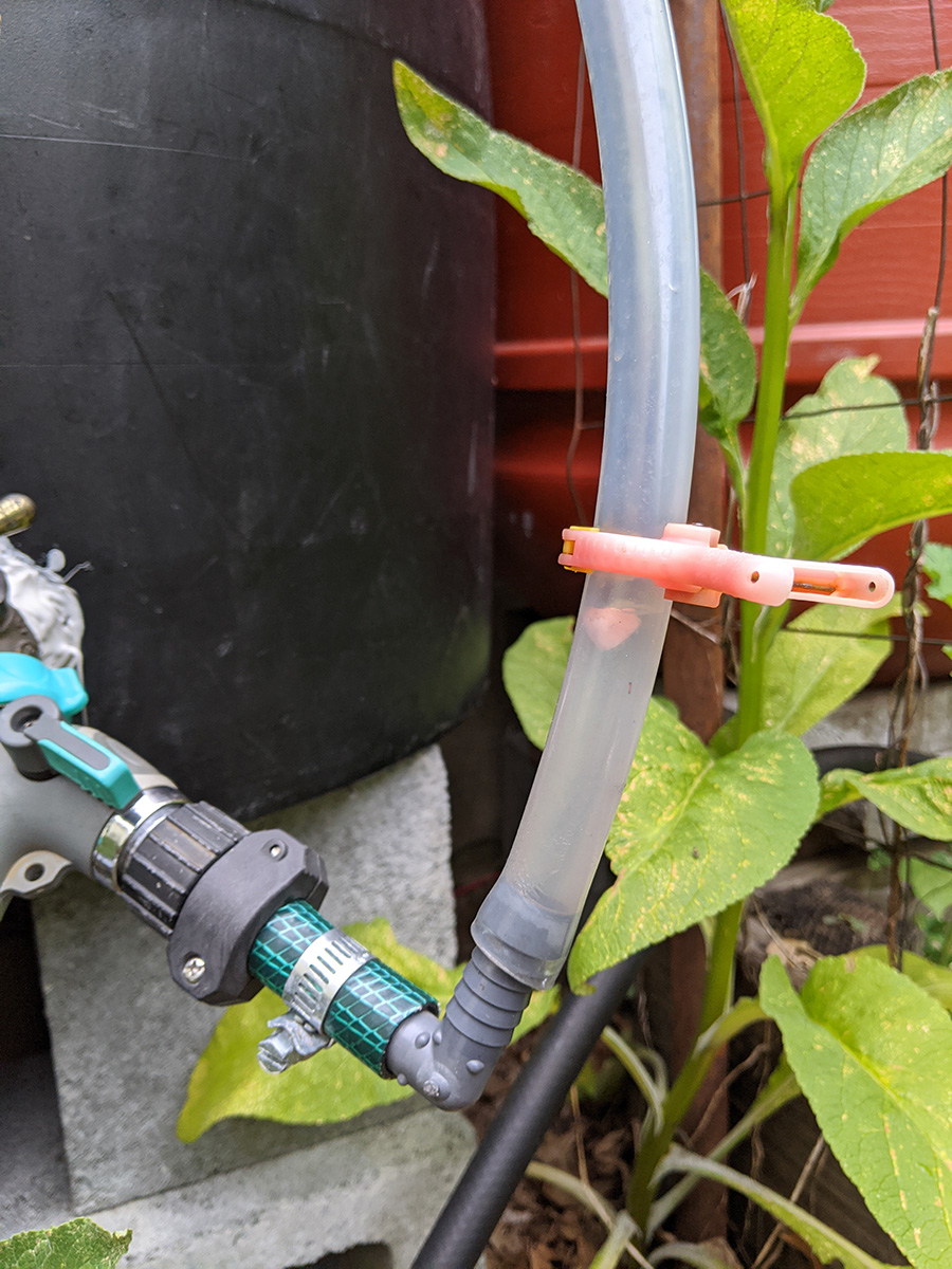 into the gutters, then through the downspouts into our rain barrels. it wasn't until 4:30pm when it'd rained enough that we finally started getting some accumulation. the sound of rain trickling into the barrels is a soothing music. i knew our existing rain barrels were working, but i was curious about the 3 new barrels out in front of the house. the catch barrel was filling up, the one next to it was slowly getting a trickle of water, while the third barrel on the end wasn't getting anything. later when the rain stopped i went outside to check the front barrels again: the third barrel was still empty, the middle barrel had some water but it was below the brass bulkhead fitting, and the catch barrel had the most rain.