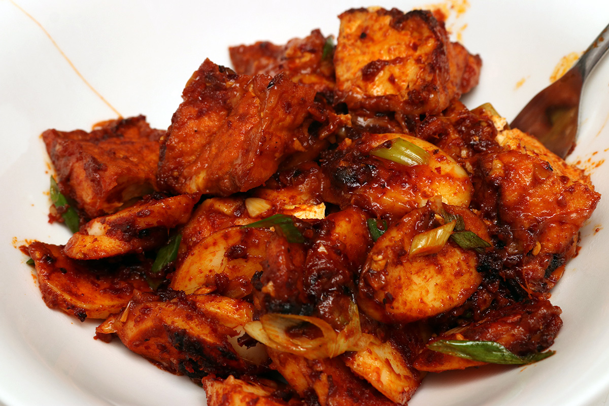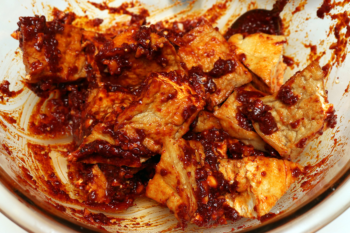 the finished buldubu with cheese was just okay. all the pieces were delicious, but after i cooked everything, it lost a lot of the magic of the fresh ingredients. in theory it should've worked, but something went wrong. for one thing, it was too dry. the spicy paste sort of disappeared, though some of the charred pieces of tofu and rice cakes were more delicious because of the caramelized sugar. the rice cake also clumped together. it is a very filling dish, starch from the rice cake combined with the protein from the tofu. it's a recipe worth revisiting, or find a better spicy korean tofu with rice cake recipe.