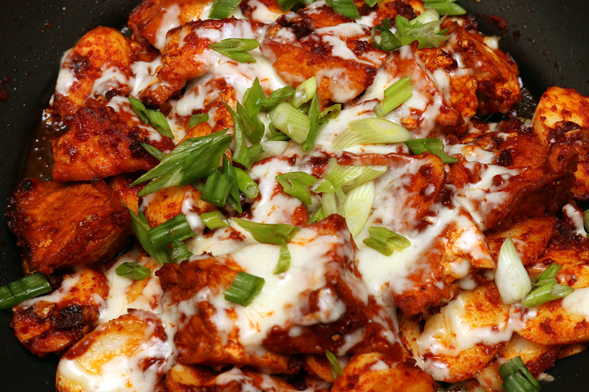 | cut tofu wedges in half. mix rest of ingredients to form paste, mixed with tofu. heat frozen rice cakes in pan with some oil until soften, set aside. heat tofu and hot paste mixture in pan on medium-high for 10 minutes with cover on. add rice cakes, heat 10 more minutes low heat. top with mozzarella cheese. served when cheese melted. top with scallions. | |