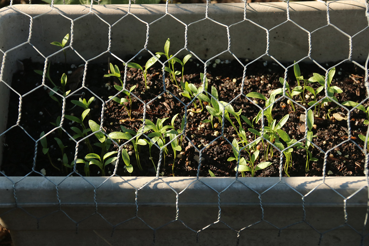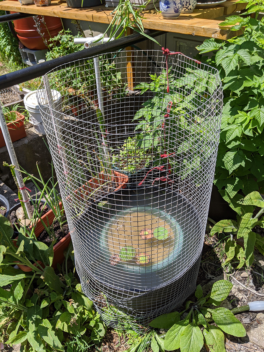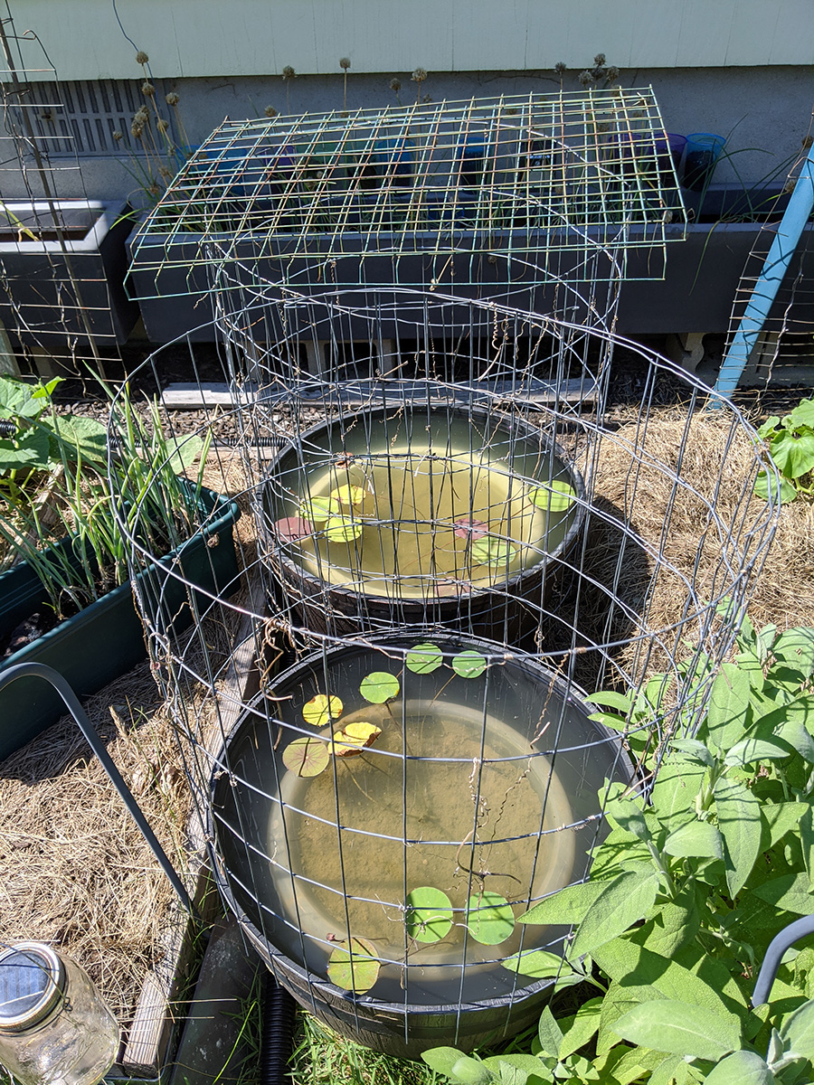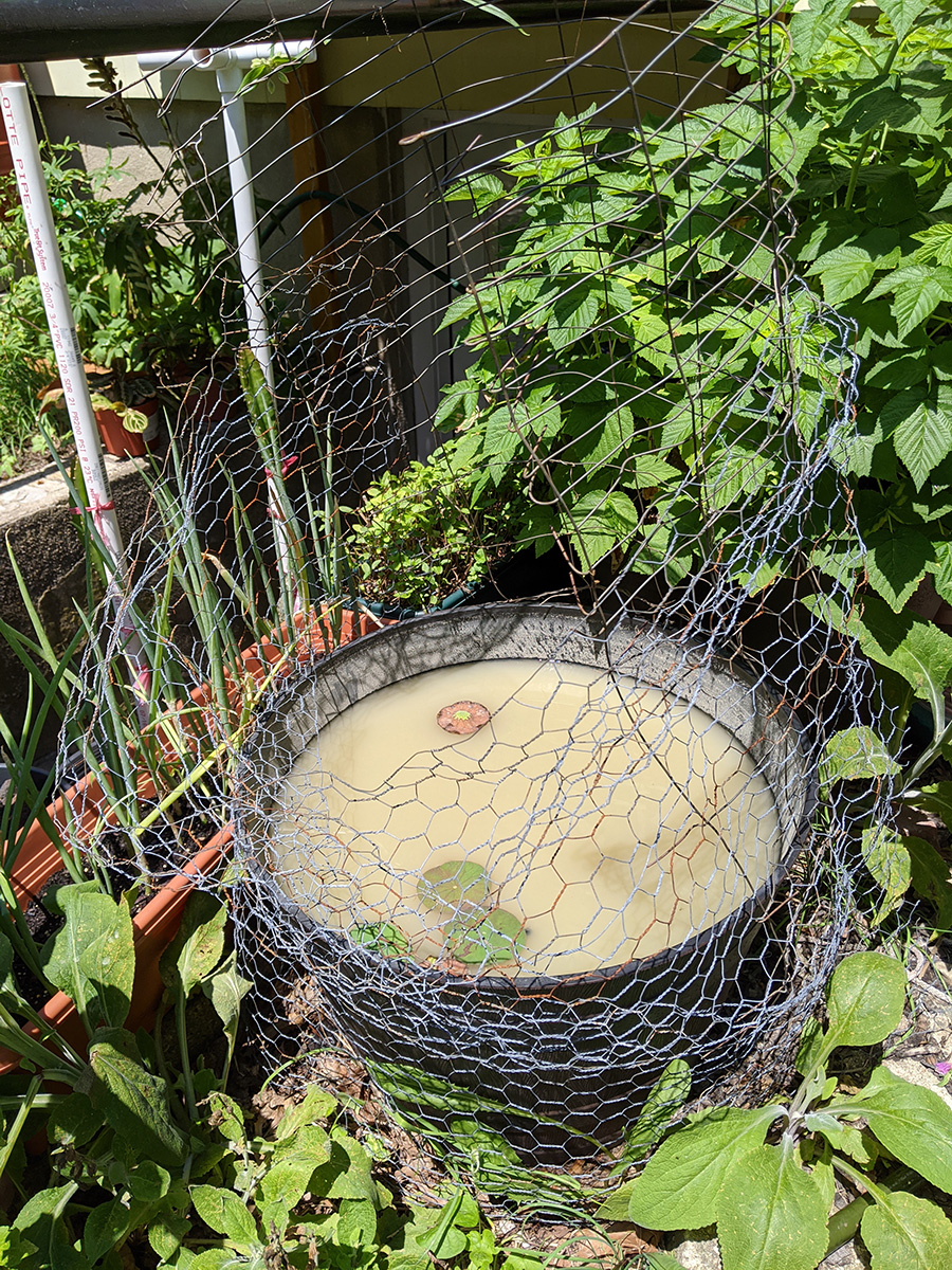 instead of cutting up new fencing for the basement lotus barrel, we just happen to have some tough wire mesh which used to serve as my sister's compost bin before she decided she didn't want it anymore. it's the perfect size to fit around the barrel, slightly smaller circumference, but i just had to open it up a little bit at the bottom. this wire mesh has smaller holes that a raccoon can't get through, but it's also taller so i'd need to remove the fencing if i want to get access to the barrel.
