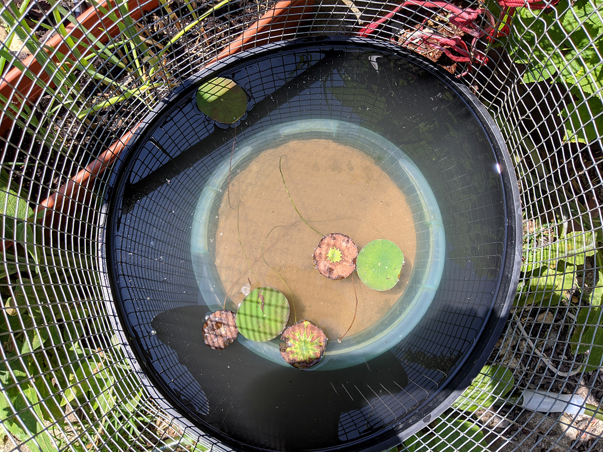 inspecting the other lotuses, i noticed some disturbances in the middle lotus barrels. a raccoon tried to get inside these barrels but it couldn't. instead it must've stuck its paw as far as it could reach through the cages, clawing at the edge of the basin, scooping out some clay mud. if these cage barriers hadn't been tougher, the raccoon would've gotten into these as well. for maximum protection i should also put chicken wires at the bottom so there'd be no chance of a raccoon trying to paw at the lotuses.
