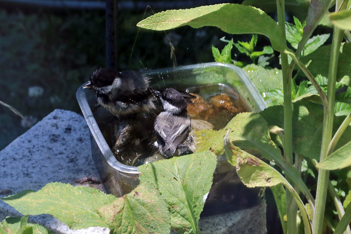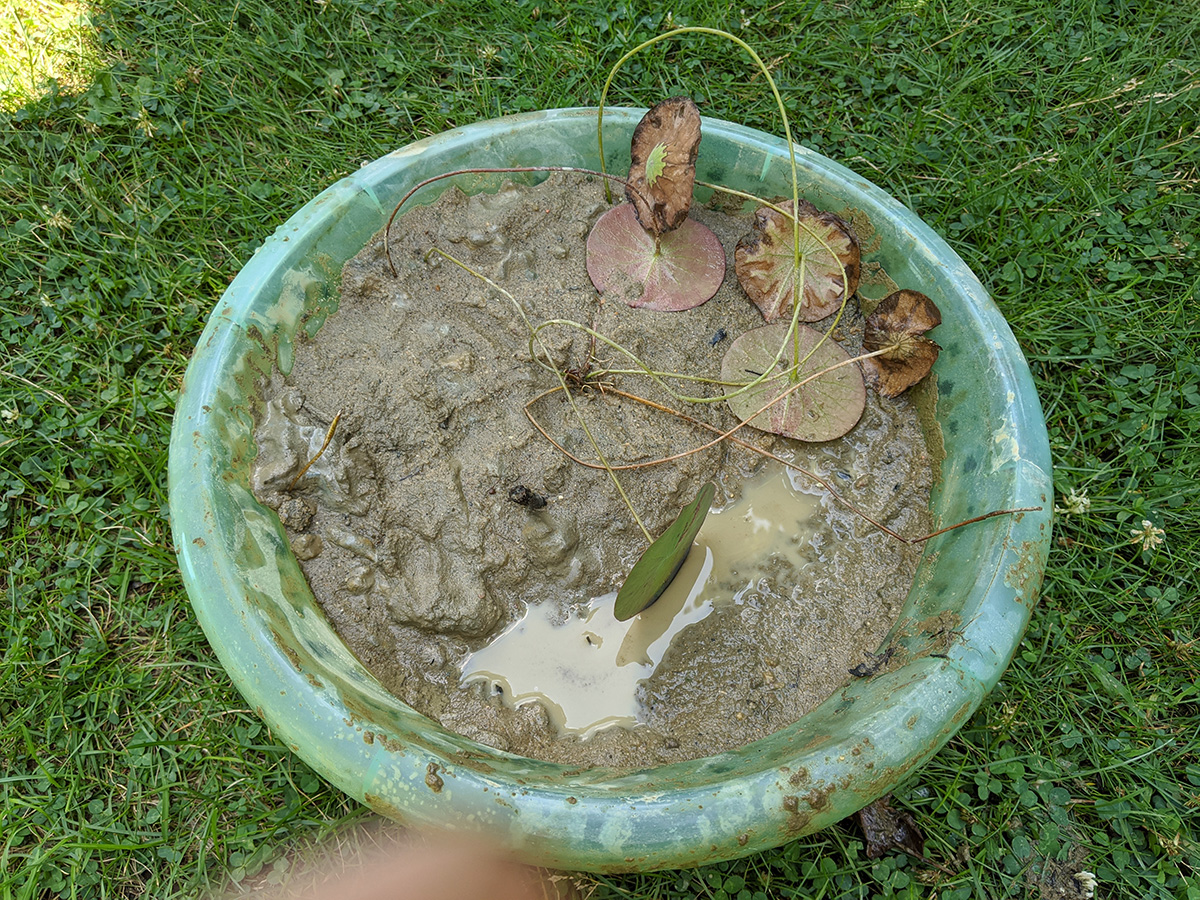 the mud was thick enough that there was nothing i could do but put a new layer of sand over the basin and gently repot the central lotus root ball. i scooped out all the opaque muddy water from the barrel (used it to water some plants) then washed the inside before refilling it with rainwater collected in a bucket from the rain barrel outflow spigot.