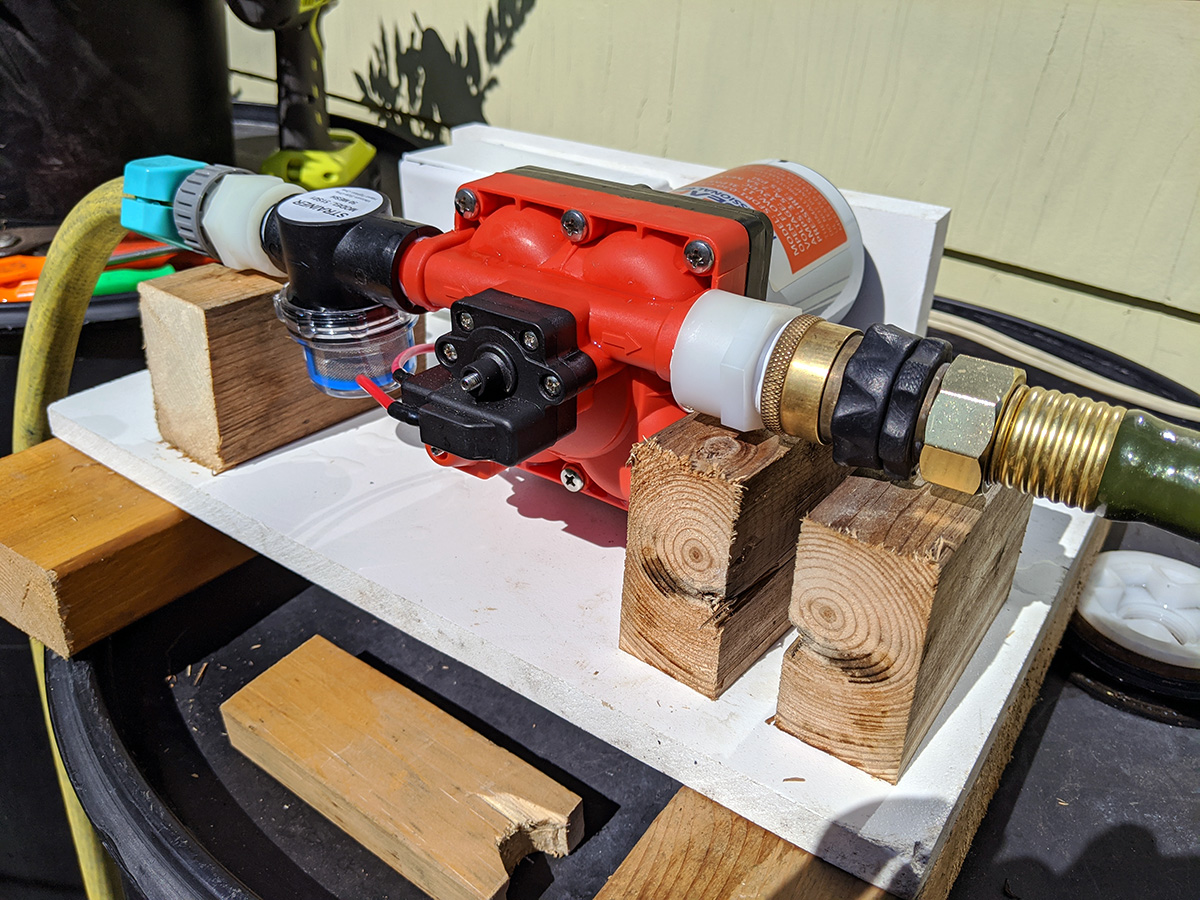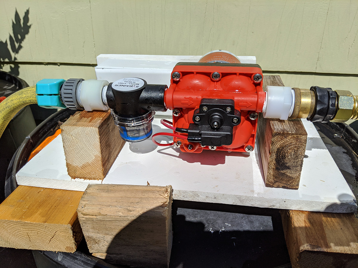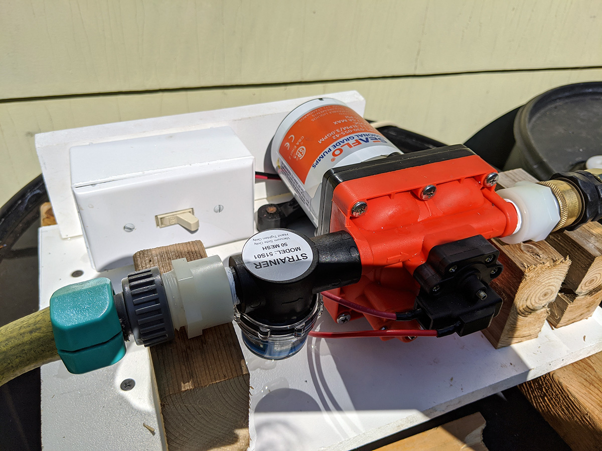 today we finally set up the seaflo series-42 on-demand 12v pump. it's been a long journey, nearly 2 months, from when we first decided to get the seaflo series-33 (5/7), then figuring out that the 42-series (with variable flow) is a better pump for the same price since it reduces cycling, returning the 33-series and exchanging it for a 42-series (5/15), clerical error at seaflo that caused a delay in the shipping of the replacement pump (5/27), pump finally arriving (6/2) but us realizing that the brass 1/2" to 3/4" adapter fitting would strip the plastic thread on the pump, ordering nylon garden hose fittings instead (6/2), waiting for the fittings to finally arrive (also factory delayed, 6/16), having all the necessary parts during a long dry stretch where our rain barrels were nearly empty, and finally setting up a base for the pump with an on/off toggle switch.