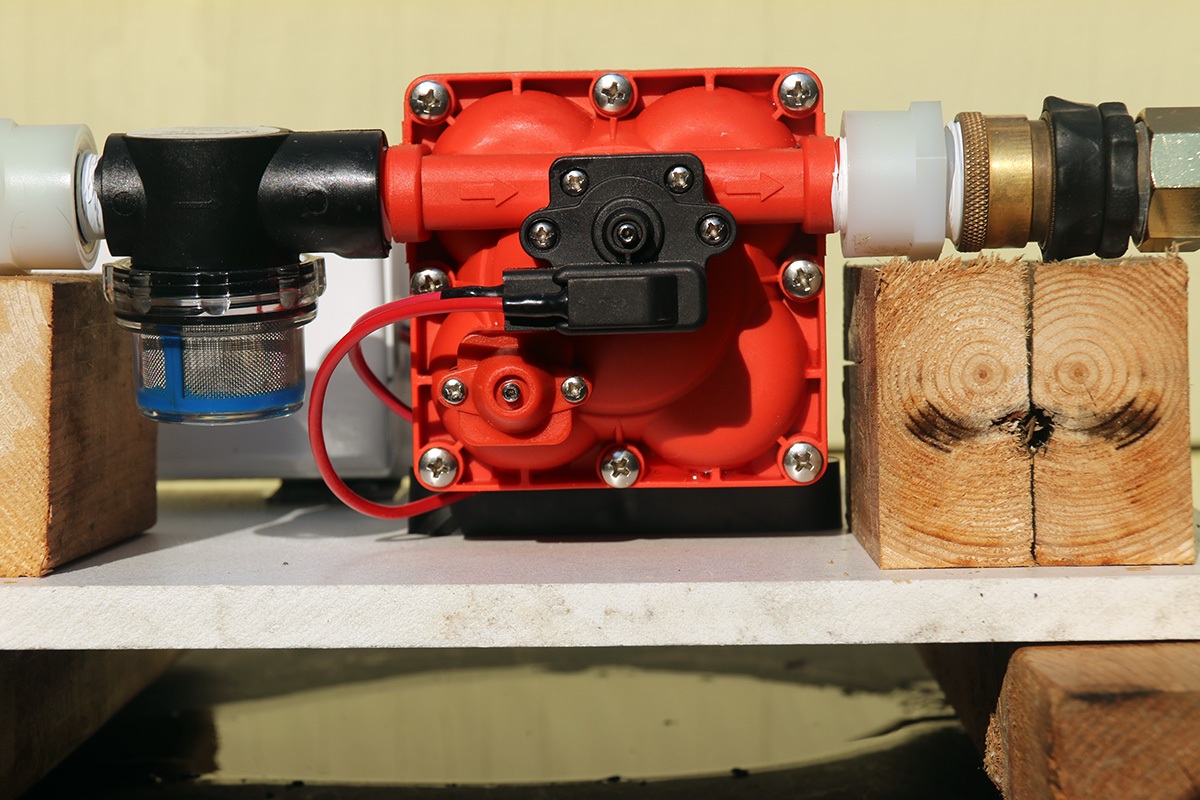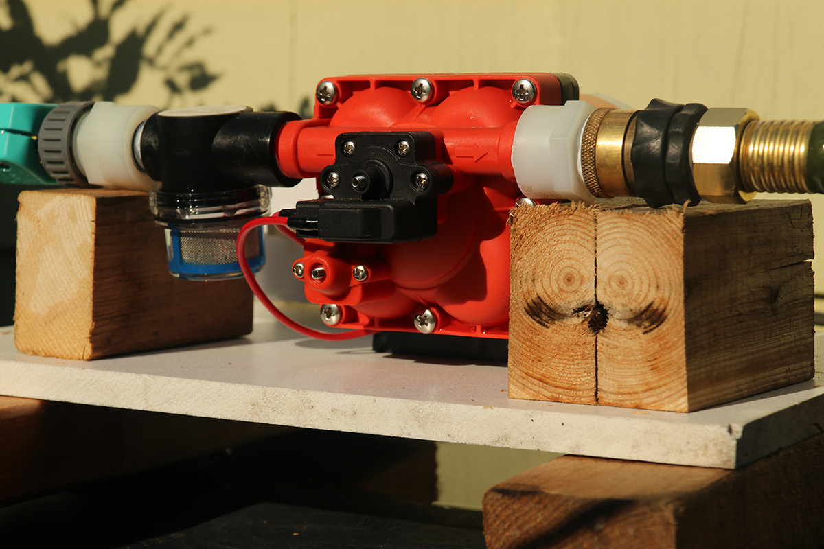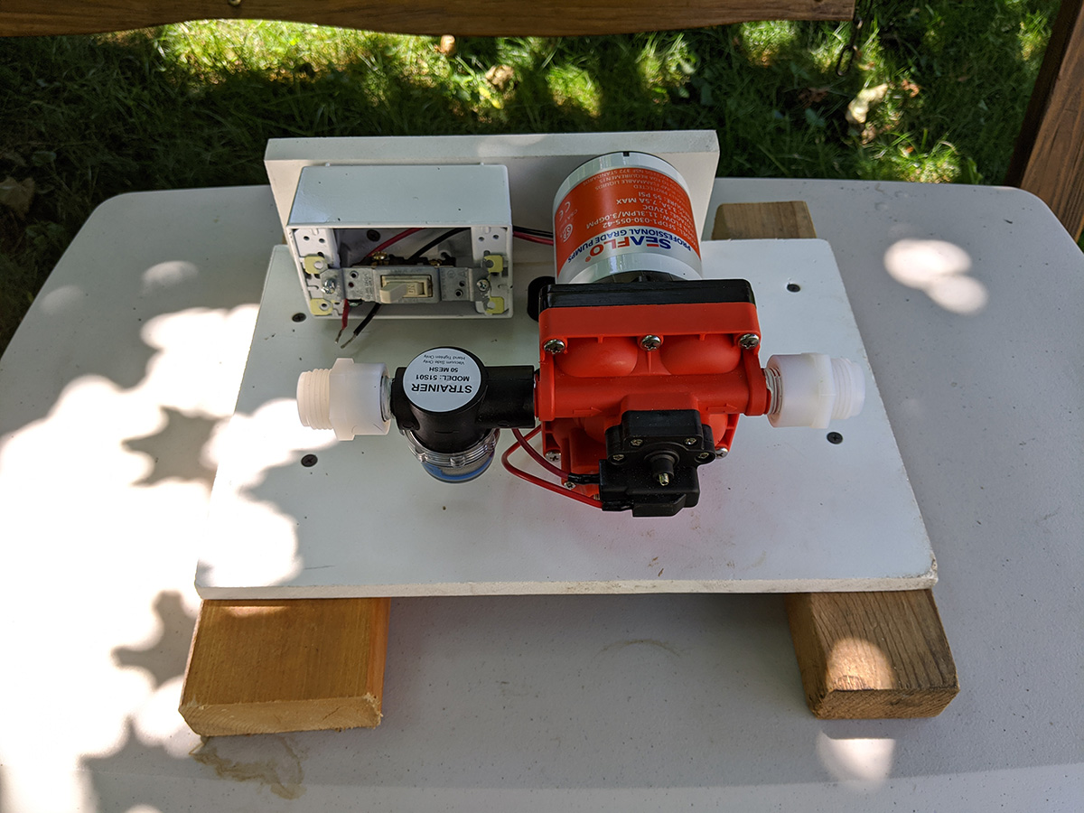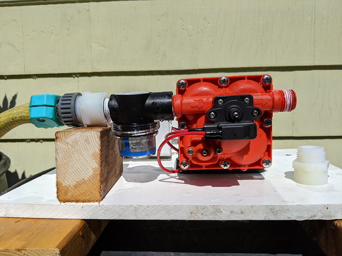 today we finally set up the seaflo series-42 on-demand 12v pump. it's been a long journey, nearly 2 months, from when we first decided to get the seaflo series-33 (5/7), then figuring out that the 42-series (with variable flow) is a better pump for the same price since it reduces cycling, returning the 33-series and exchanging it for a 42-series (5/15), clerical error at seaflo that caused a delay in the shipping of the replacement pump (5/27), pump finally arriving (6/2) but us realizing that the brass 1/2" to 3/4" adapter fitting would strip the plastic thread on the pump, ordering nylon garden hose fittings instead (6/2), waiting for the fittings to finally arrive (also factory delayed, 6/16), having all the necessary parts during a long dry stretch where our rain barrels were nearly empty, and finally setting up a base for the pump with an on/off toggle switch.