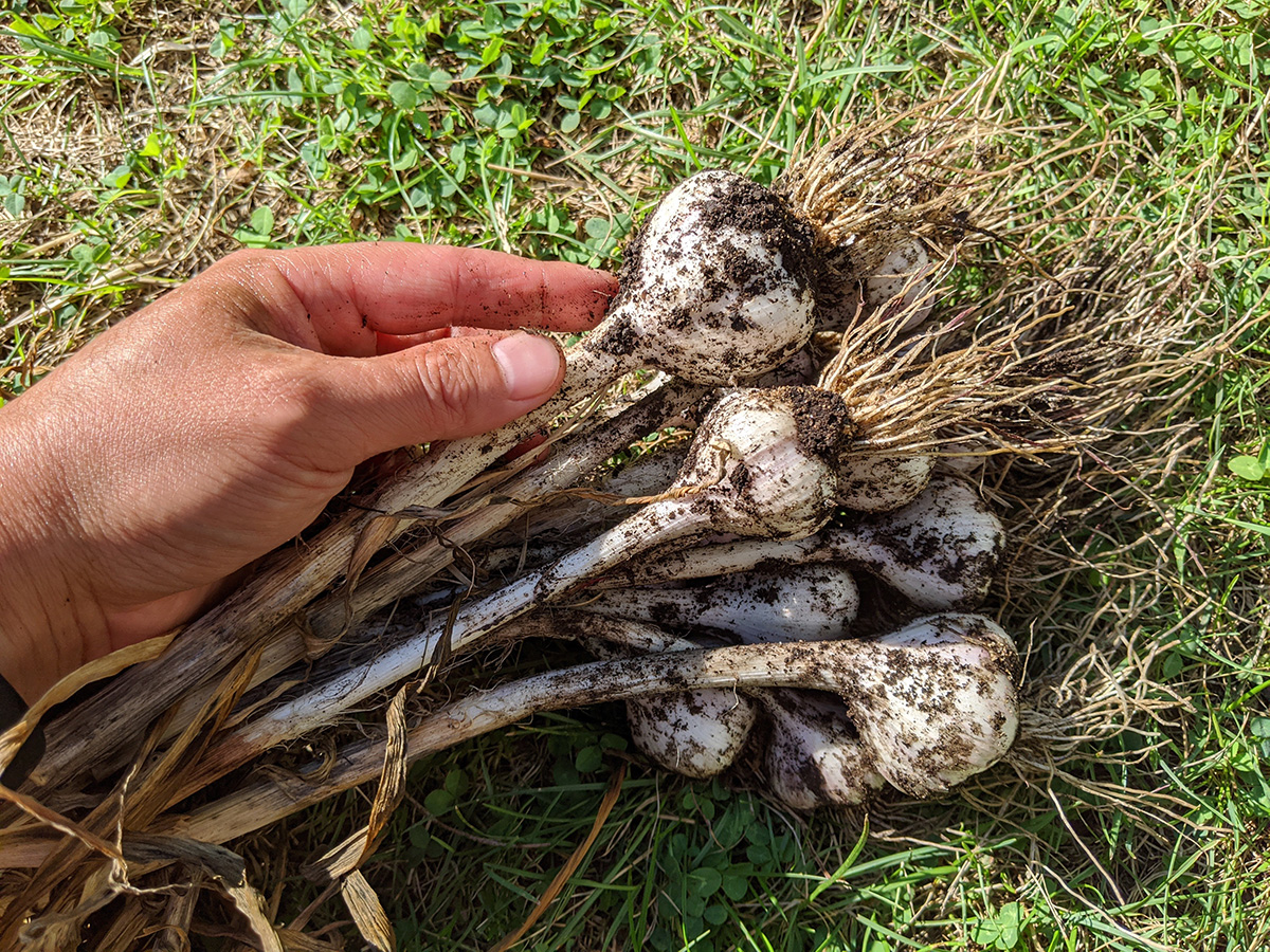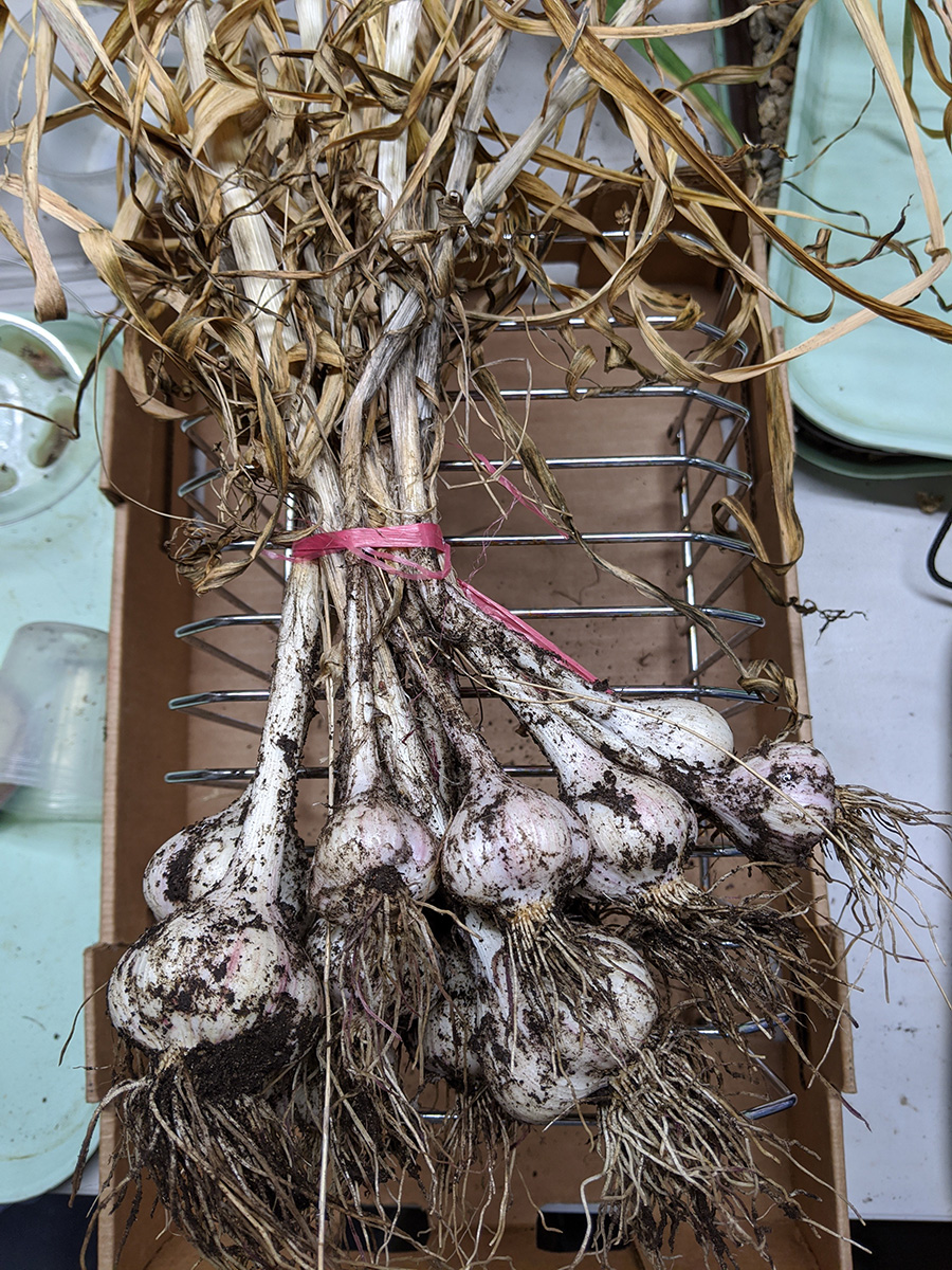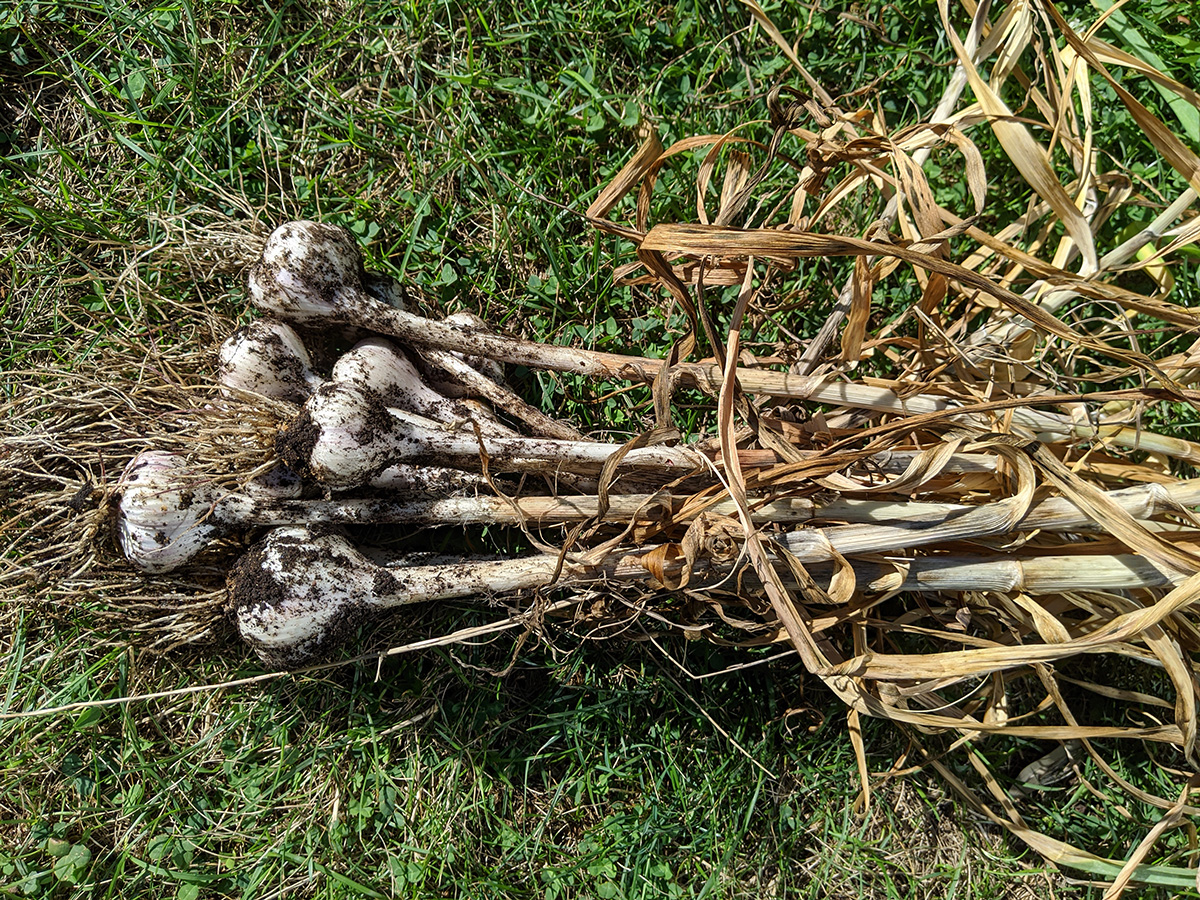 i pulled up some garlics today to see if they were ready or not. disappointingly, they were smaller than i'd hoped. maybe because it's been a dry couple of months. i put them in the unused grow room, with the hopes that the cool darkness will help them to cure.