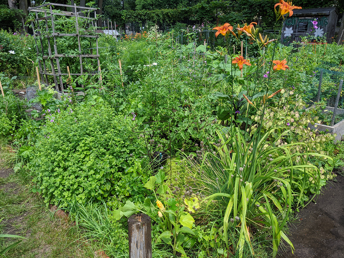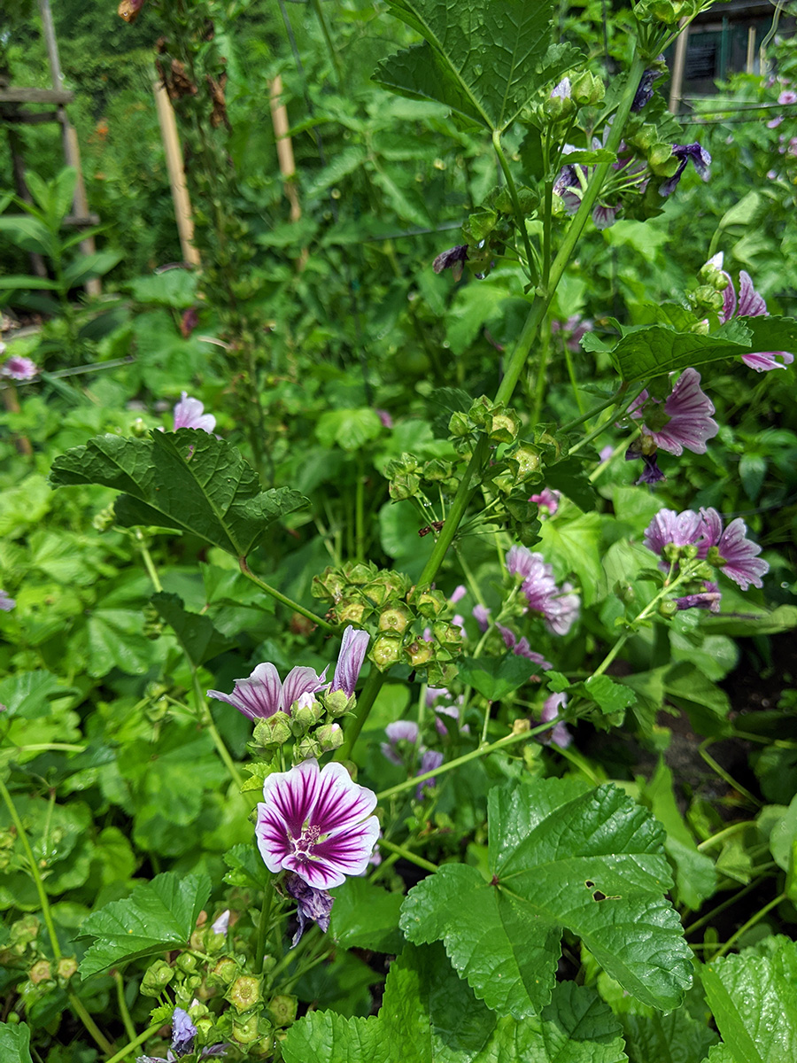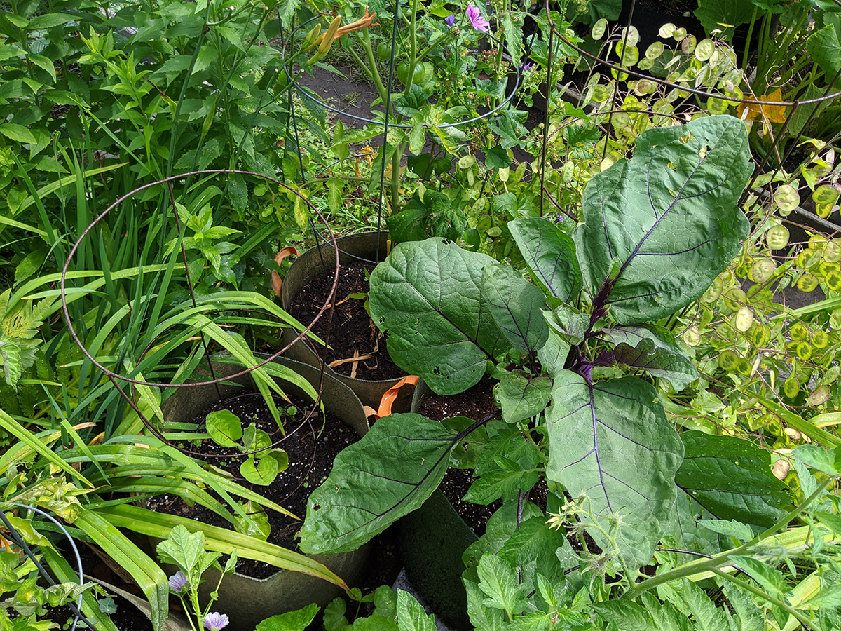 it's been nearly 2 weeks since i last visited the community garden. there was nobody else there in the late morning, i had the whole place to myself, except a few noisy adults picnicking in the playground field behind the garden. my plot was a jungle, the stone and brick pathway i laid out swallowed up by the plants. the pruning i gave to the lemon balm bush grew back by a few inches. striped mallow flowers dotted my garden, more to come as other mallows mature. my hydrangeas remain defoliate, i don't know if they can come back next year. my zucchinis lot a bit sad, most likely not enough nutrients. the daylilies are doing remarkably well in the full sun, growing taller than me. of my eggplants, the one in the grow bag with the fresh potting soil is a monster compared to the others, once again stressing the importance of proper fertilizing.