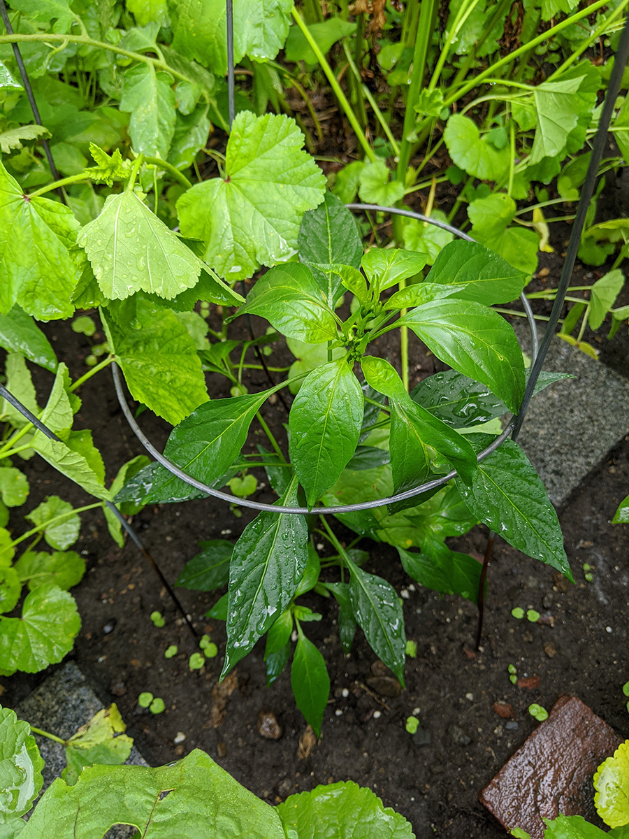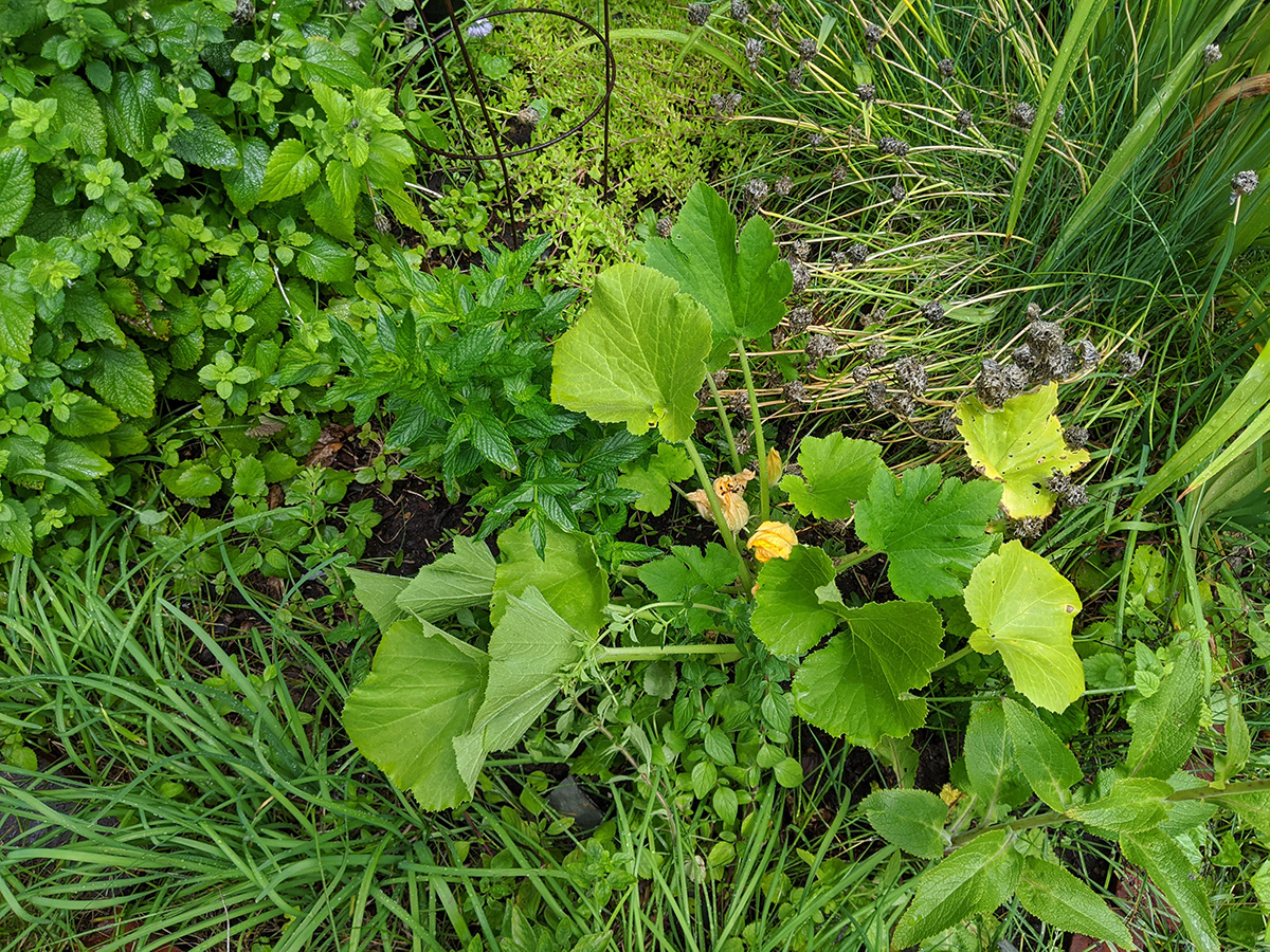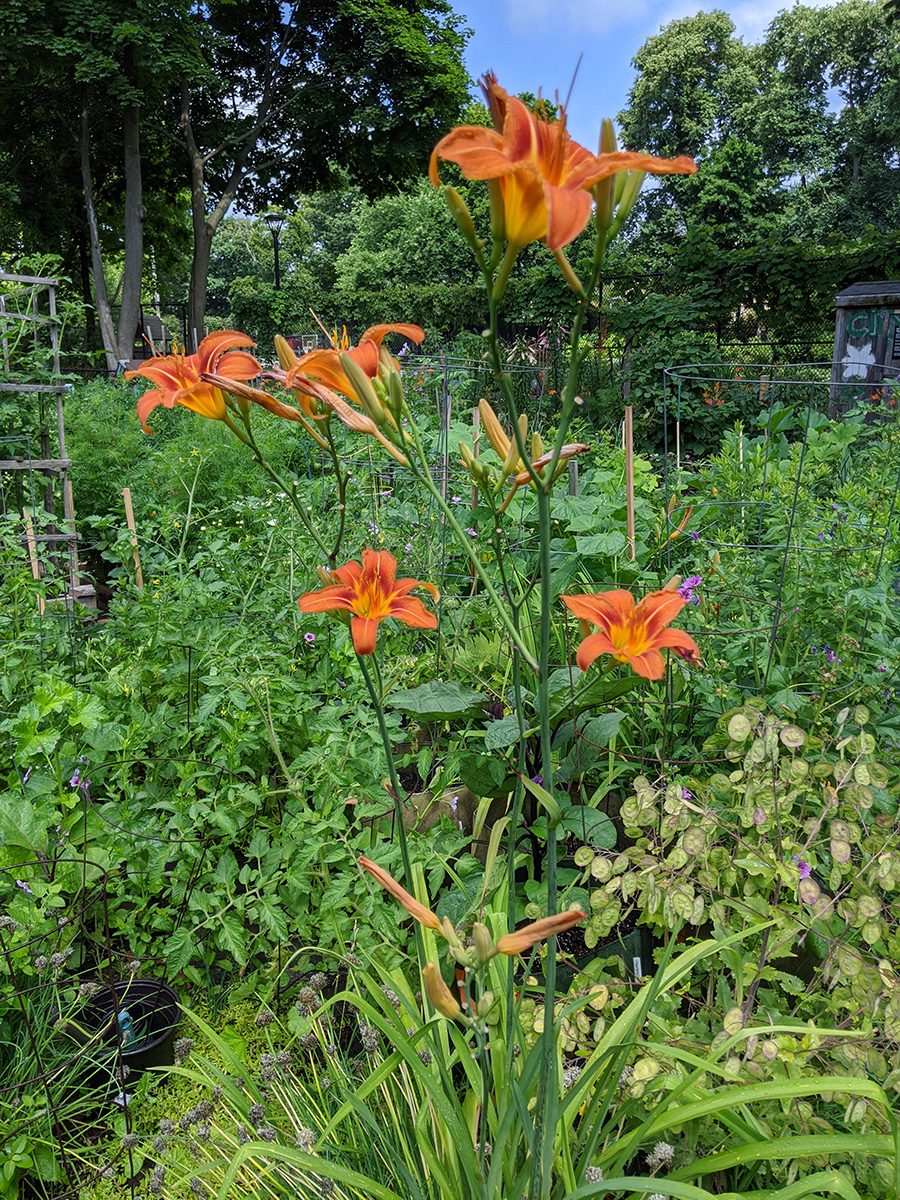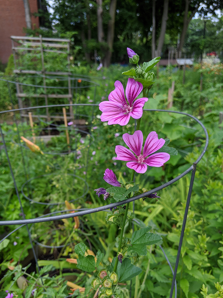 it's been nearly 2 weeks since i last visited the community garden. there was nobody else there in the late morning, i had the whole place to myself, except a few noisy adults picnicking in the playground field behind the garden. my plot was a jungle, the stone and brick pathway i laid out swallowed up by the plants. the pruning i gave to the lemon balm bush grew back by a few inches. striped mallow flowers dotted my garden, more to come as other mallows mature. my hydrangeas remain defoliate, i don't know if they can come back next year. my zucchinis lot a bit sad, most likely not enough nutrients. the daylilies are doing remarkably well in the full sun, growing taller than me. of my eggplants, the one in the grow bag with the fresh potting soil is a monster compared to the others, once again stressing the importance of proper fertilizing.