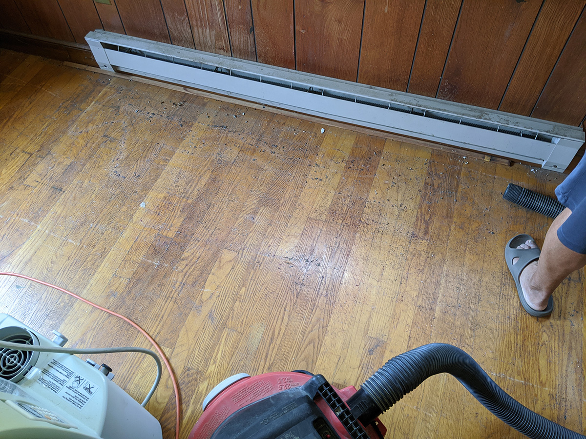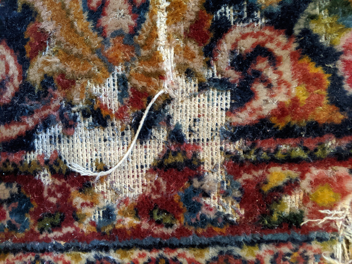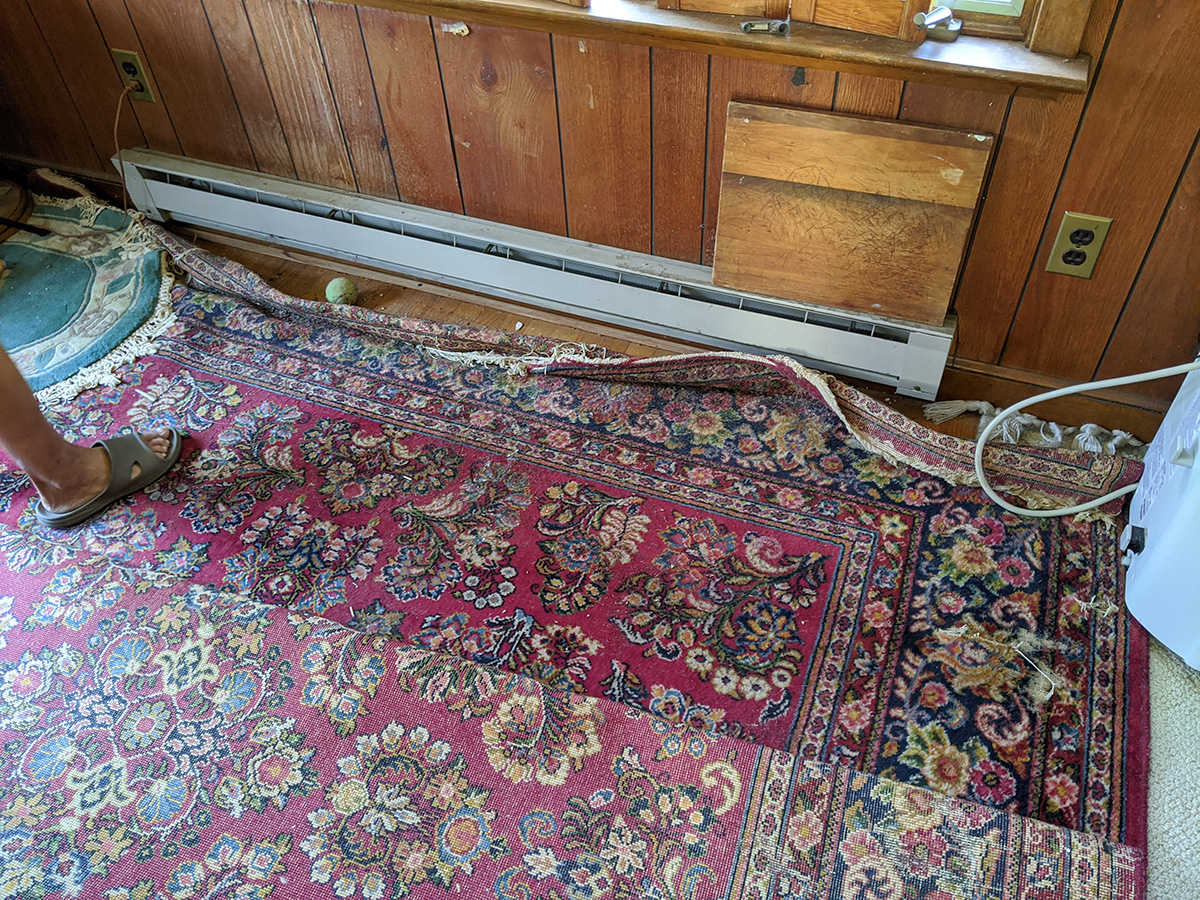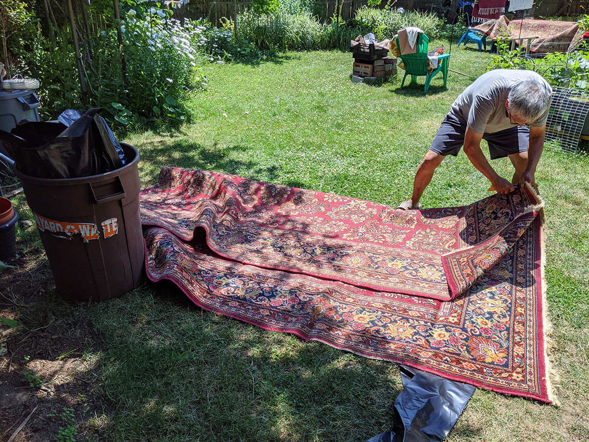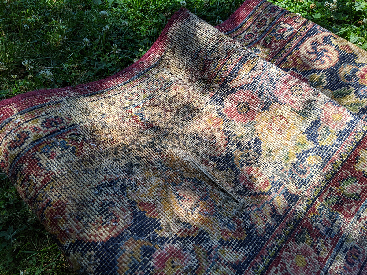 once the rug was removed, my father vacuumed the carpet dust (from where the larvae were feeding) and mopped the floor. later we went outside to cut the rug into smaller pieces with a box cutter so we could throw it out in the trash. it seemed a shame, such a large 100% wool oriental carpet, purchased by the previous owner of the house. but we never really took good care of it, seldom vacuumed the thing, and now infested with moths, it was time to get rid of it. besides, we still have another old oriental carpet, that one seemed to have escaped any moth damage. that good rug was actually layered on top of the bad rug, maybe the moths didn't eat it because it got more foot traffic.