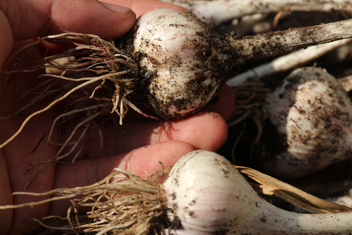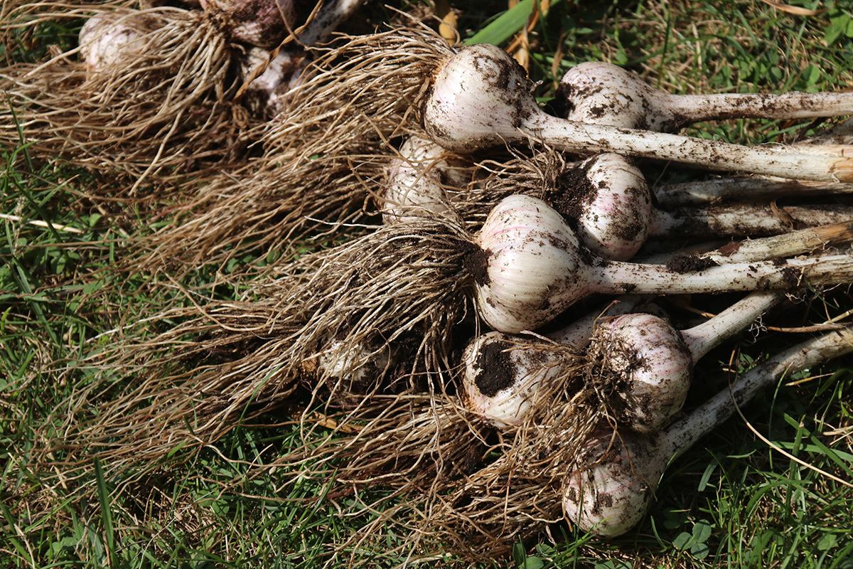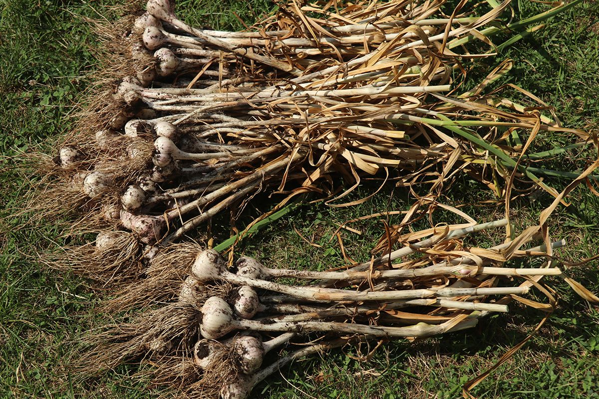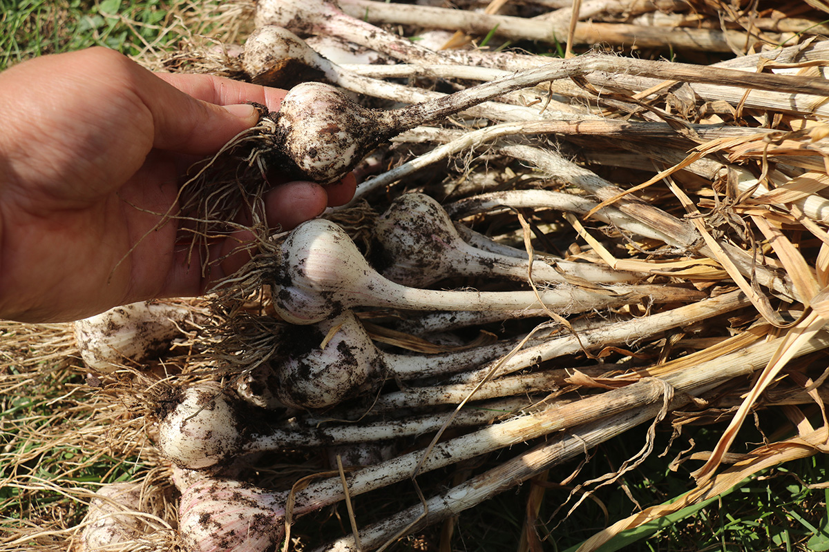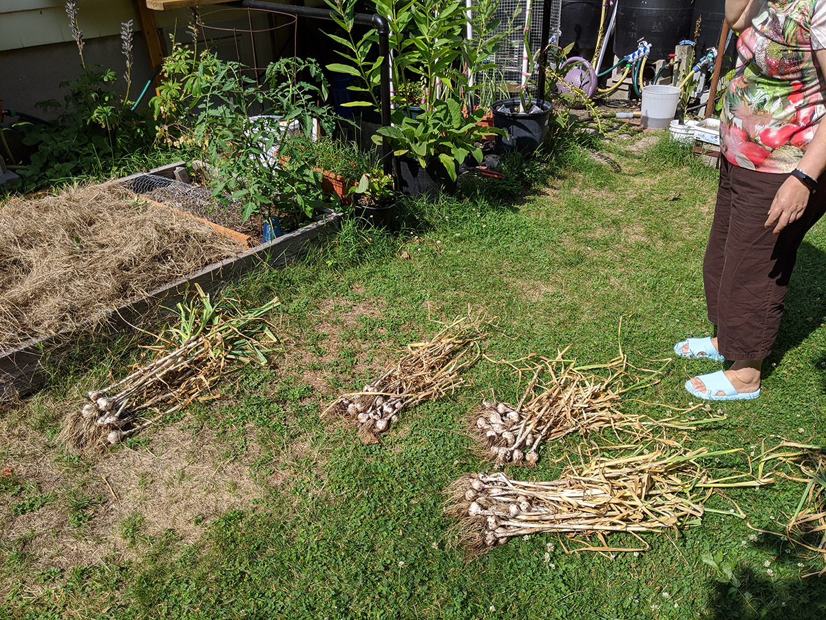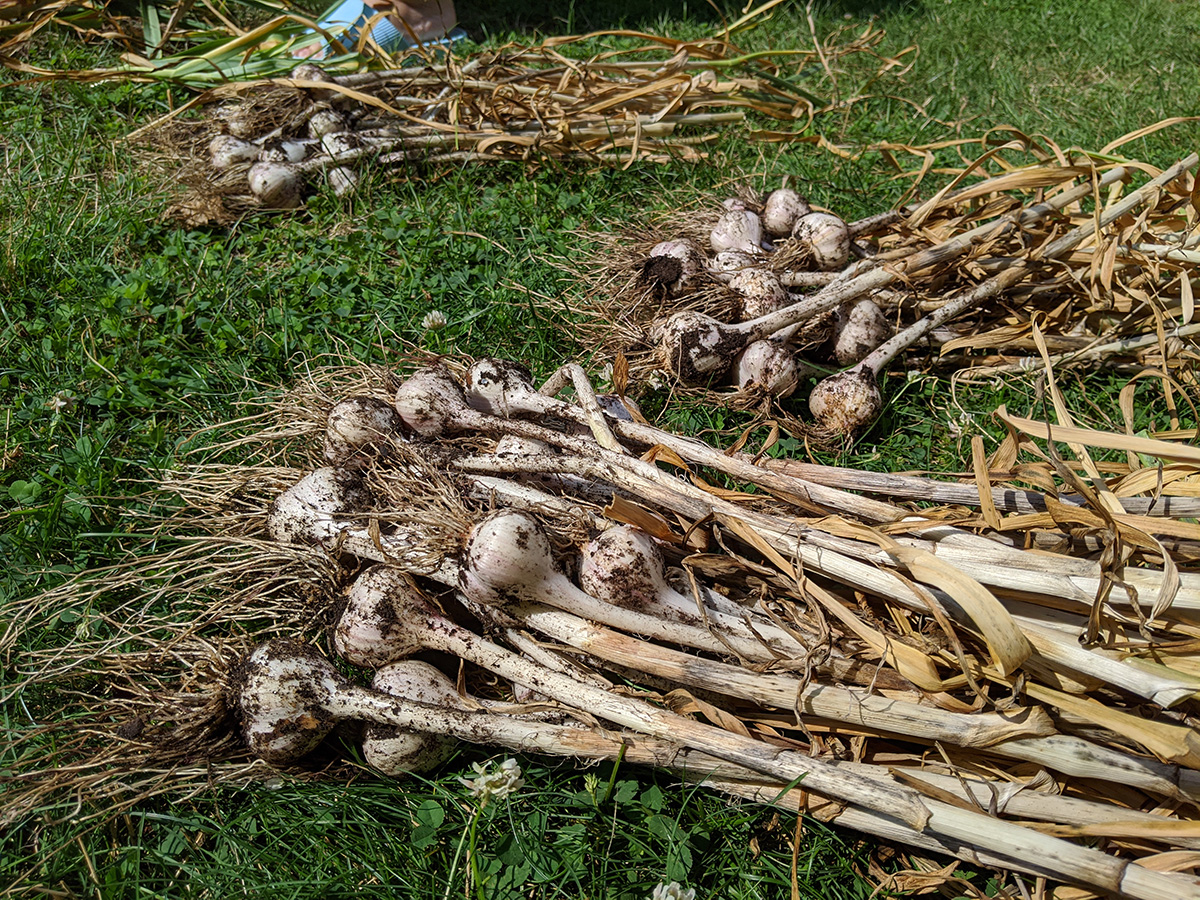afer pulling up some garlic yesterday to see they were ready to harvest, i pulled the rest of them today. the soil underneath the layer of salt marsh grass was dark and rich with nutrients, and full of fat worms too that glistened iridescently in the sun. under these ideal conditions we should've been harvesting large heads of garlic, but most of them were stunted. i blame the drought and not enough watering, though when i dug my hands in the soil they seemed plenty moist. i should have know there was going to be problems when i lot of formerly straight and strong garlic stalks were beginning to fold over. once they lose the nutrients from the leaves, the garlic bulbs themselves can't grow any bigger. i'll just have to try again next year.