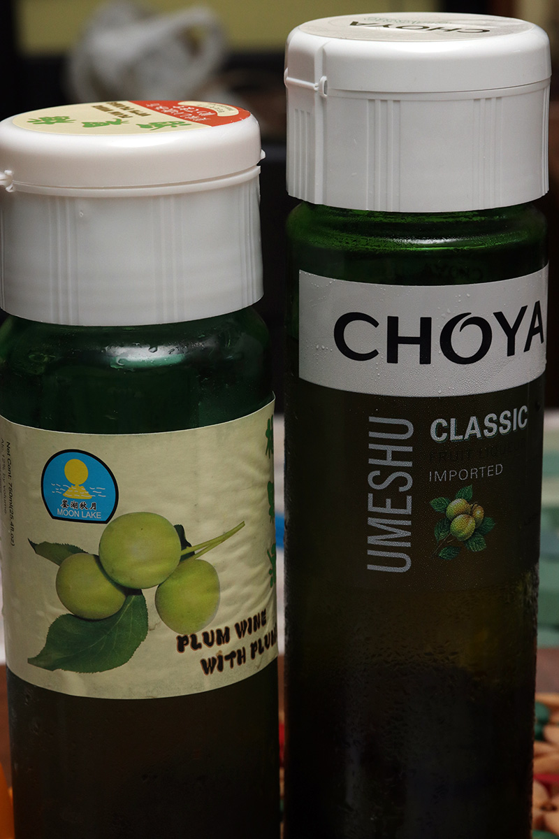 for dinner we tried the chinese knockoff choya umeshu plum wine. it was okay, but the japanese import has a more complex flavor. the chinese version tries to copy choya with its distinctive green bottle but the bottle isn't actually green, it uses a see-through green tape to make it look green. in a pinch i could see someone getting the chinese version, but who knows what other chemicals are in that one; at least with the choya umeshu you know you're getting some quality plum wine.