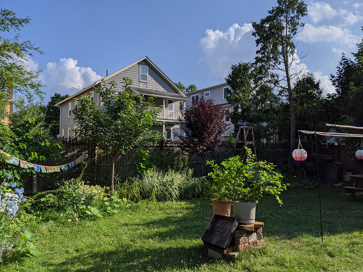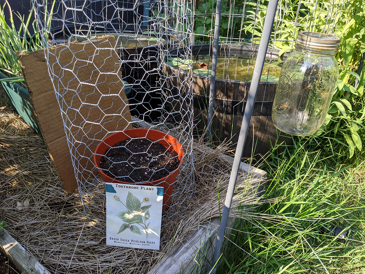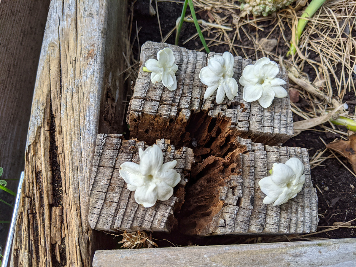 i did a lot of weeding, from the raised beds to the perennial beds. i checked the squash and cucumber plants for vine borer eggs (front a few, not too much). when i was in belmont on monday my father moved one of the jasmine plants so it was sitting on top of the unused firepit. today i got some wooden planks to expand the platform and put another jasmine plant on top, since this is the sunniest area of the backyard. i moved the A-frame ladder back to where it used to be, by the ornamental grasses. i planted two sets of zucchinis in RB4. i collected most of the foxglove seeds. i planted the toothache plant seeds maureen sent me and soaked my tamarind seeds. i planted some more cilantro in the RB4 side plot. i mixed half a gallon of Bt solution and sprayed all the squash and cucumber plants.
