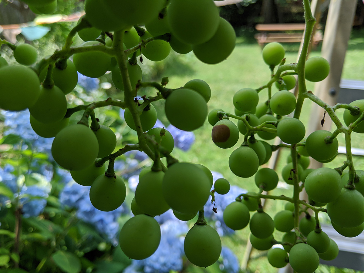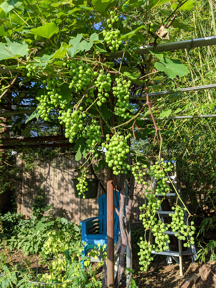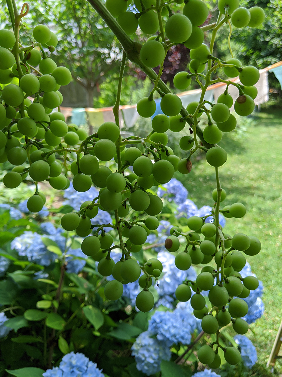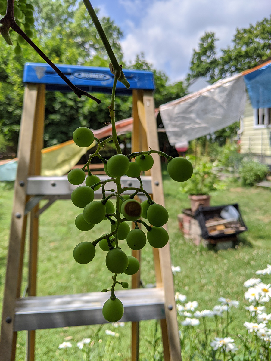 i pruned the grapevines so the grapes were directly exposed to the sunlight. i accidentally pruned off a clutch of green grapes, but that's when i saw that some of the grapes already had black spots. i then went through and careful removed any grapes that had discoloration. if the infection continues, we may need to remove all the grapes this season (not much anyway, since we gave the grapevine a major pruning back in the spring).
