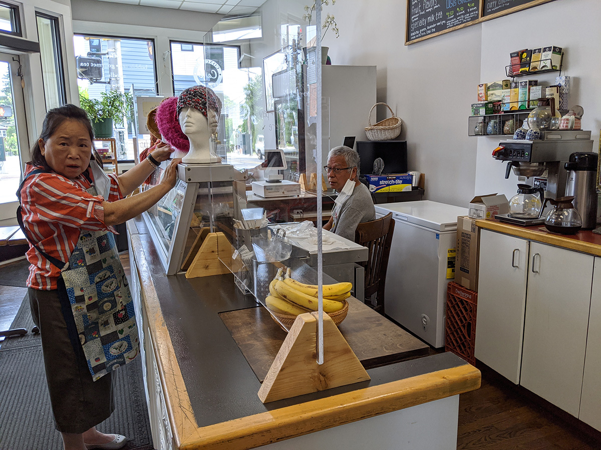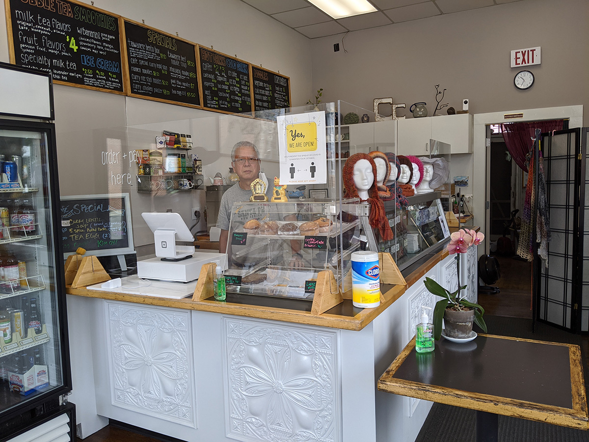 i told them that putting the cash register at the far end of the store wasn't safe. a better option would be to move the register to the front of the store, leaving the back half of the cafe for employees only. i also used the chalk markers to write on the acrylic barrier - "order + pay here" for the register and "pick-up here" for a table where they can leave finished orders. i also moved a few extra chairs down into the basement.