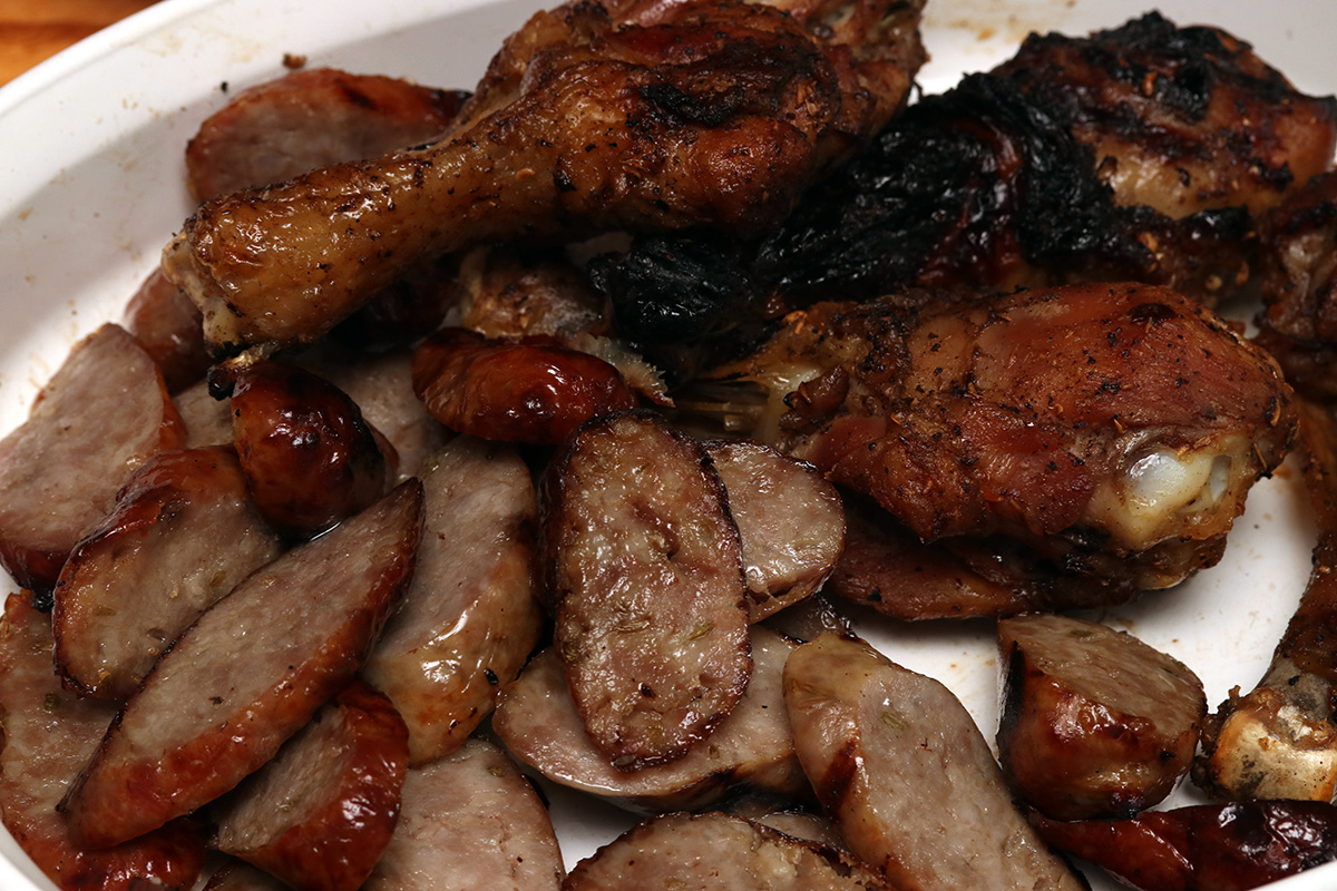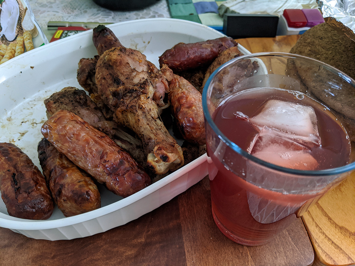 i arrived at my parents' place in the late morning with greek salad ingredients for dinner later today. i had a leftover barbecue drumstick for lunch with some suanmeitang drink.