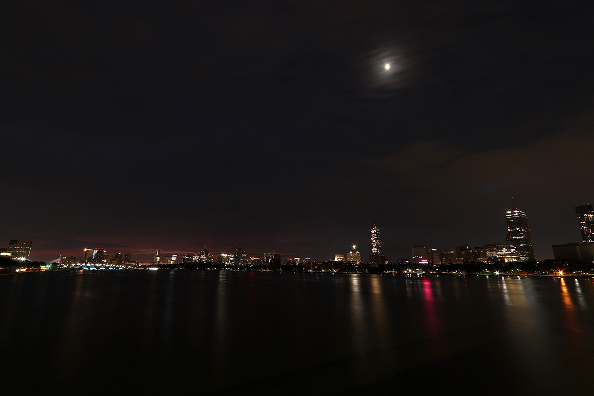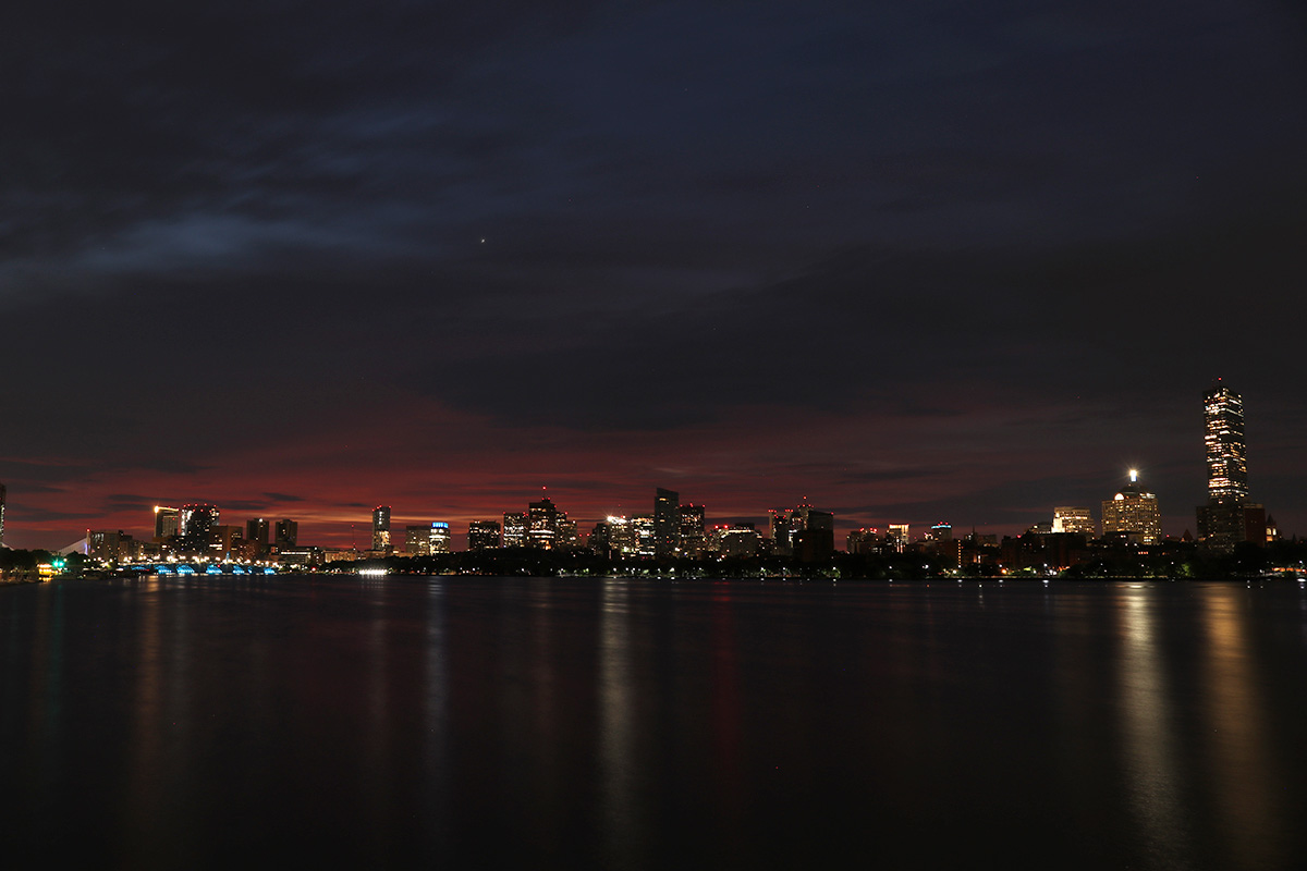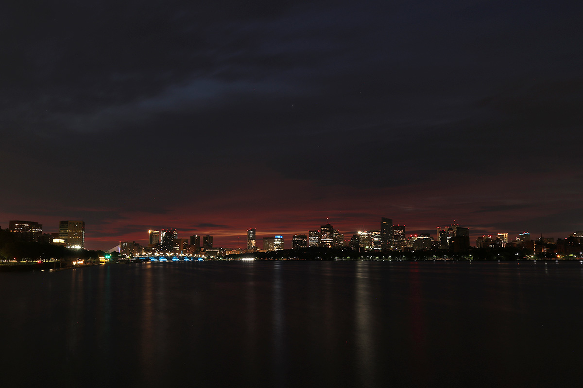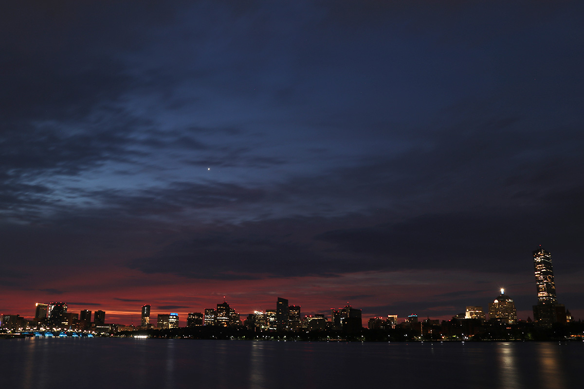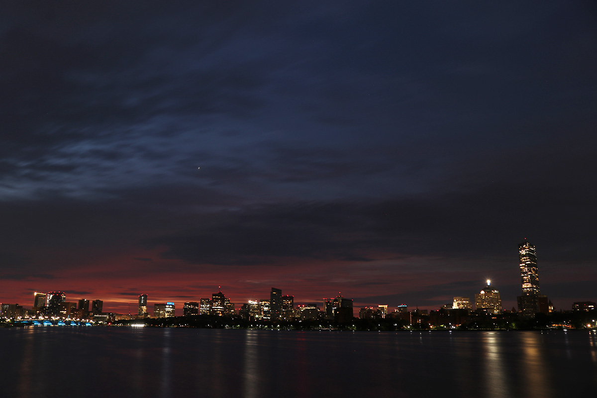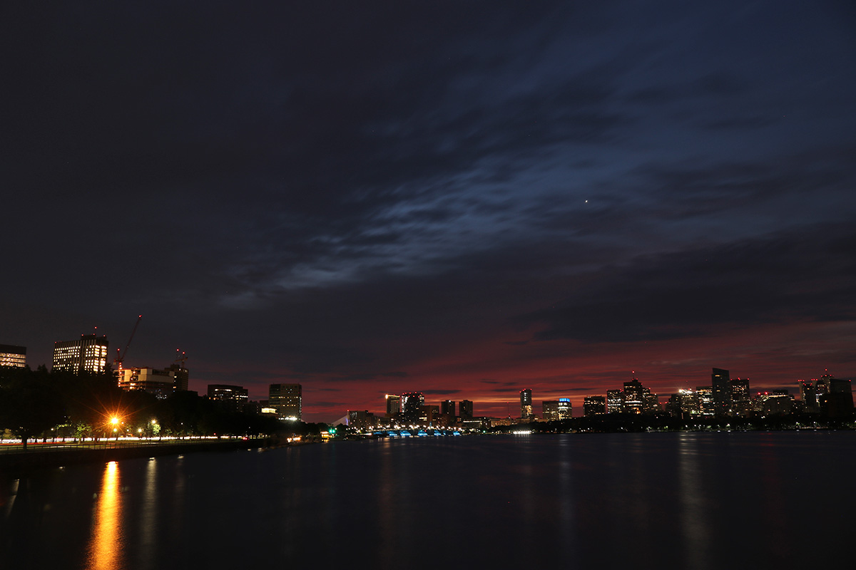 it was pointless going to sleep, since i planned on waking up at 3:30am anyway to bike down to the MIT bridge across the charles river to see if i could catch a glimpse of comet NEOWISE. so i simply stayed up, and around 3:30am i got out of bed to check the weather condition. i didn't think it'd rain, but it was cloudy, it'd be a waste of time going. unfortunately i couldn't get a clear enough view of the sky from around my house so i ended up walking out to the star market parking lot to get a better sense of the sky conditions. clouds obscured a crescent moon, but there were still patches of clear sky. i decided to take a gamble, figured i was up anyway. i gathered up my camera equipment along with the tripod and biked down to the mass ave bridge by 4am.