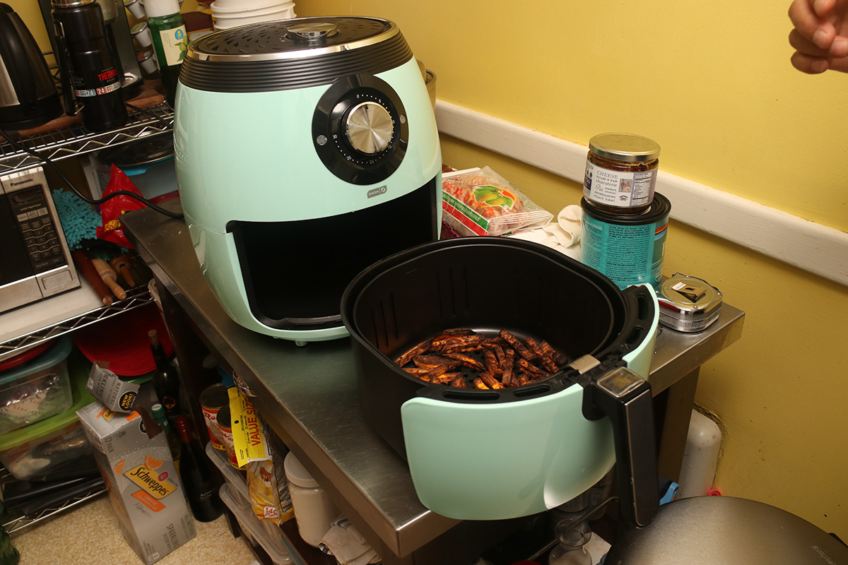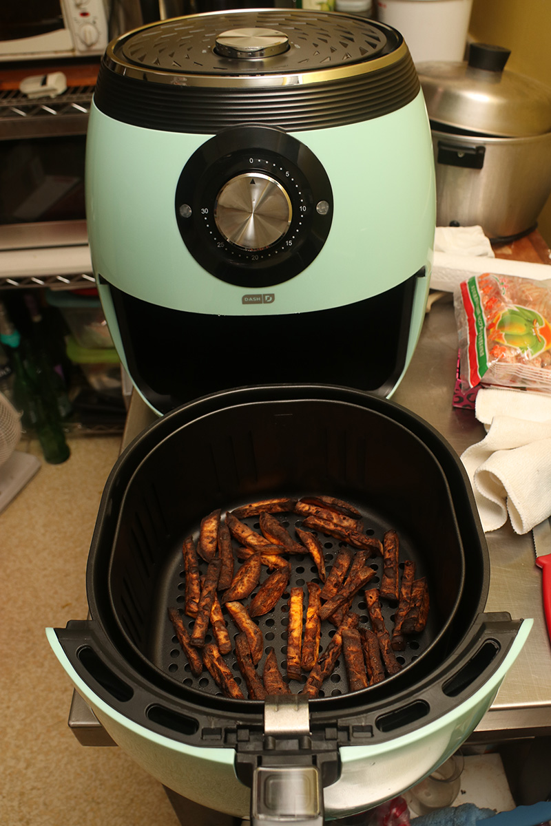 today my mother received the dash deluxe air fryer in aqua with a 6qt capacity ($80). it looked like a huge teal egg with the top sliced off, with a handle in the front that pulls out a drawer where the food goes. the controls took very easy and basic: a dial for temperature and another dial for the time, nothing like a pressure cooker with its various buttons and control settings. if i had to pick between the two popular kitchen appliances, i'd pick the pressure cooker since it seems to be able to do more.
