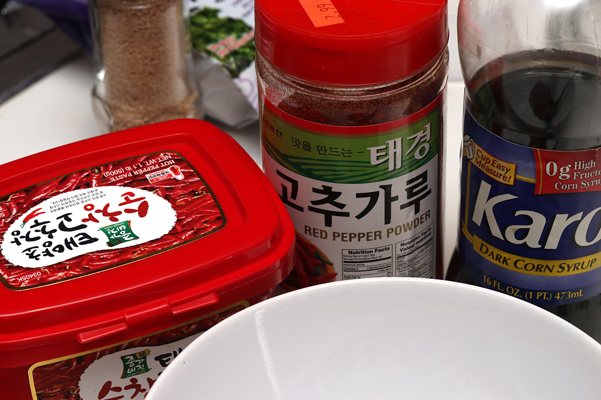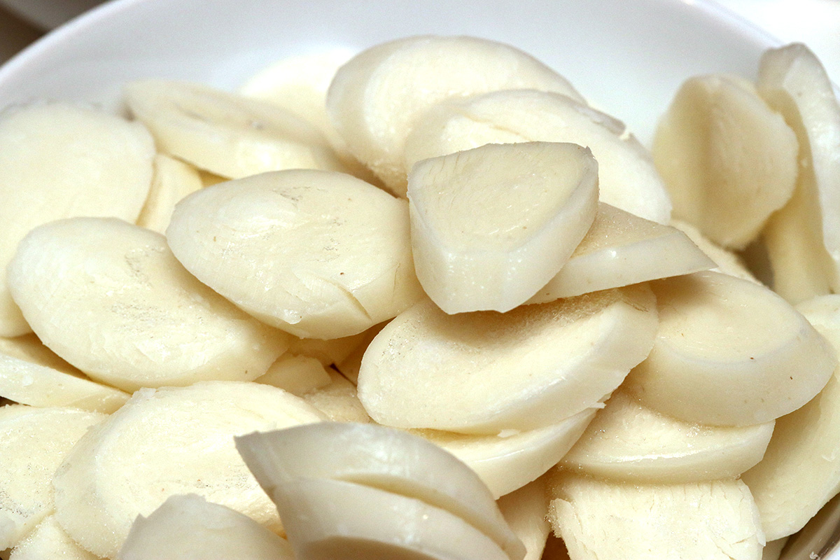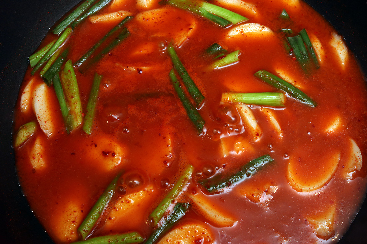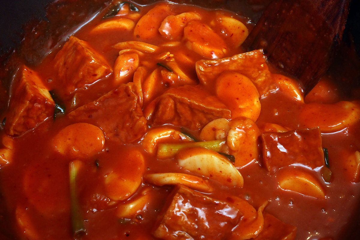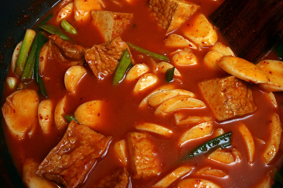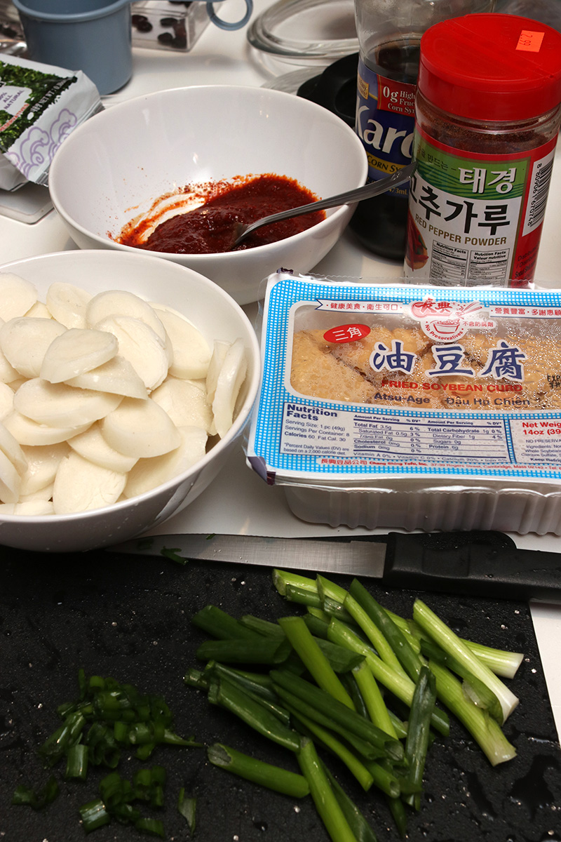 | make broth over medium heat 15 minutes combining water with hondashi and dried seaweed. discard seaweed, add hot pepper paste mixture, along with rice cakes and scallions. stir constantly to keep rice cakes from sticking to pan. midway through add tofu wedges. done when liquid reduced to shiny sauce (about 7 minutes). | |
