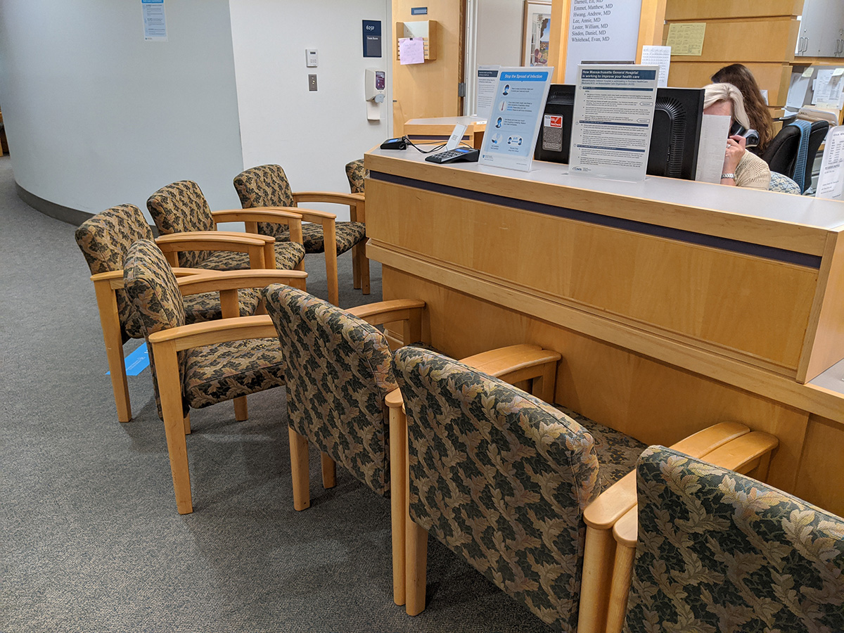 i left my house at 11:30am, bikind down to MGH for my rescheduled physical appointment at noontime. originally it was supposed to be in march but right during the height of the pandemic, so all appointments were rescheduled. i'd already been to MGH 2 days ago to get some lab work done, so i was well-versed in all the hospital procedures. after passing through the first coronavirus check downstairs in the main lobby, i went up to the 6th floor of the wang building, where another group of people with masked sitting behind a table asked me if i experienced any coronavirus symptoms. inside the main waiting room, a barricade of chairs surrounded the reception desk so no one could close. i seemed to be the only patient there.