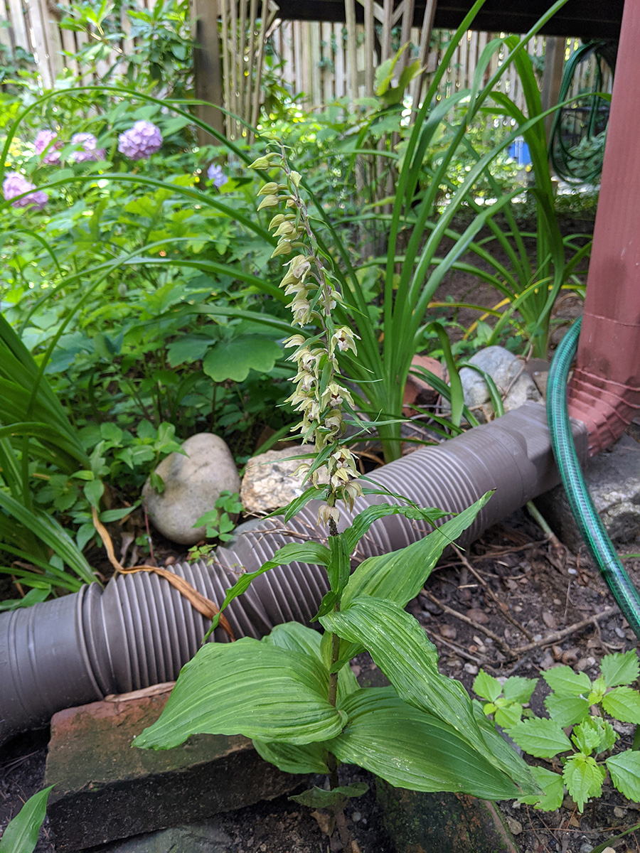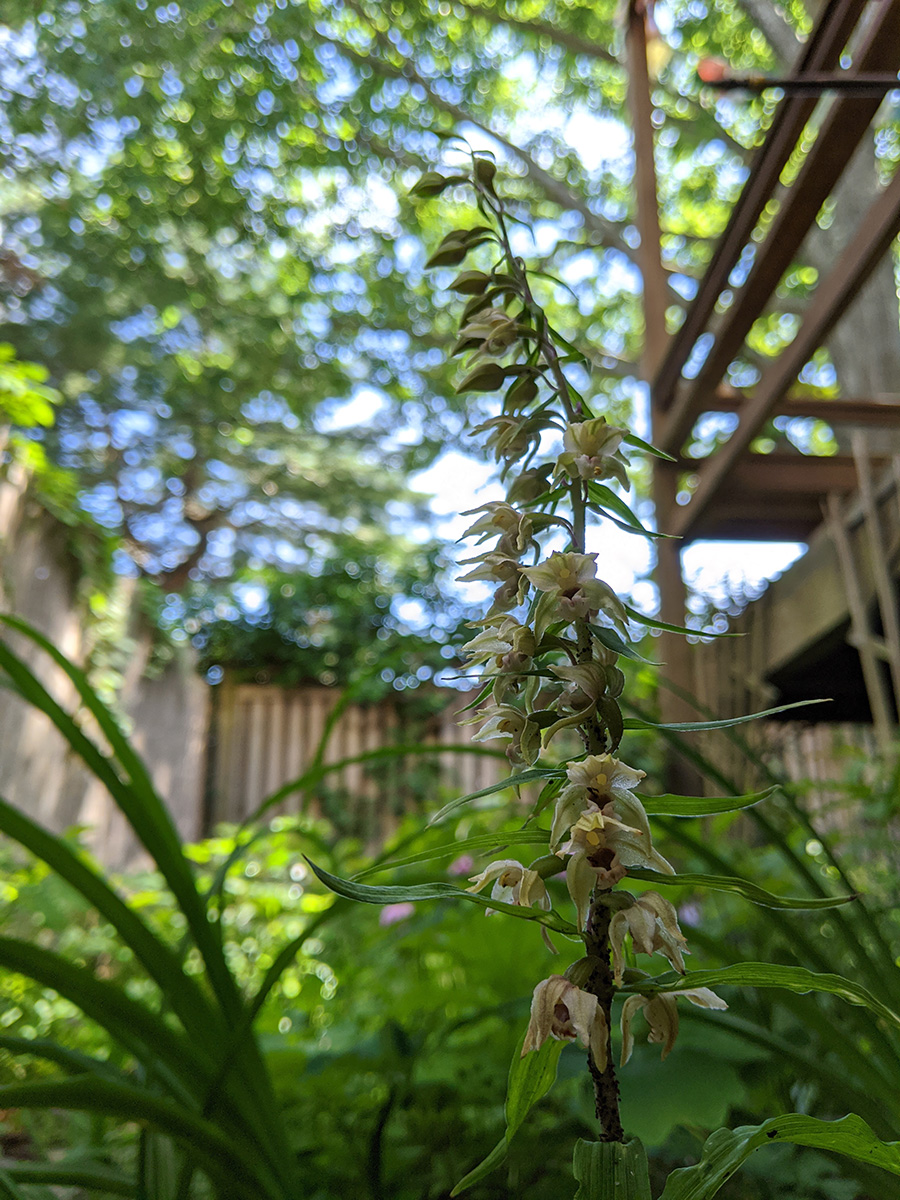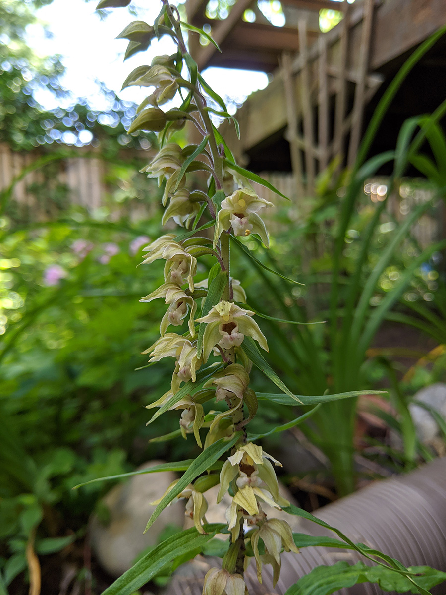 while putting my bike away, i noticed a plant in the backyard i hadn't seen before. upon closer inspection, it seems to be an orchid of some kind! weird that it'd suddenly appear, but maybe i just never noticed it before, it's not very conspicuous.