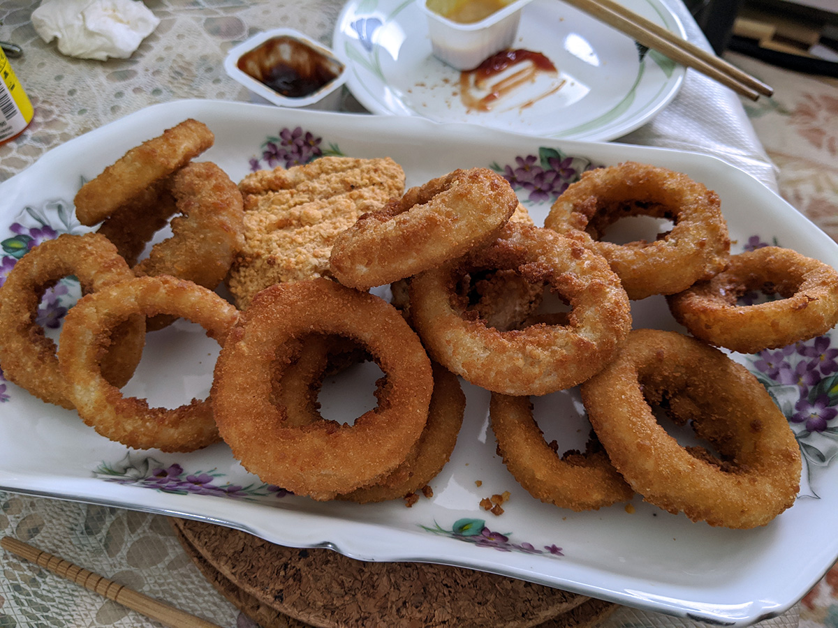 my parents tried air frying some more frozen foods for lunch: some chicken fingers (300° 12 minutes) and some onion rings (400° 7 minutes). i wouldn't mistake air fried foods for actual fried foods; even though their fully cooked and juicy on the inside, the outside still looks dry, like foods that been under a heat lamp. fortunately i'm not too picky as to how my food looks. an air fryer is definitely convenient, even if it does take up a lot of countertop space.