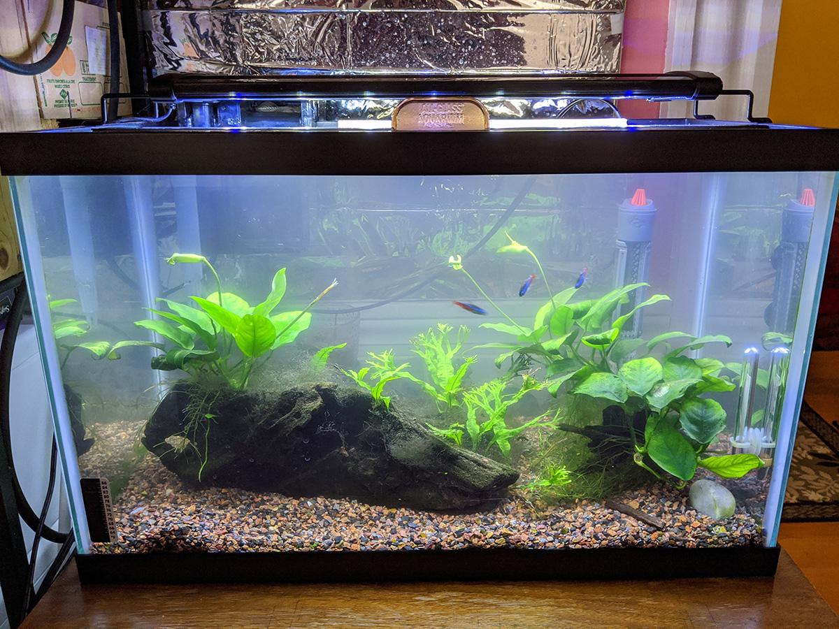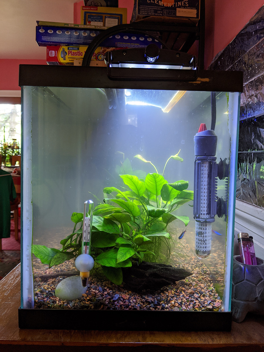 it took me 1-1/2 hours to clean the tank. nothing fancy, wash the hagen aquaclear filter, replace the activated carbon, pull out any hair algae, scrub the algae off the glass with a magic eraser (a trick i only recently discovered), siphon out a bucket of dirty fish tank water (1/3 tank), replace that with treated water, use the dirty water to feed the plants. at one point i thought my infrared thermometer was broken because the tapwater was reading the same as everything else in my kitchen, temperature in the mid-70's. i even replaced the battery. turns out that's normal, the temperature of tap water in the summertime on a hot day is the same as room temperature. that's good to know, no need to do a temperature check when i replace the water.