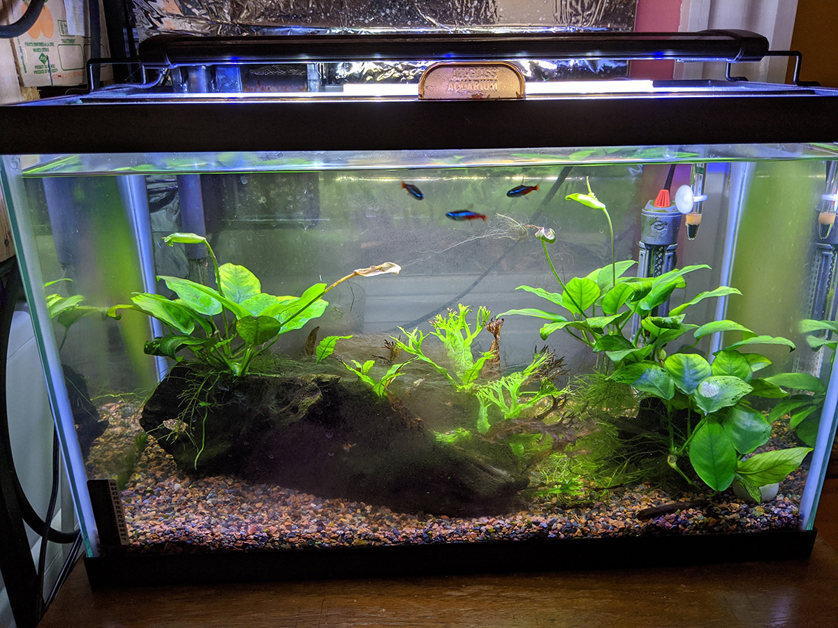 in the meantime, it gave me a chance to clean my aquarium, which hadn't been cleaned since mid-may, more than 2 months ago, it didn't seem that long ago. all my big ideas of more frequent water changes to curb the spread of hair algae was just hype. i would've put it off even longer were it not for the fact that when i was feeding my fish this morning, i noticed there was only 3 tetras now (from an original of 11 back in september 2017). when i looked around for the others, i saw a dead fish tangled in the roots of one of the aquatic plants. when you have dead fish in the tank, that's a good time to clean.