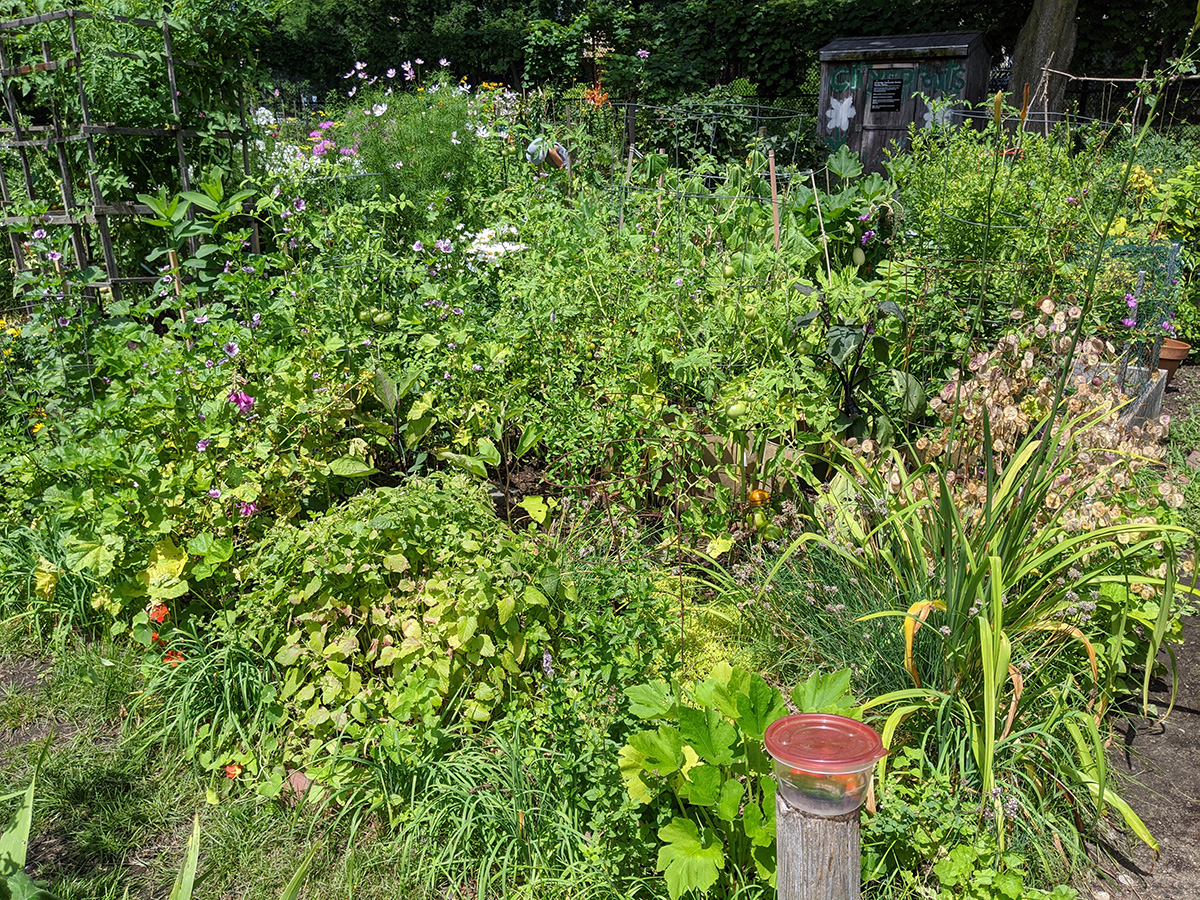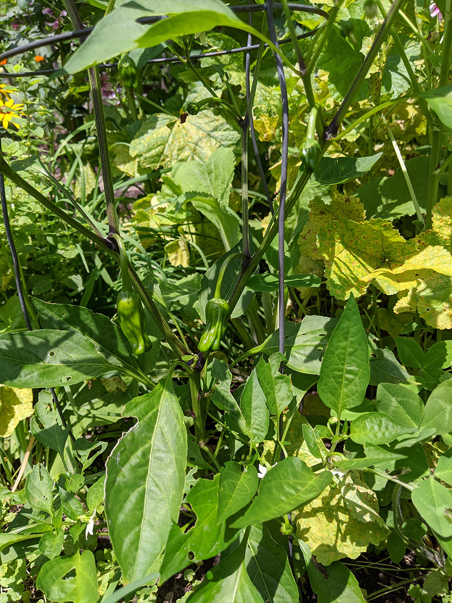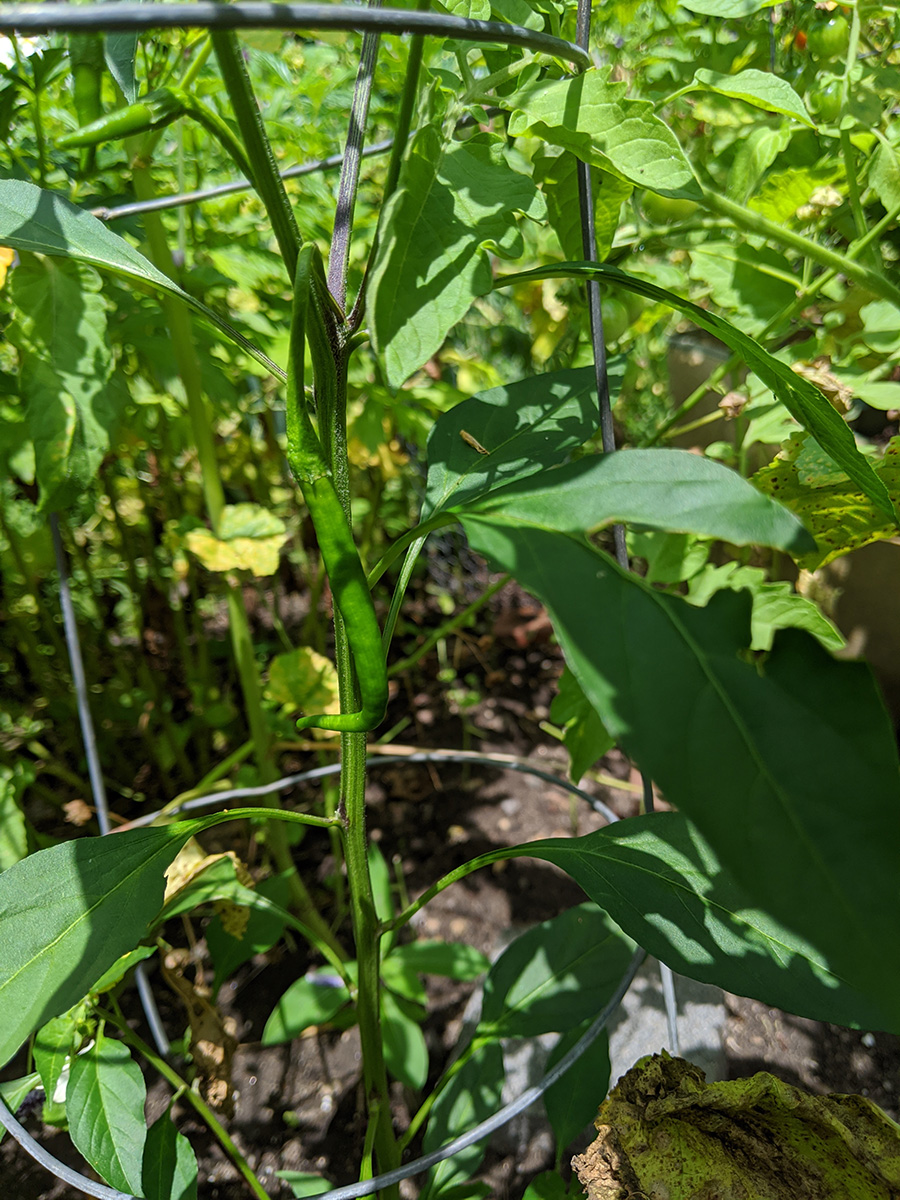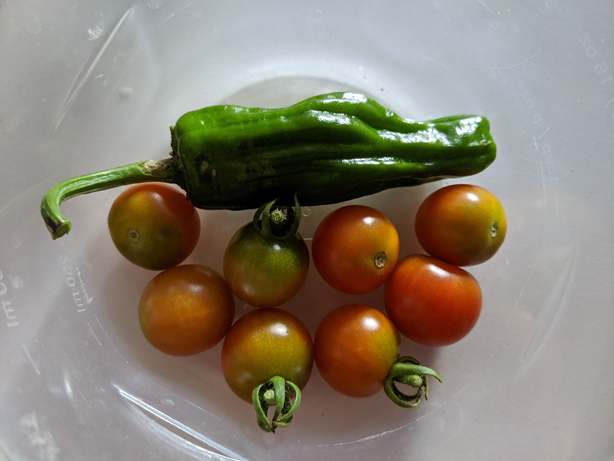 i went down to the community garden this morning: not to water but to pick some ripe cherry tomatoes and shishito pepper i saw when i came a few days ago. the air was already soupy, quite uncomfortable to be outside. i thought i was the only person crazy enough to be in the garden but there was one other gardener. after i picked my tomatoes and pepper i quickly returned home.