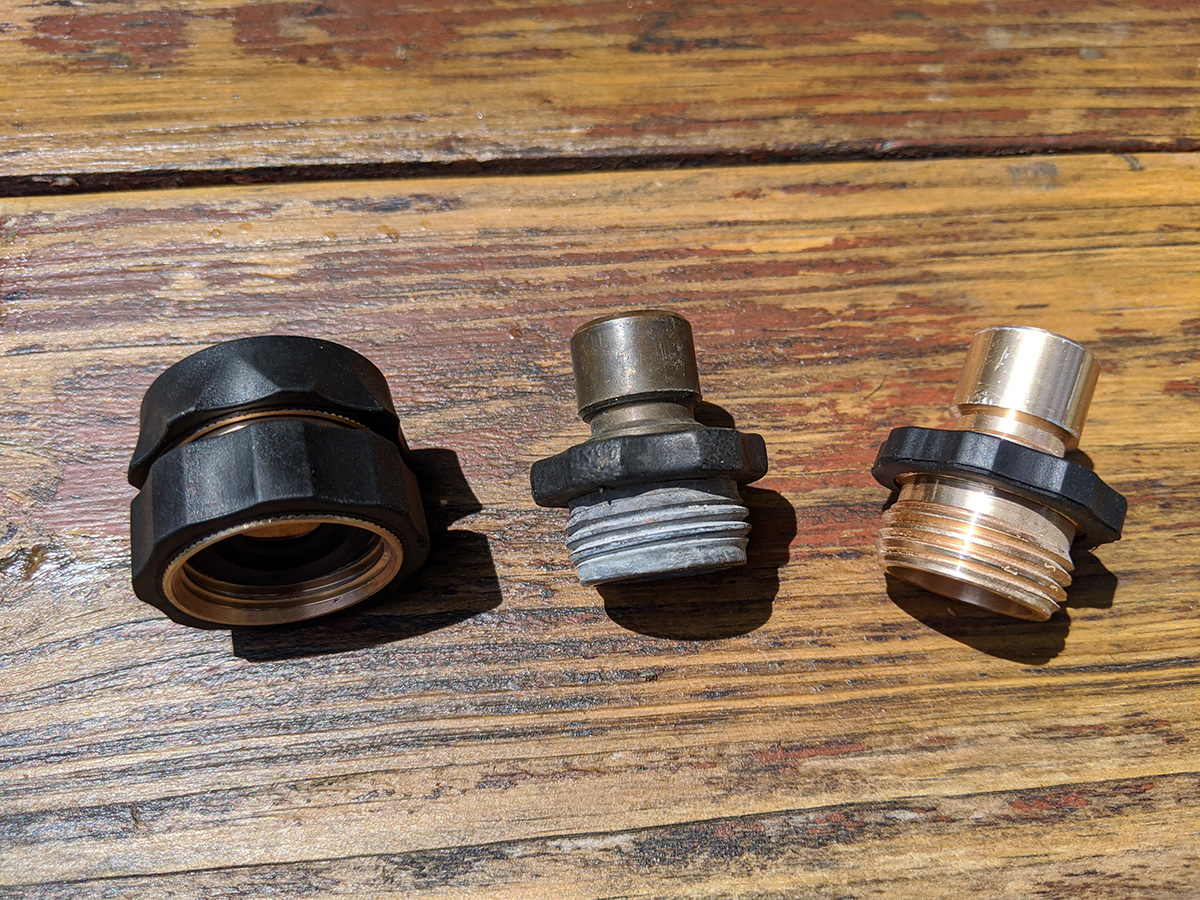 my parents were in framingham for a 11am acupuncture appointment for my mother with a taiwanese specialist recommended by my godmother. i found the newly arrived quick connector hose fittings outside, my father had already installed most of them. the only good thing i can say about them is they're new. material and quality-wise they seemed inferior. instead of real brass, they were simply brass-coated aluminum, so they felt substantially lighter than the real brass fittings we have. regardless of what they look like and the quality, they still work. though it is obviously a "you get what you pay for" example.