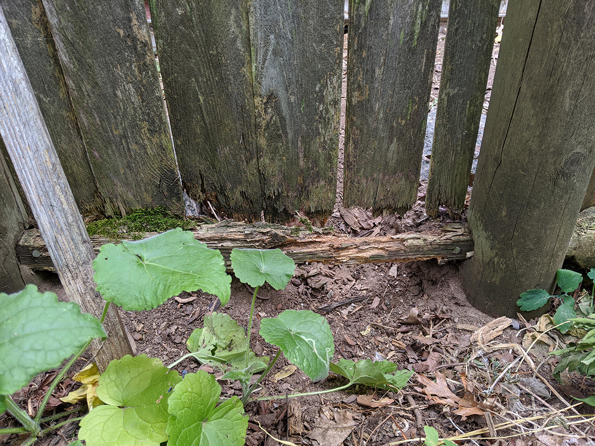 later in the afternoon i rushed outside when i saw a woodchuck eating the squash plants. i chased it to the corner of the yard where it disappeared. i thought it was hiding underneath a pile of wood until i noticed the hole underneath the fence.