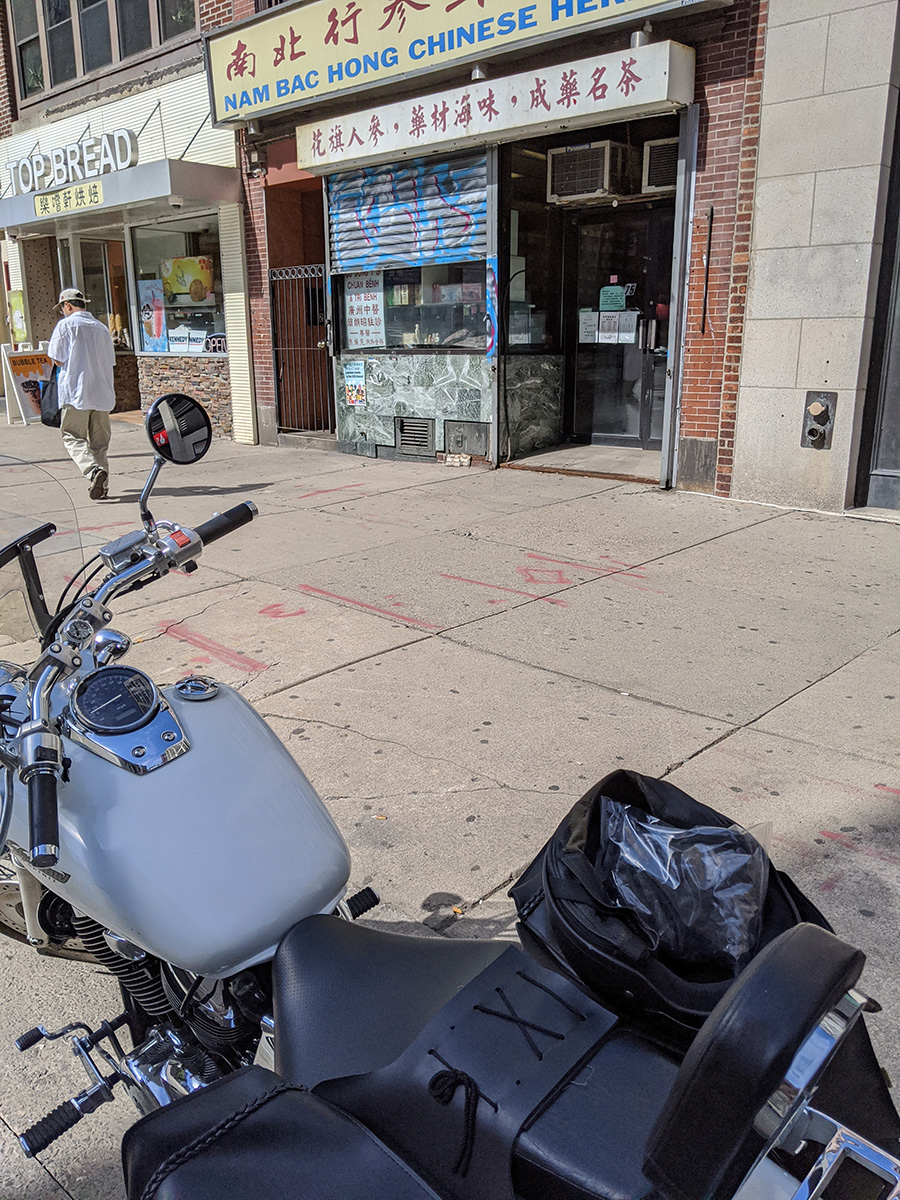 i got to ming's market by 9:37am. i don't remember ever being there so early, everyone seemed to be busy restocking the shelves. i searched the dried herbal aisle but couldn't find smoked plums. after paying for my groceries and stuffing them into my saddlebags, i rode 2 blocks to super 88 (c-mart). there was parking congestion but i pulled into a small spot just big enough for a motorcycle. later i discovered there were plenty of empty parking, but hard to see from the street, and there was nobody there to help direct incoming traffic. super 88 also didn't have smoked plums. i called my mother with the bad news. normally she'd tell me not to bother, but the fact that she didn't meant this was important to her. i told her i'd ride into chinatown proper and visit a chinese medicine shop, which should have them.
