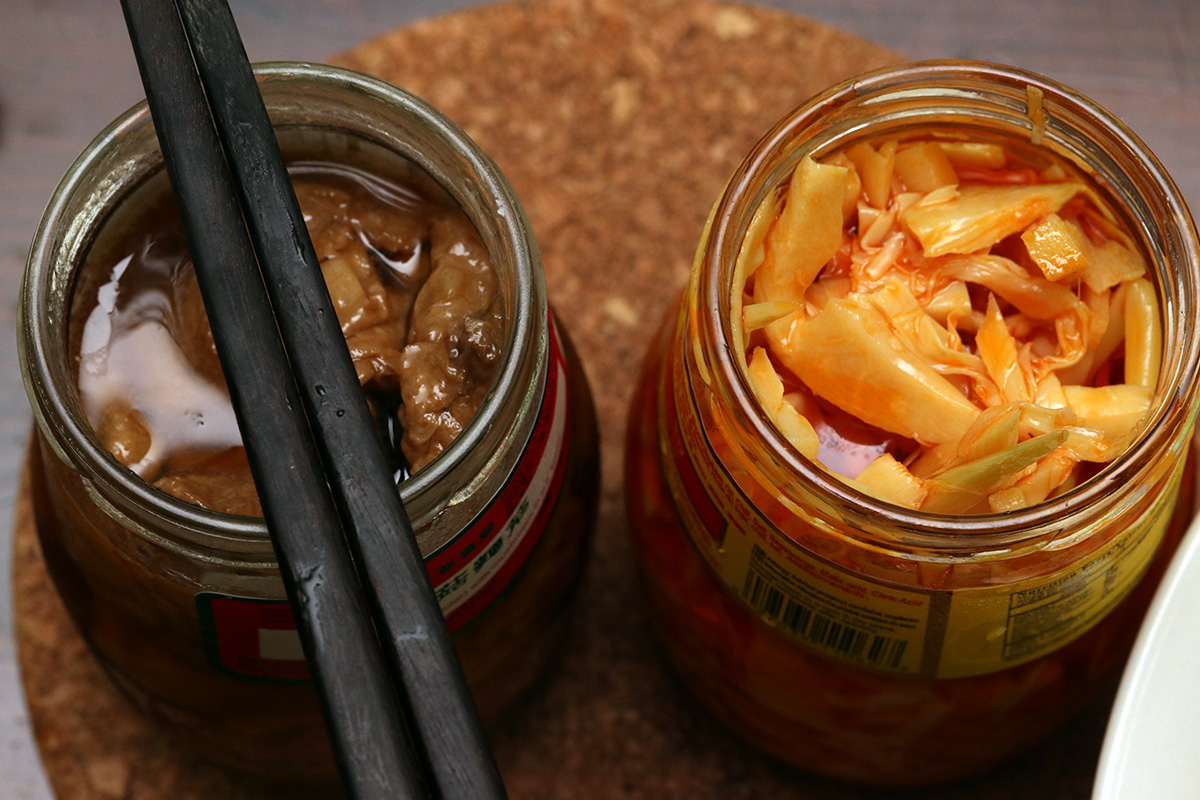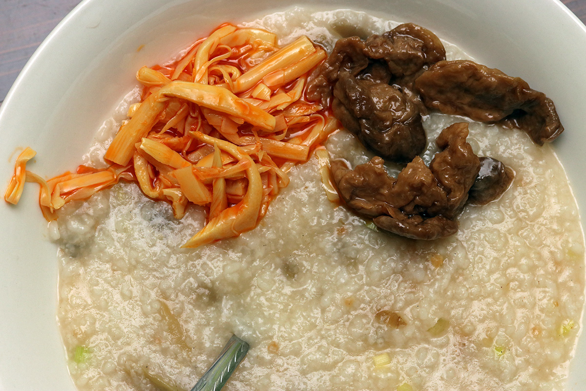 i decided to make some rice porridge with the leftover rice i had in my fridge. while that was simmering, i took a shower. i don't eat a lot of rice porridge here at home, but back when i lived in chongqing it was a dinner staple. that's just because there are a lot of side dishes to find where i lived, but here not so much. i made some pretty savory rice porridge if i recall, i'll need to dig up my recipes, or at least look at some photos to see what kind of stuff i put in. my final rice porridge for tonight had a weird consistency because i was using partially cooked rice. i also added some pickled mustard greens, some fried shallots, some scallions, and a bit of minced ginger for flavor. it tasted pretty good all by itself despite the weird consistency. i used 4 cups of water based on my mother's advice, but had to add an extra cup when the porridge started to look a little dry. i ate it with some pickled bamboo shoots and chinese glutens.