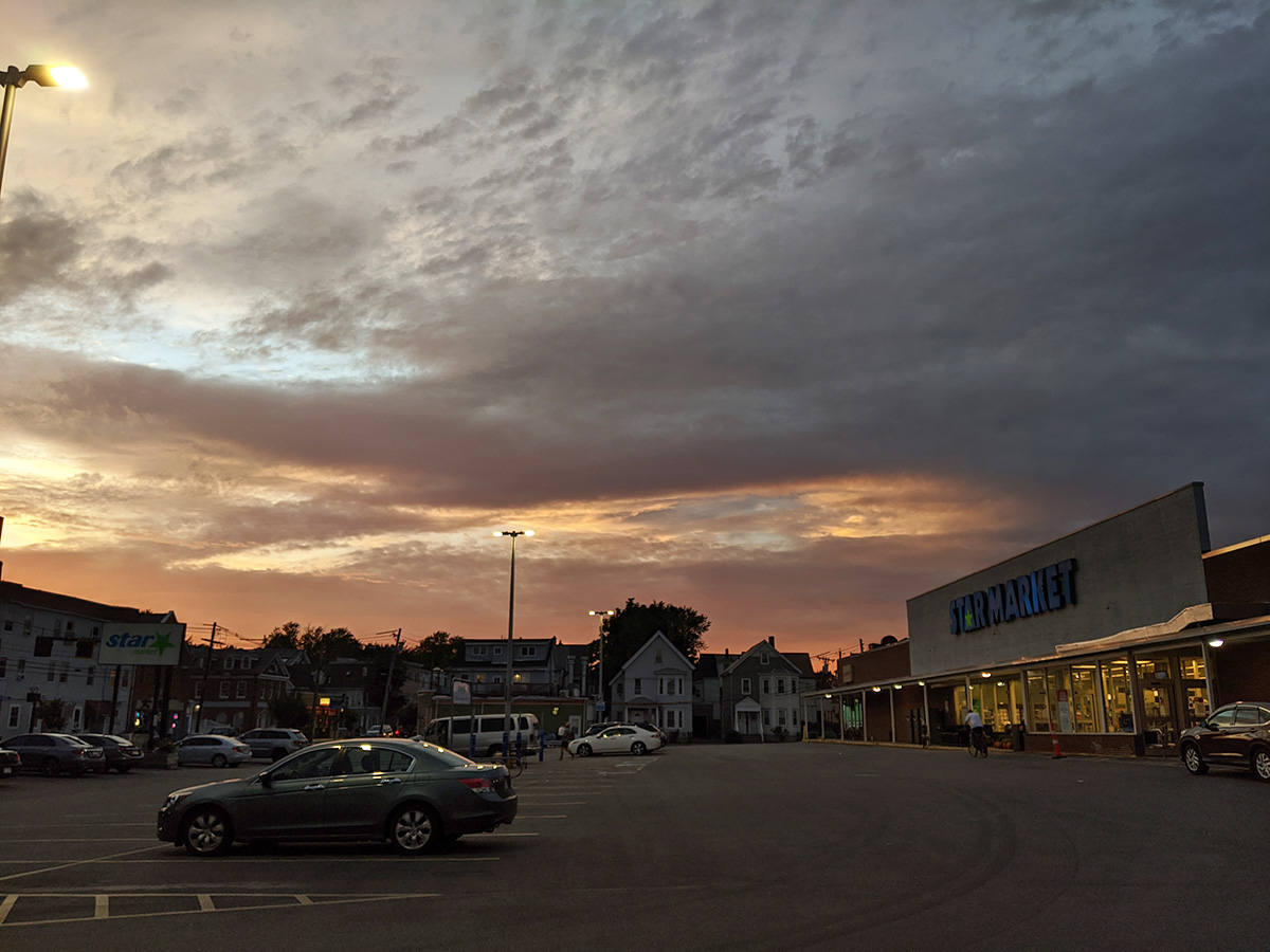 i could've stopped at 7pm but i cleared a few more cases and finally quit by 7:15pm. i rode the bike (i was still on bike at this point) to the star market parking lot so i could admire the sunset.