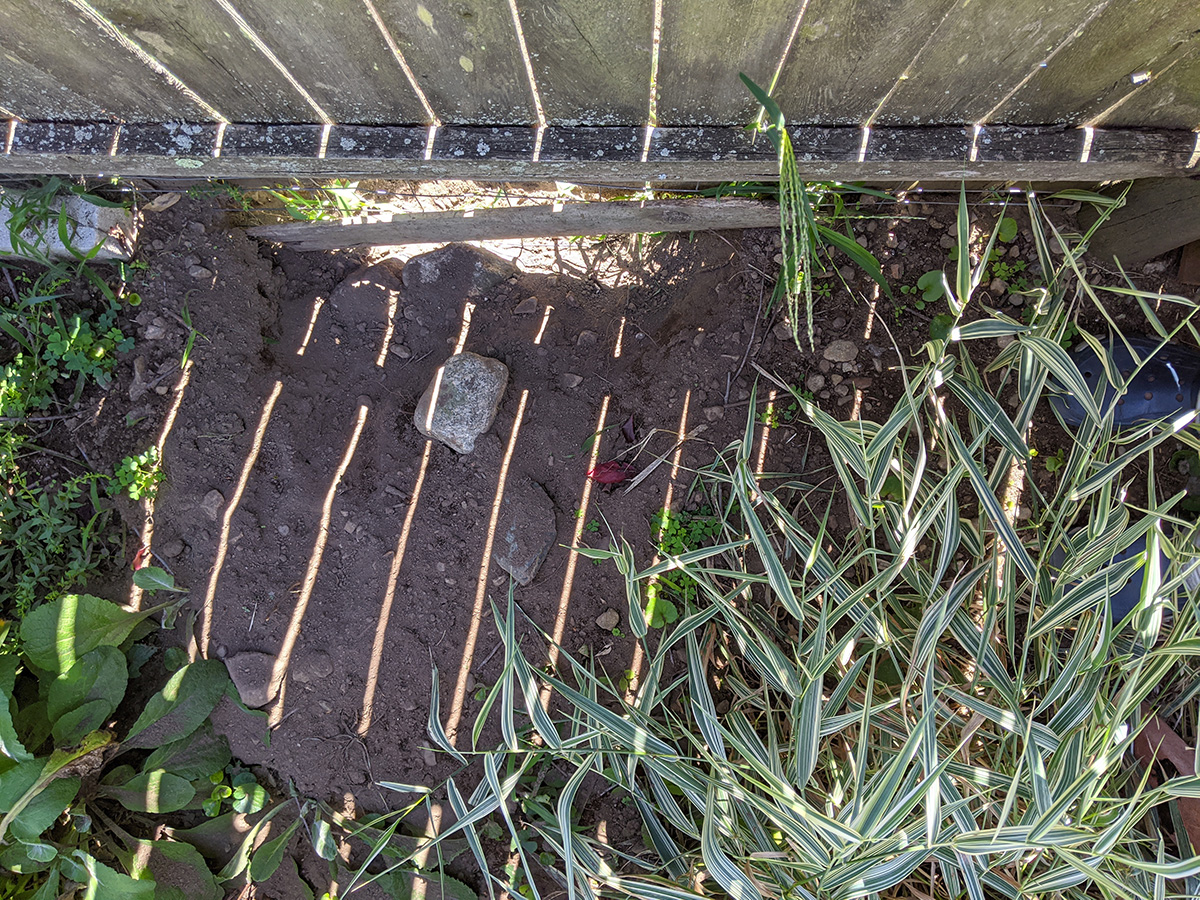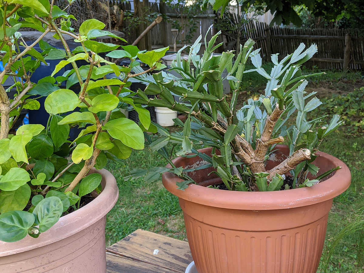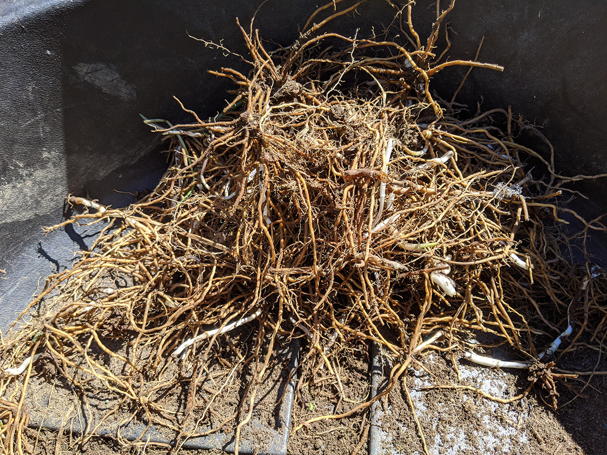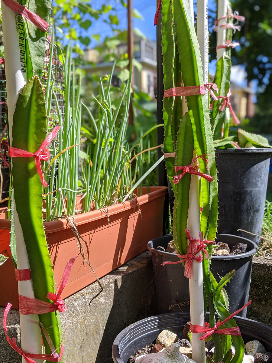 in the backyard, i didn't see any woodchuck damage, but a part of the fence looked like it had been dug from our side of the yard. later my father spotted another new hole, i think the woodchuck used that hole to return to its den. we ended up blocking that hole with some more bricks. we planted the chrysanthemums, one in the front yard on the western side of the house, another in the backyard, between our two flowering trees. i cut back all the ornamental grass and we dug up that whole area. mixed in with the ornamental grass are spiderwort roots. they look similar, but the grass roots look more fibrous and resemble bamboo roots (something i'm intimately familiar with) while the spiderwort roots look like chow mein noodles. we threw out the ornamental grass but saved the spiderworts, replanting everything along with the chrysanthemum. i also helped my father prune his dragon fruit cactuses. later we planted the hop plants, applying some rooting hormone beforehand.