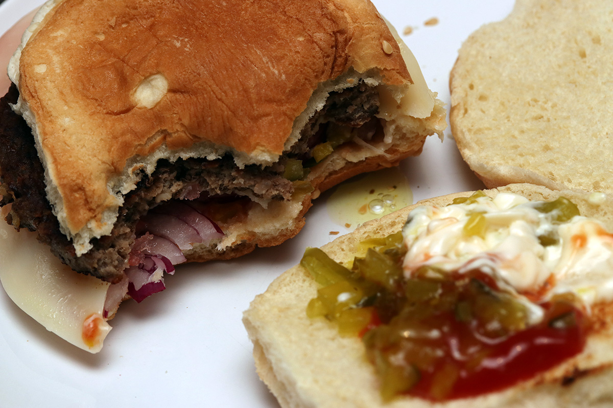 after a shower, i made dinner. i remember i still had half a container of bruce's fish stew that i warmed up on the stove. while that was going on, i grilled two hamburger patties on the foreman to make a pair of hamburgers. i think it would've been more economical to roll my own patties, but frozen patties are much more convenient. i downed 2 cans of seltzer, then later a mango popsicle.