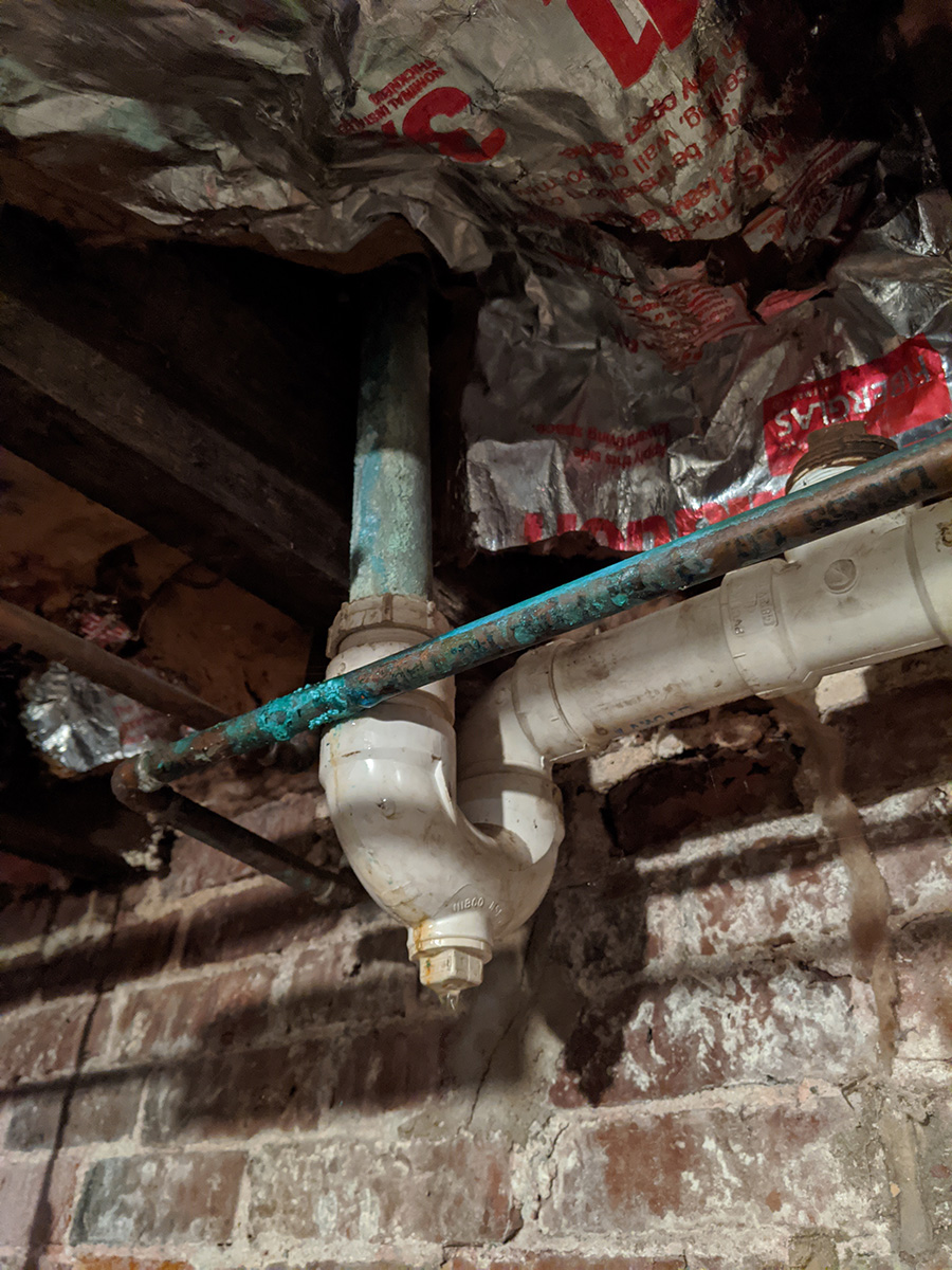 so i shut off the water supply to the leak pipe. originally i thought it was for the hot water but turns out it was the cold water for the shower and the toilet. it's not a big deal, because i normally don't even turn on the cold water when i shower, since i have the hot water adjusted just right. the only annoyance is the toilet doesn't work now, but i can still flush using a bucket. dripping from my bathtub must've dripped down onto the copper pipe and corroded it. when i took the pipe, i could see a fine mist of water coming out, i'm just glad it didn't completely burst. the pipe itself seems easy enough to fix with some DIY plumbing, but i feel like i want to get a professional involved, to fix a few other plumbing issues, like a leaking shower/tub diverter, low hot water pressure on my sinks, and replace a few shutoff valves. and while that's happening, might as well replace my hot water tank, since it's already at the end of its service life (12+ years old) and makes scary sounds in the basement that i can hear from upstairs.