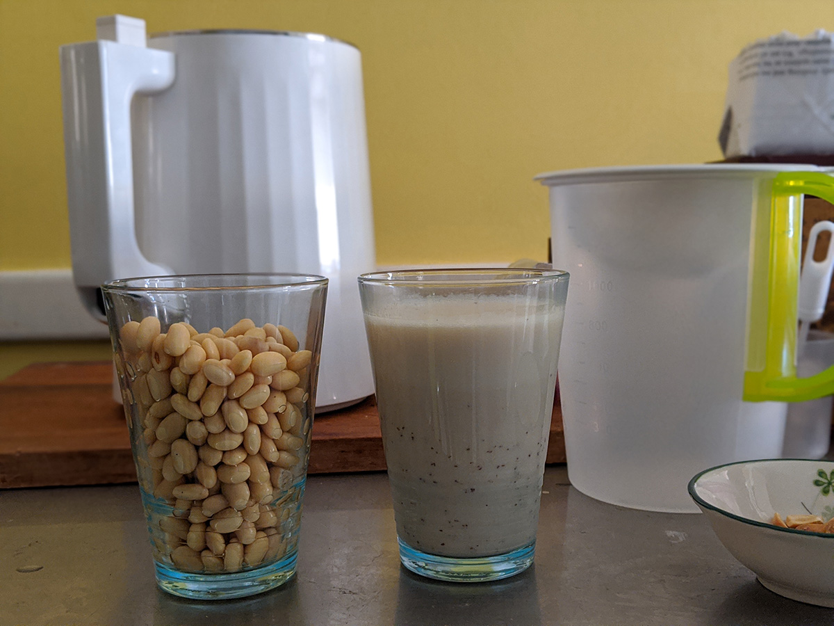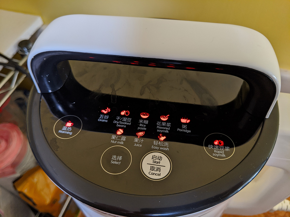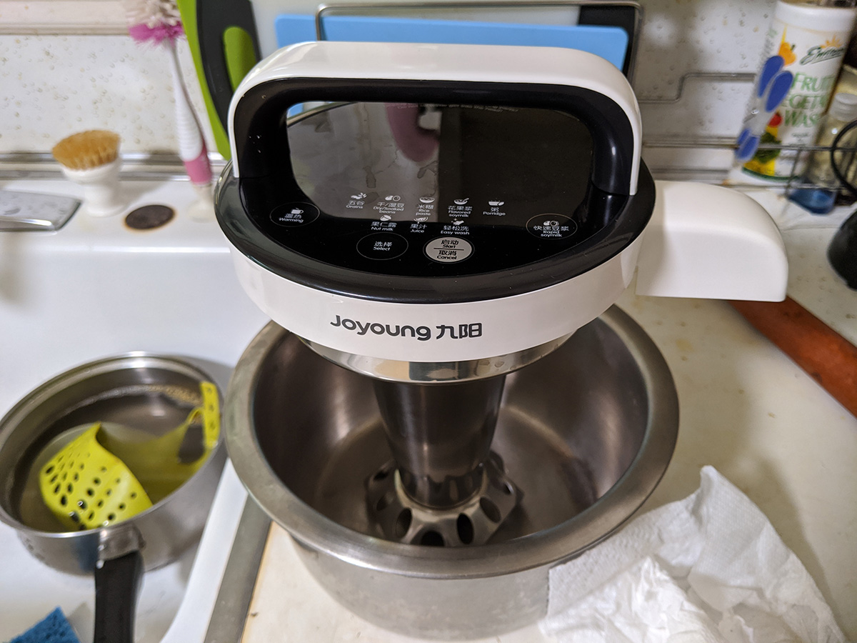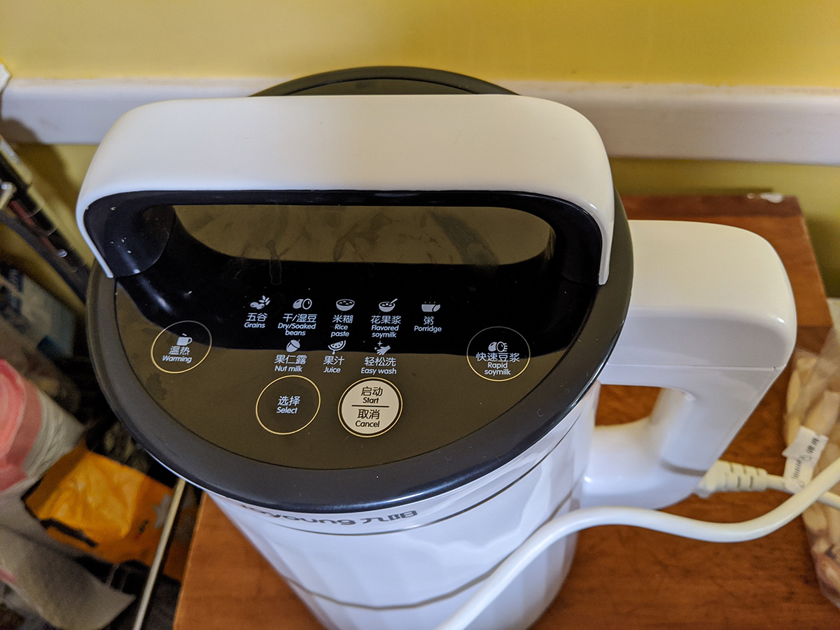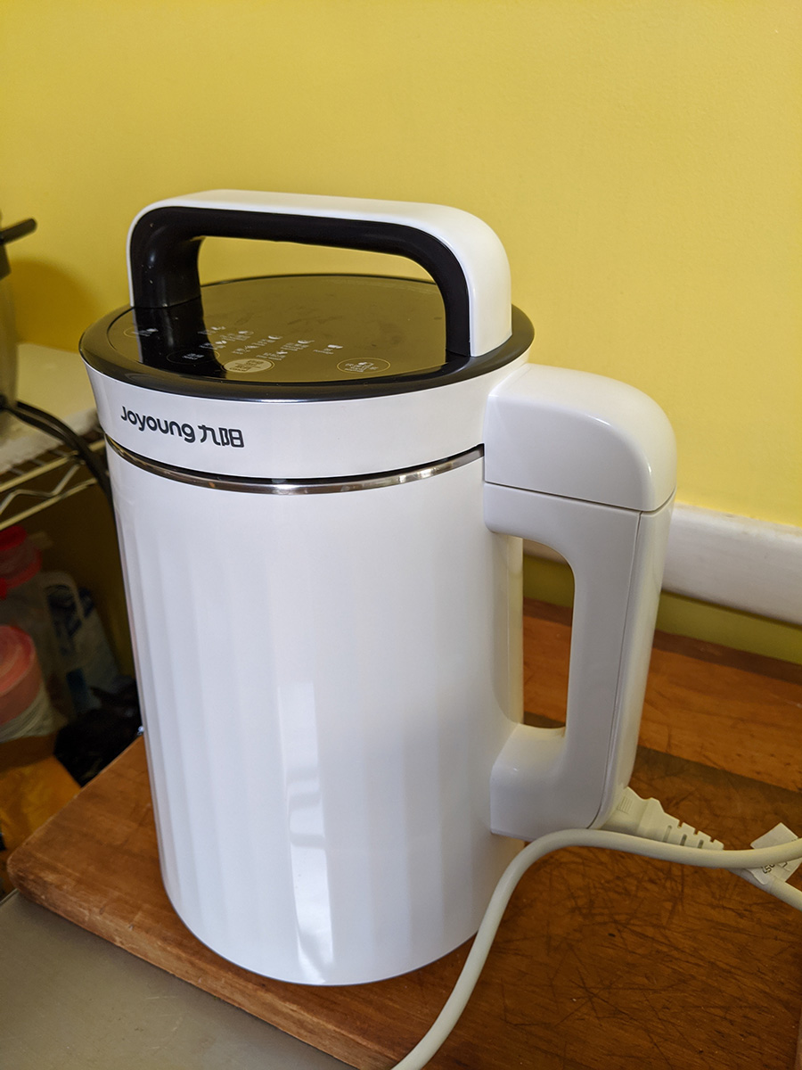 i got a chance to try some fresh soy milk. my parents had some waiting for me, a combination of soy beans and chinese red dates (jujubes). i could taste the sweetness and fragrance of the jujubes, but after i stirred it, the sediments on the bottom obscured the taste of the dates. my father whipped up another batch, this time a combination of soy beans and roasted peanuts; it tastes more of peanuts. soy beans have a very faint flavor that can easily be masked by other flavors. as for the joyoung DJ13U-G91 soy milk maker, it seems to be a very well-built machine. the thing that surprised me is how heavy the lid assembly is, which also contains the motor that drives the blender and microprocessor that controls the heating and cycling. it came with 2 lbs. of complimentary soy beans that arrived in a separate box, from an american company called laura soybeans. their prices are much cheaper than elsewhere ($12 for a 5 lbs. bag, with a $4.95 flat fee shipping), and their beans are advertised as 2019 crops, still yellow and vibrant, unlike the ones my father got in chinatown (though the chinatown soy beans are much larger). while searching online, i found an even cheaper place (also US based): soypro sells 10 lbs. for $35 (10 lbs. for $22) with free shipping.