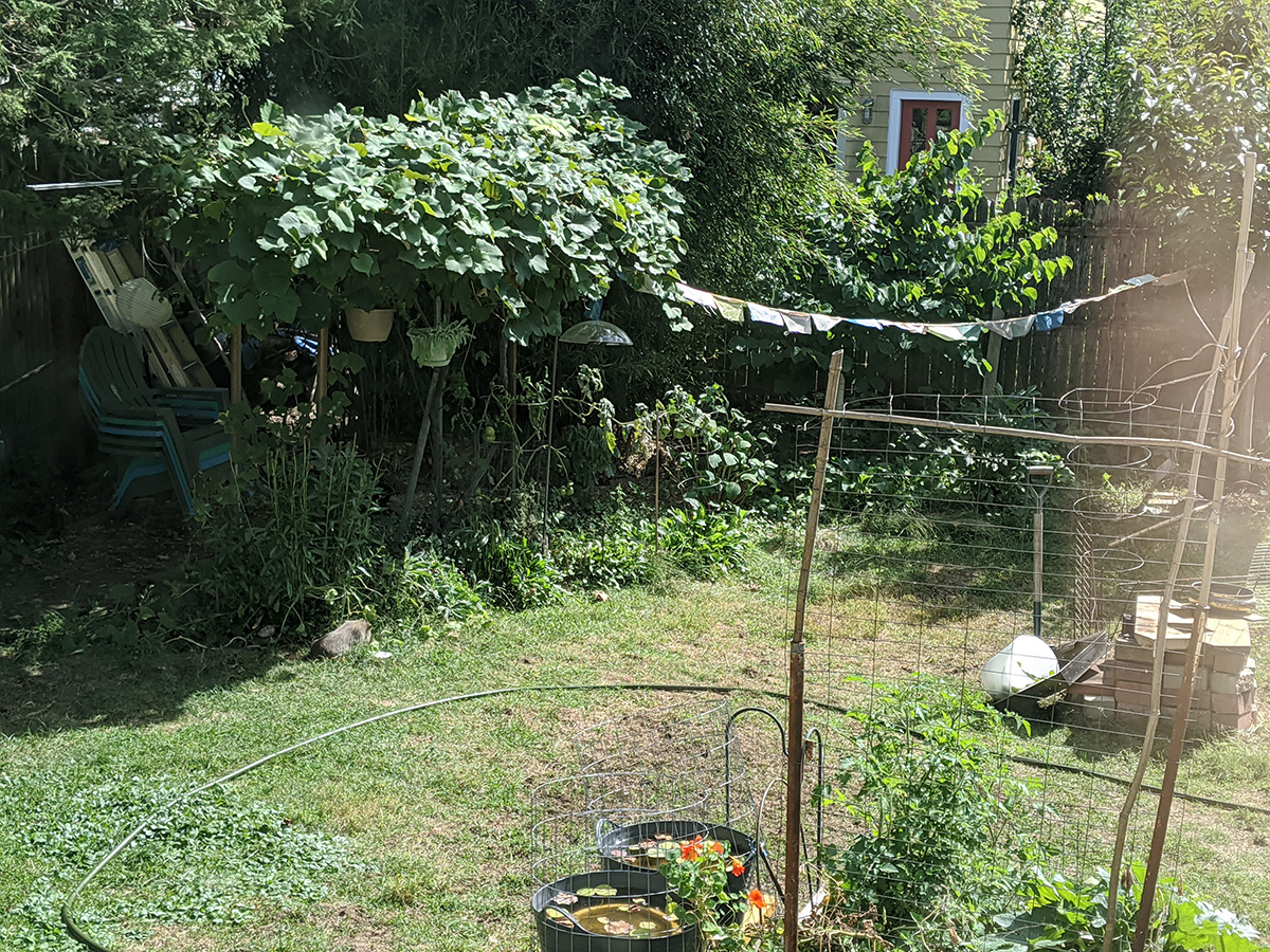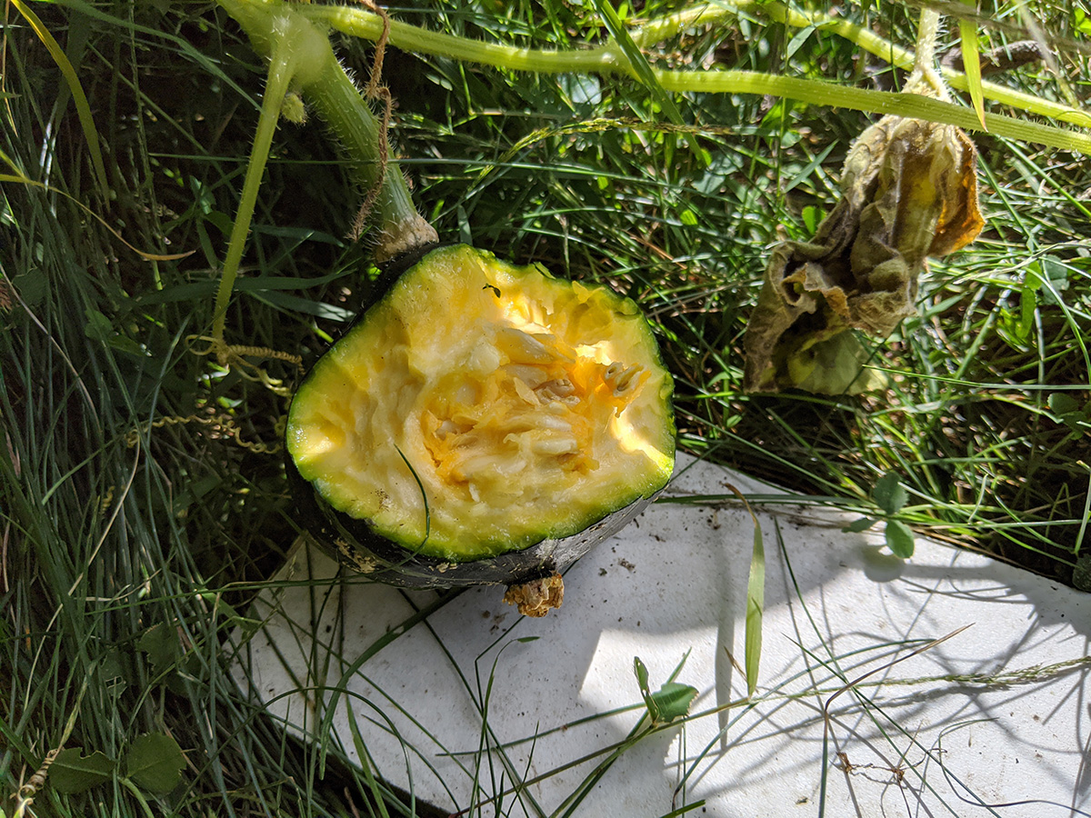 while eating lunch, i looked outside into the backyard and saw a groundhog eating something. by the time i went out it was gone. i did see a new gap underneath the fence, it looked a bit small to fit a groundhog, but it had to have escaped through there because i searched everywhere in the backyard and couldn't find it. i put two bricks in front of the hole to seal it temporarily. as to what it was eating, it ate half a small buttercup squash.