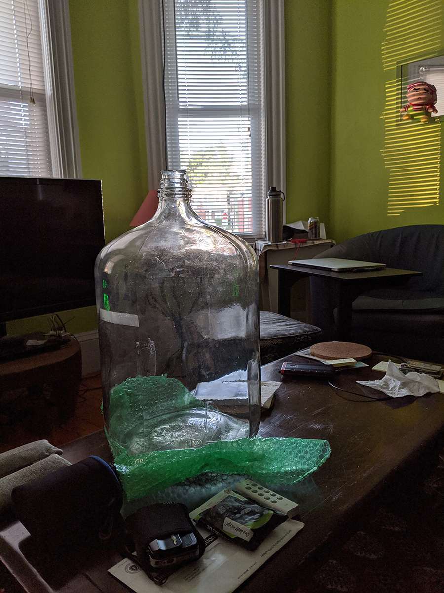 so i headed back and found the carboy still on the curb. i made sure it wasn't smashed (looked brand new, even had some bubble wrap at the bottom so it wouldn't scratch or crack the base) and carried it back home. it weighed about 14 lbs. i must've looked awfully funny, carrying this large and heavy glass container around the streets of cambridge, ever once in a while shifting how i carried it once my arms grew tired.