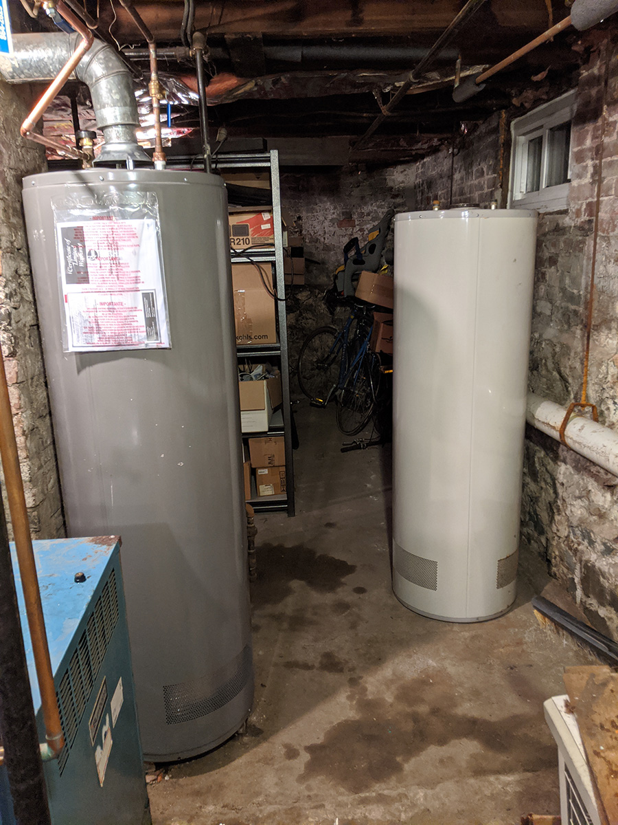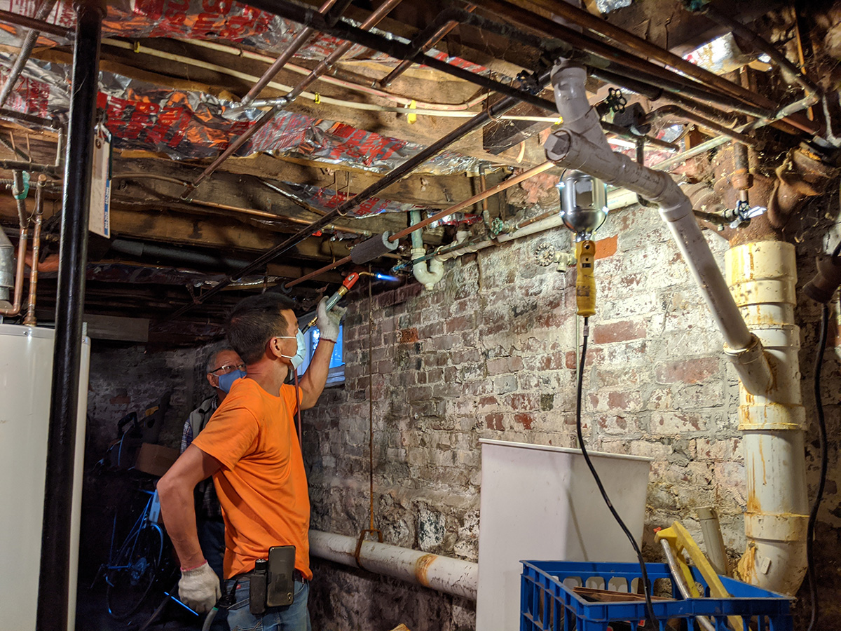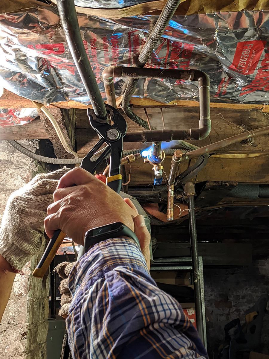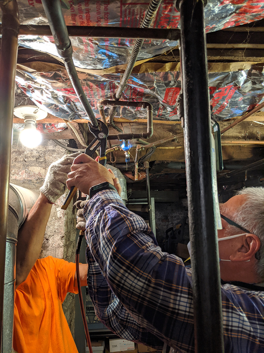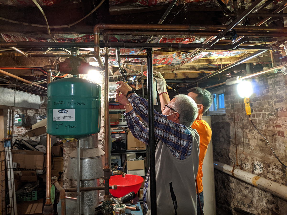 around 5pm my father called me. i had a hunch as to why: xiaowu said he could come over now to install the hot water heater. my father arrived at my place first, xiaowu a short time later. we went directly to the basement, where after diagnosing the problem, he started working. while my father and i worked to drain the old hot water tank using our portable pump, xiaowu replaced the corroded section of copper pipes and changed out a few rusty valves. he worked fast and seemed almost careless with his acetylene blowtorch, i few times i was afraid he was going to set the house on fire, or at the very least melt through some plastic pipes or cables. he's more of a rough and tumble installer, not a lot of finesse, but he gets the job done. my jump was running back and forth between the basement, my house, and the street, making sure the hose was drainage, turning on the upstairs faucet when required, emptying the catch buckets.