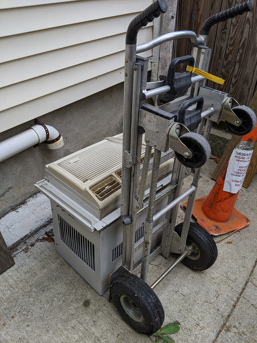 afterwards my father and i went to the upstairs apartment and helped the two astrophysicists (including kevin) take down their air conditioners for the season. my father didn't want to move them into the basement so we decided to put them both in kevin's room instead because he has plenty of space. we also removed the common air conditioner installed on the window by the staircase. that one we had to use the multi-ladder to get it down as it was too high to reach. afterwards it took me and the two astrophysicists to carry the heavy AC down to the street. we put it on a hand truck and wheeled it into the back for disposal next week.