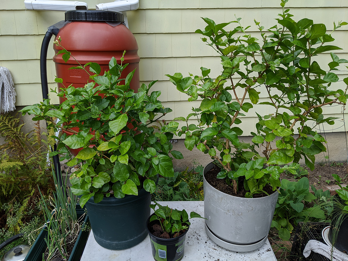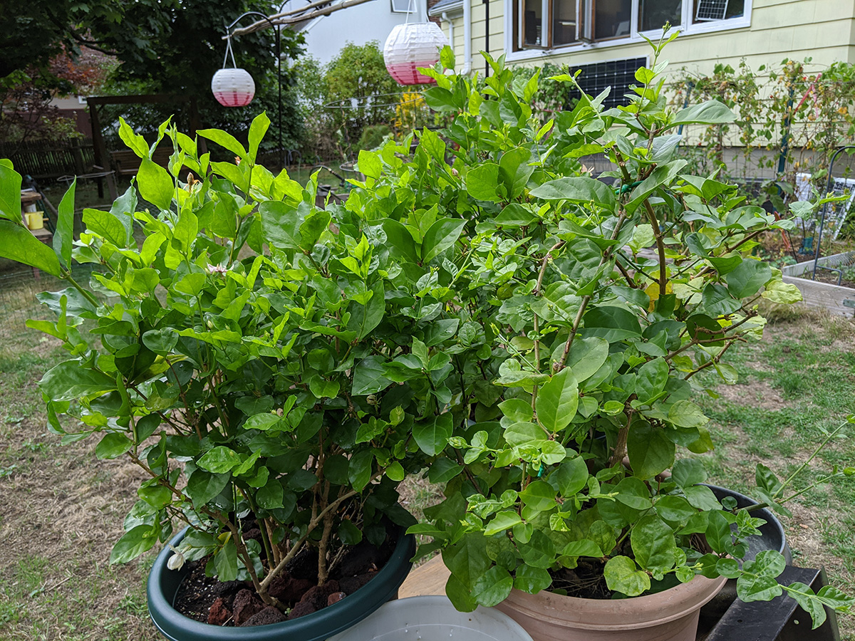 today was uncomfortably hot and humid. i only went out into the backyard once, in the late afternoon, to spray some of our outdoor houseplants with neem oil extract. i haven't seen any bugs or diseases on them since we put them outside, other than the mealybugs that lived on the plants when they were indoors which i treated with insecticidal soap. my hope is we can get rid of all the pests so when we bring them indoors once the weather turns colder they will be pest-free while they're in the grow room. that may be overly ambitious, but that's my hope at least. it also gave me a chance to try neem oil extract.