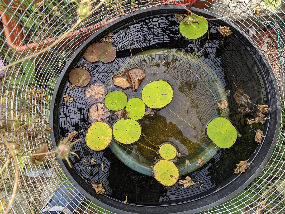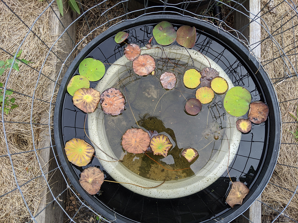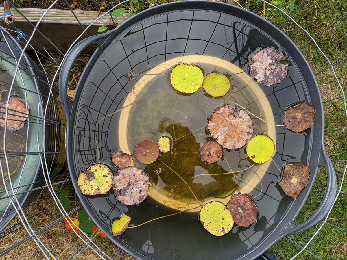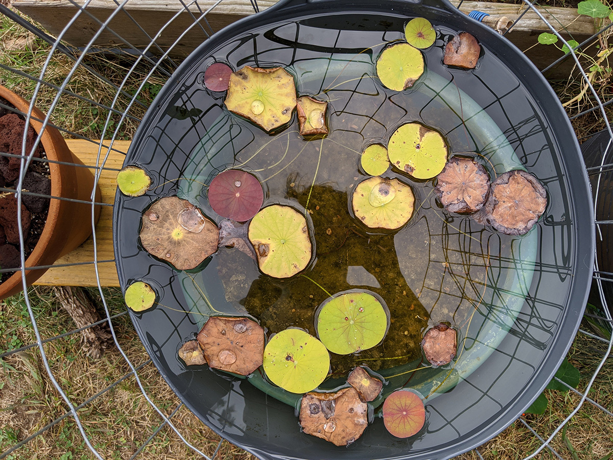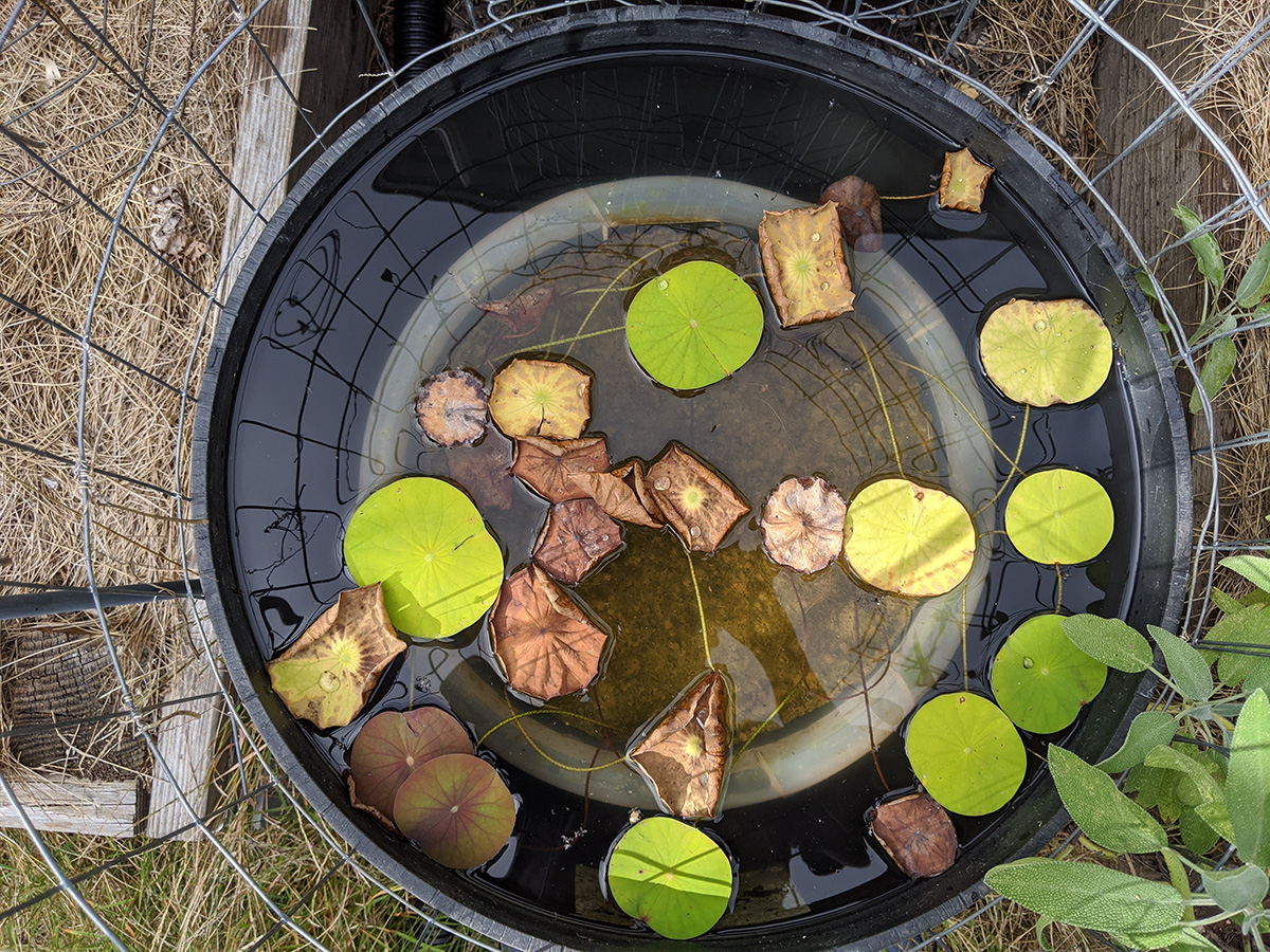 it's almost october and i am not at all happy with the lotus plants this season. i gave them every opportunity to thrive, started the seeds a month early (compared to last year), had each plant in their individual basin and barrel, yet not a single plant developed aerial leaves. maybe it's the variety. at some point i'll need to dig up these lotuses and package them up for winter storage. was it just too dry this season? but these are aquatic plants, what do they know about dryness since they live underwater? whatever it is, i didn't get good plants. seems like i had better luck last year, when i grew them in small pots all crowded together. at least last year i got some aerial leaves.