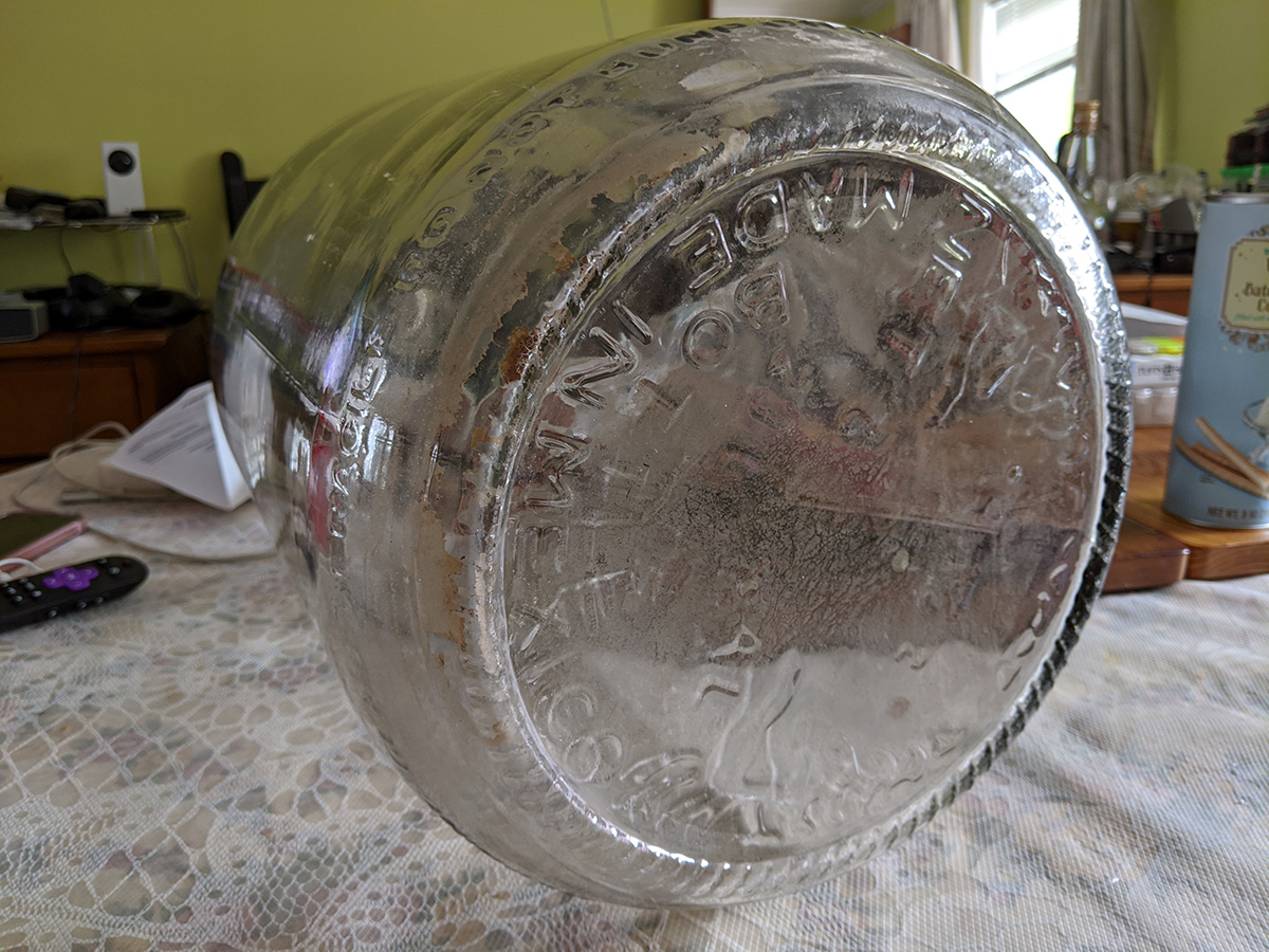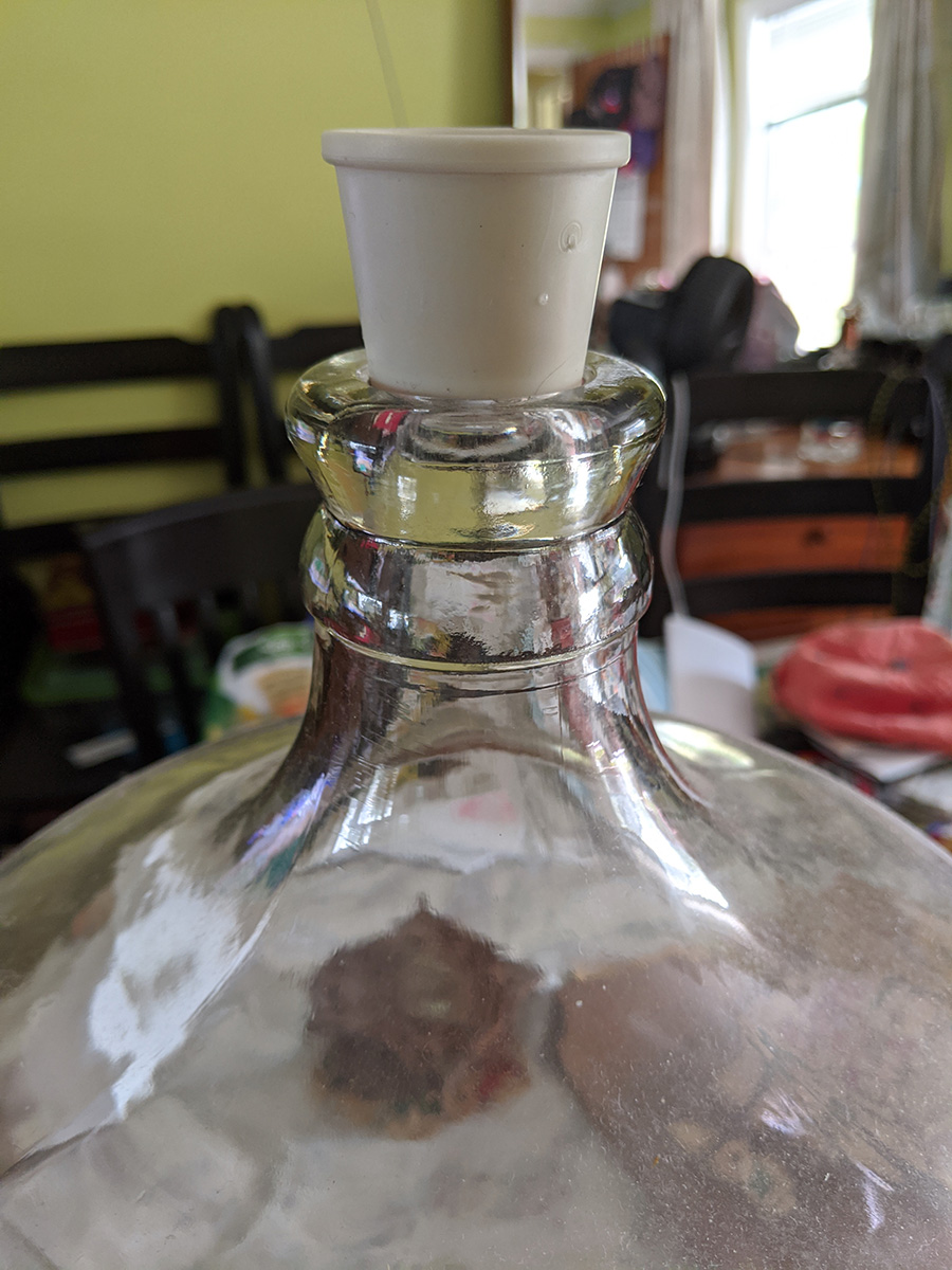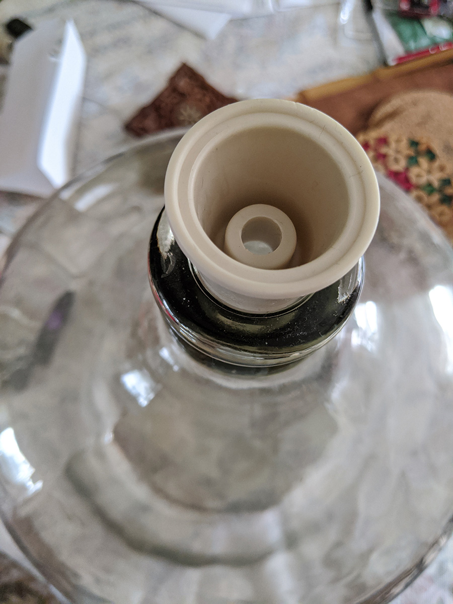 at my parents' place i checked out the glass carboy in the basement. it was a different style than the two that i have at home, this one didn't have a threaded opening. at the bottom it said made in mexico and state the capacity as 6 gallons, even though it seems smaller than my other two carboys. the opening was a little small but i still managed to fit a stopper in the hole.