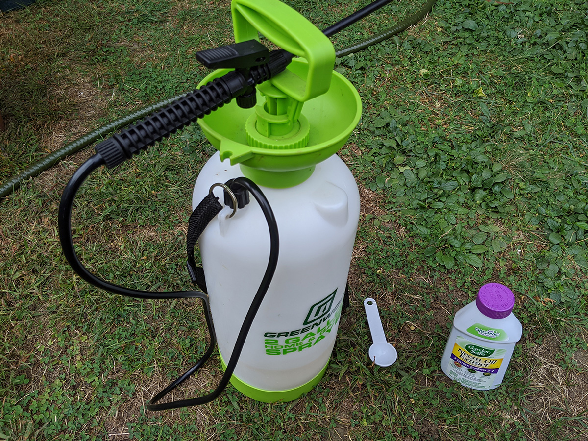 i used 1 oz. of neem oil extract (2 tbsp) to a gallon of water. the NOE was brown and oily and had a faint citrus odor, like a cleaning product, didn't smell bad at all. i used the sprayer and dreamed all the plants. i had some left over so i sprayed some squash leaves that had powdery mildew, supposedly NOE can stop the spread as well.