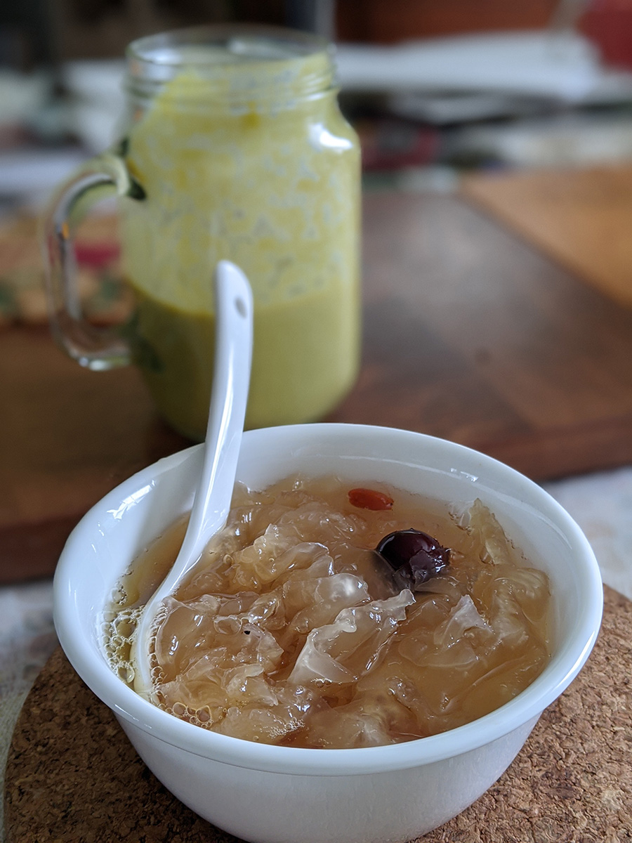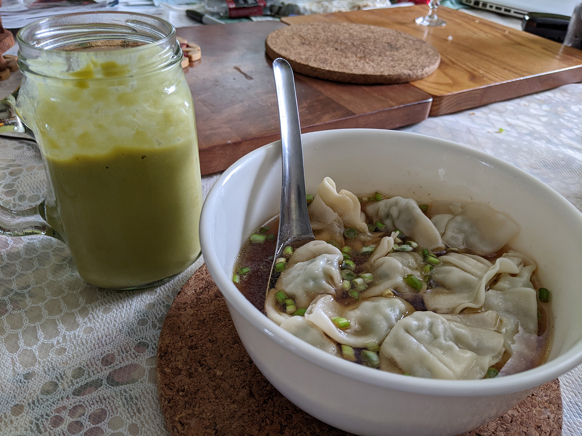 i had wonton soup for lunch and a warm soy and squash milk my parents whipped out with the soy milk maker. it was supposed to be yellow-orange but the squash was green for some reason so the milk came out green. afterwards i had some white snow fungus (銀耳) soup for dessert.