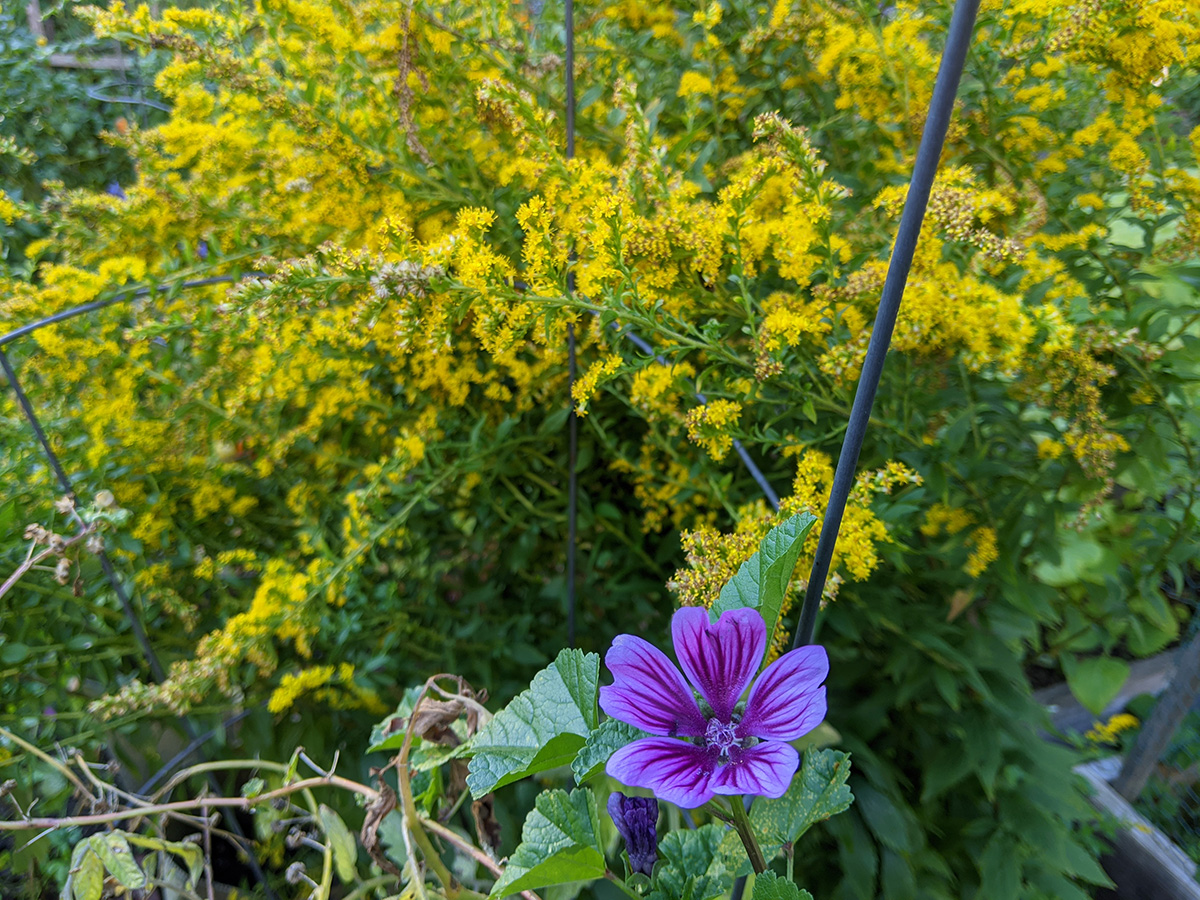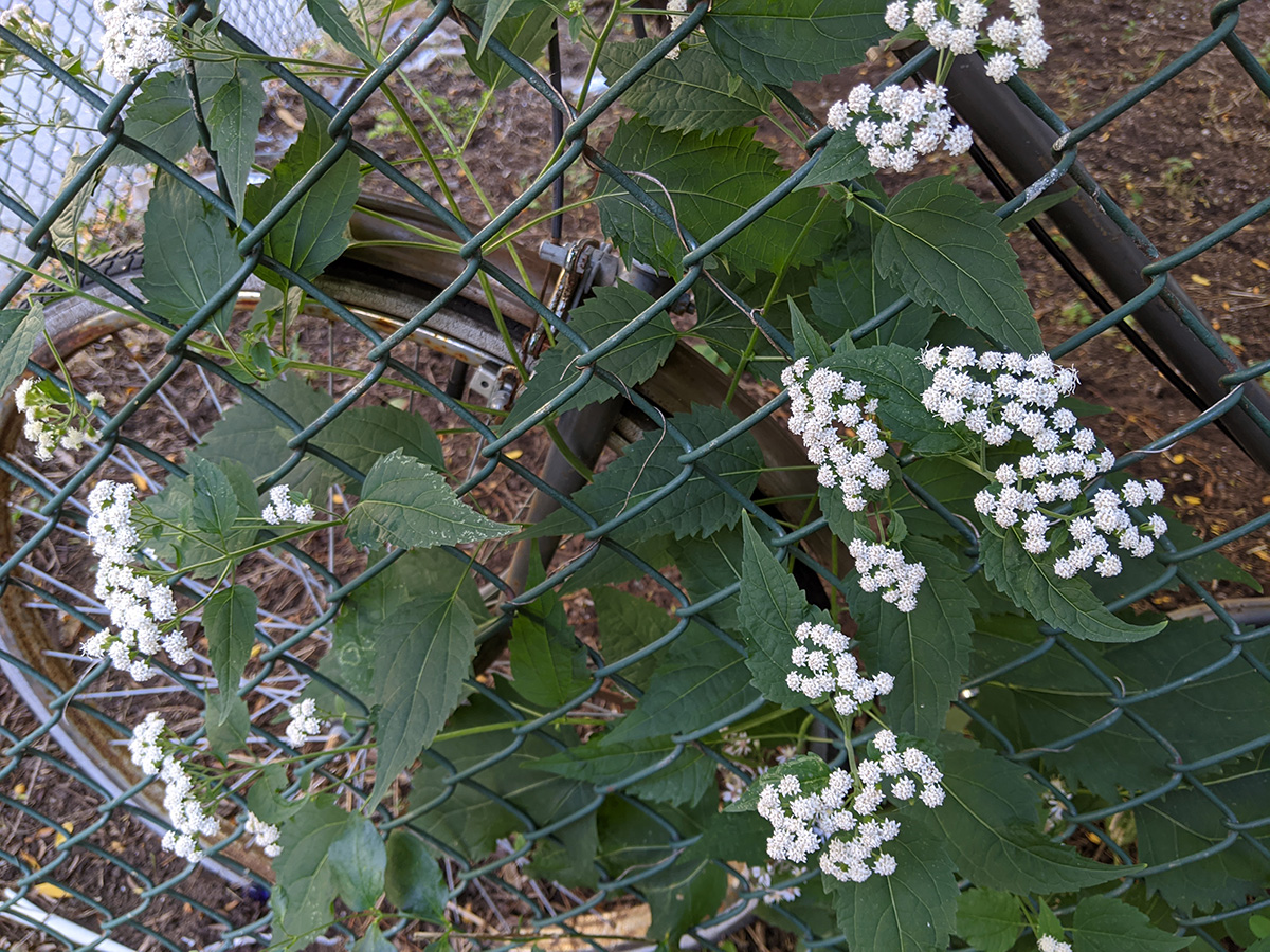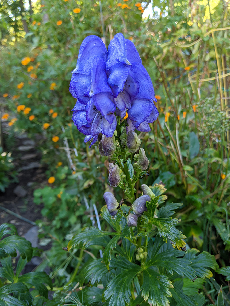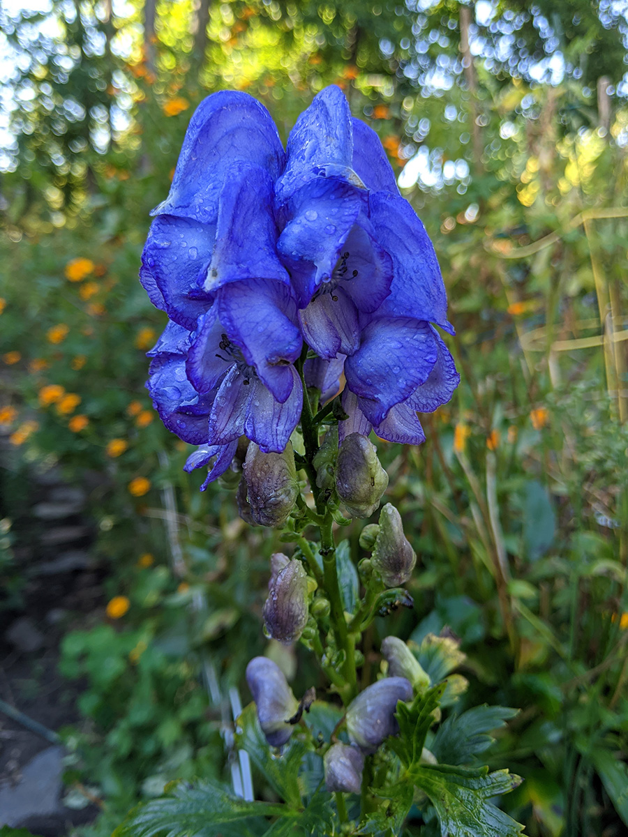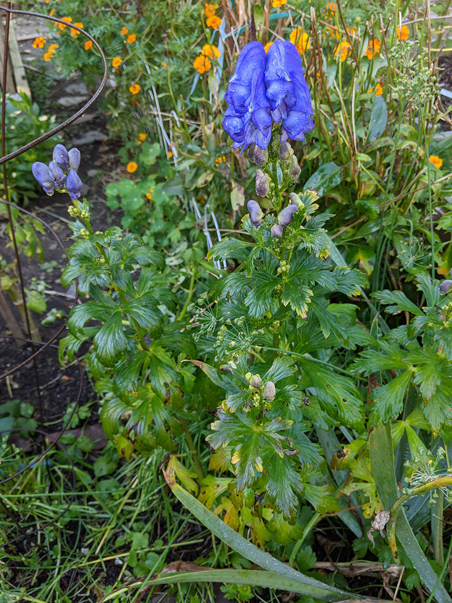 as soon as i got back i was out the door, this time to my community garden to water my plants and to collect some garlic chives. they sold them at ming's market, but at $3.99/lbs. i thought they were too expensive. i had garlic chives in my garlic, but they're late season plants, so more stems than chives. i cut a few bunches to sort out back at home. i saw a girl taking photos of flowers with her phone and gave her a quick tour of my own plot. i was particularly proud of my poisonous monkshood which were finally blooming.