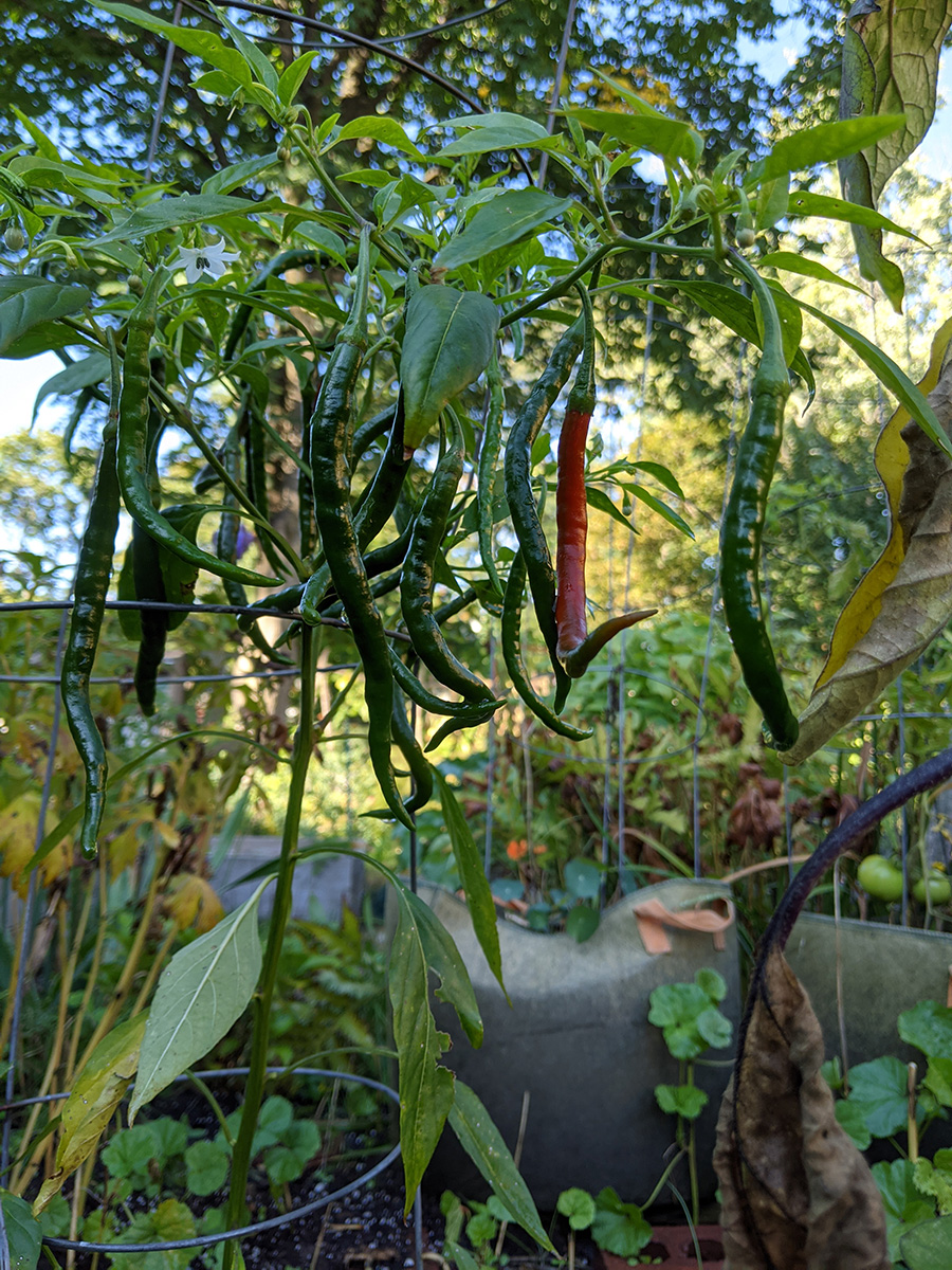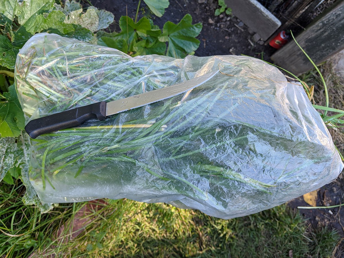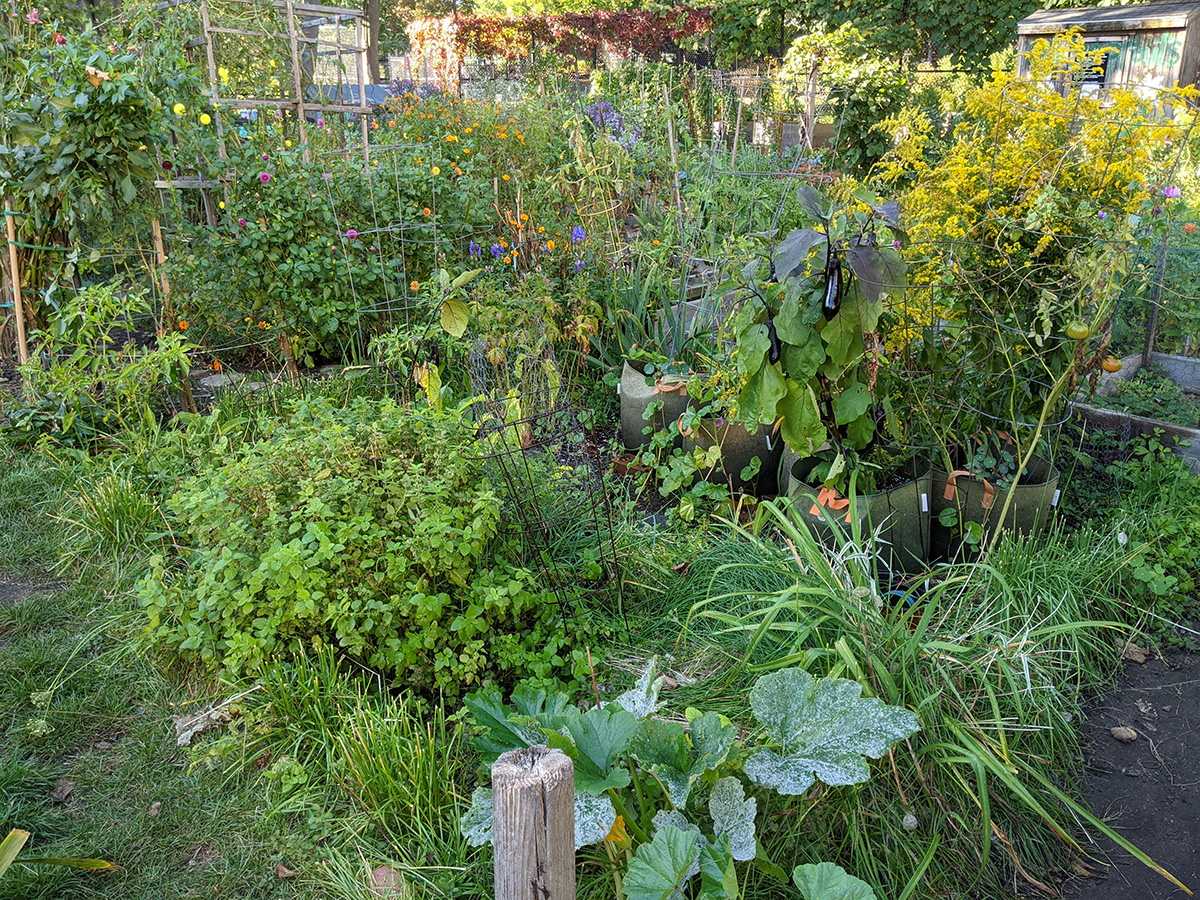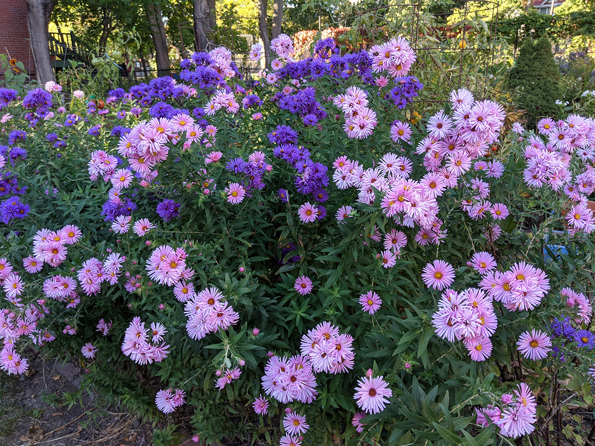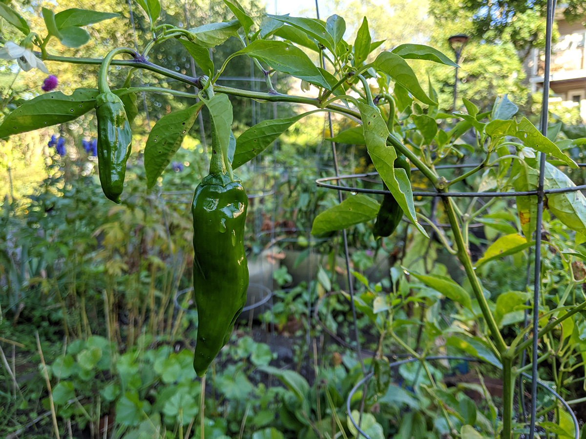 as soon as i got back i was out the door, this time to my community garden to water my plants and to collect some garlic chives. they sold them at ming's market, but at $3.99/lbs. i thought they were too expensive. i had garlic chives in my garlic, but they're late season plants, so more stems than chives. i cut a few bunches to sort out back at home. i saw a girl taking photos of flowers with her phone and gave her a quick tour of my own plot. i was particularly proud of my poisonous monkshood which were finally blooming.
