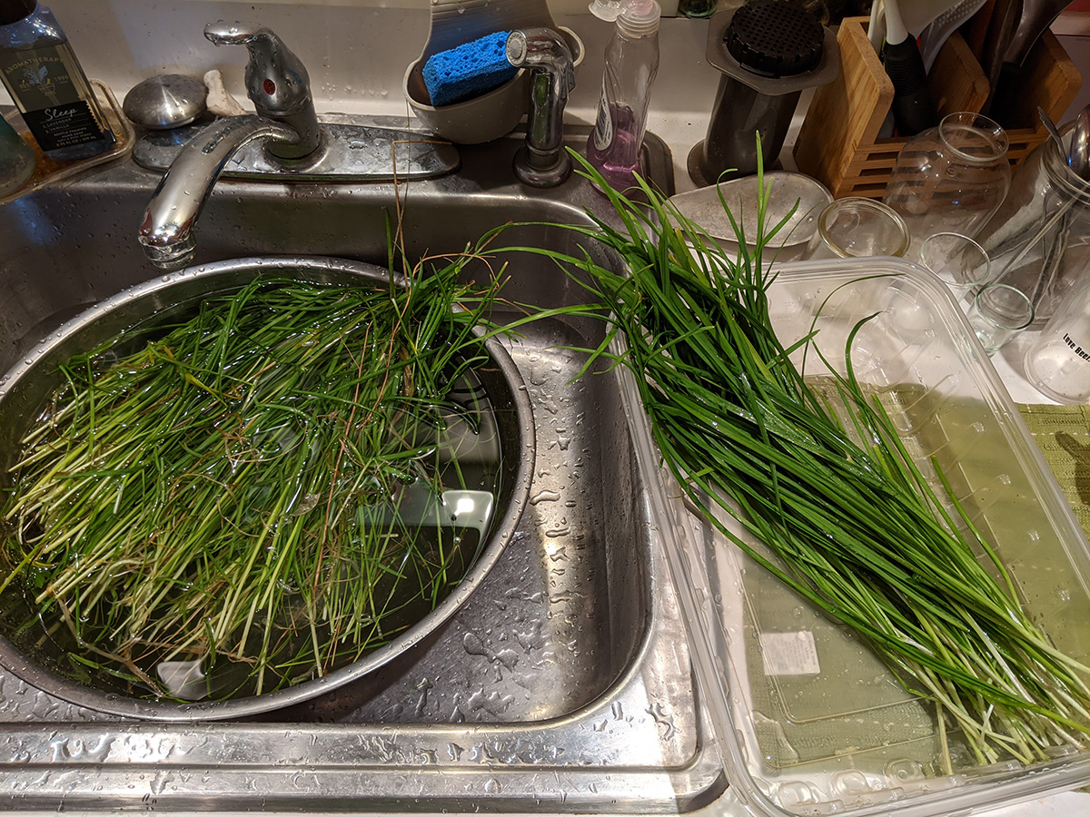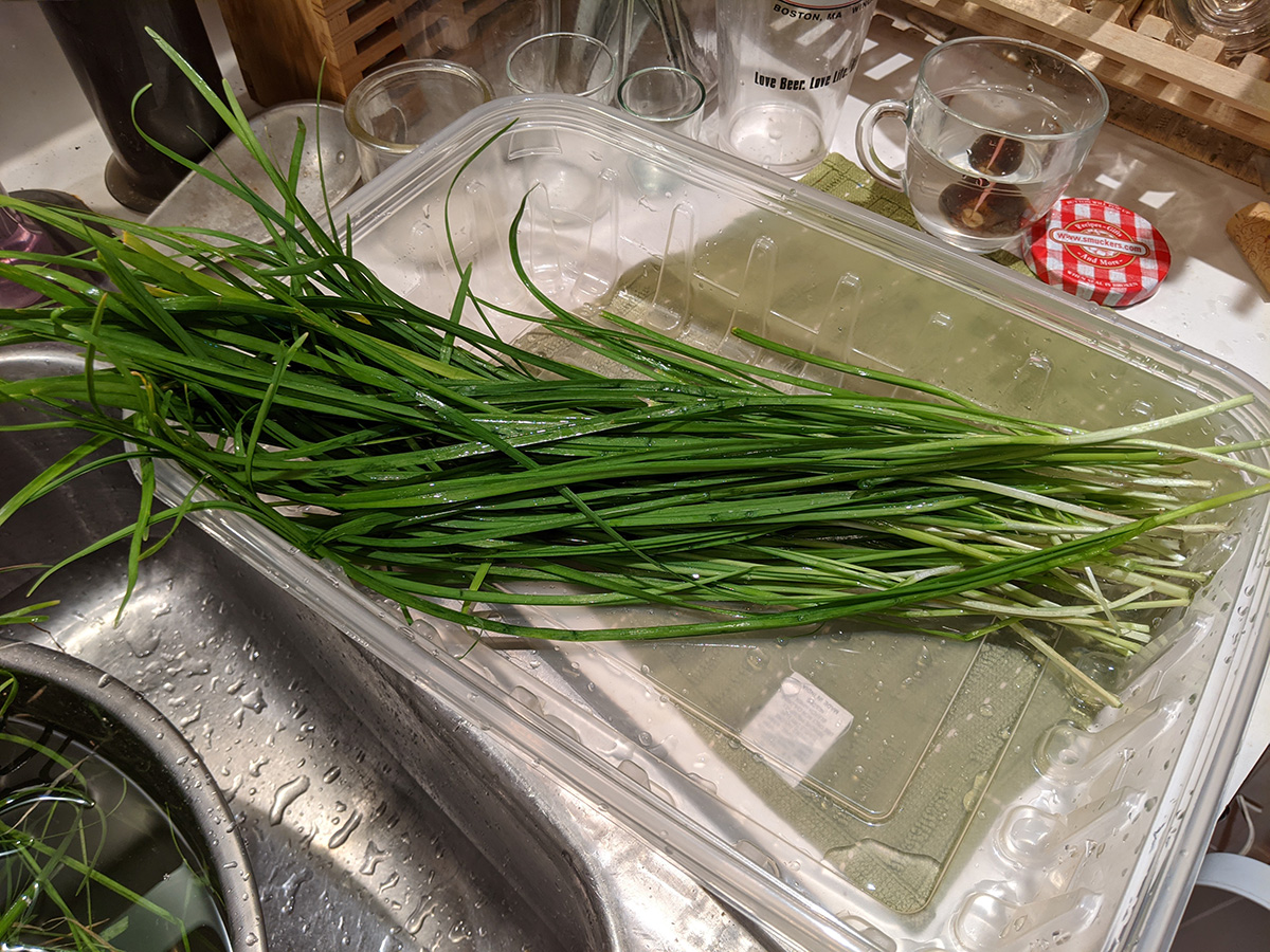 i got back home by 4pm. i soaked the garlic chives in a big bowl of water and started sorting them out. it took half an hour but i finally managed to separate out the tender chive leaves from the tough stems. i rinsed the garlic chives a few times to get rid of any residual dirt before letting them soak for a few hours before putting them in the fridge. now i have to see how many jars i have available and what recipe to use. chopped up kimchi or whole leaf kimchi? i also forgot to get an asian pear, but they sell those at market basket so i'll grab one tomorrow.