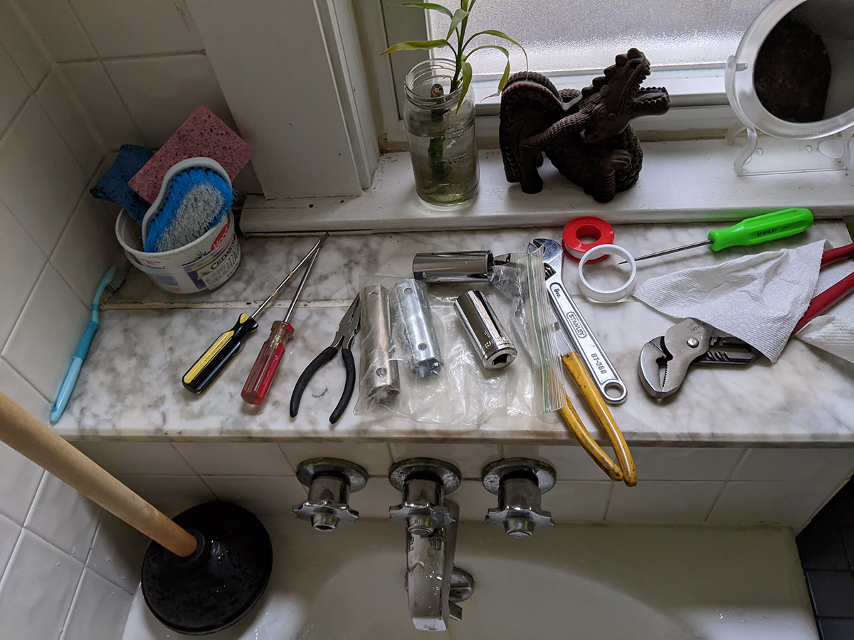 so i gave it a try, flushed my bathroom sink-to-tub a few times, but it didn't seem to do anything. there were a few grains of sand coming out, but not the chunks of debris i was hoping for. more importantly, the cold water coming from the hot water faucet didn't seem to have a lot of pressure, so i was afraid i might've made it worse, inadvertently clogging other parts of my plumbing. i gave up, closed everything back up, and went into the basement to turn the hot water back on.
