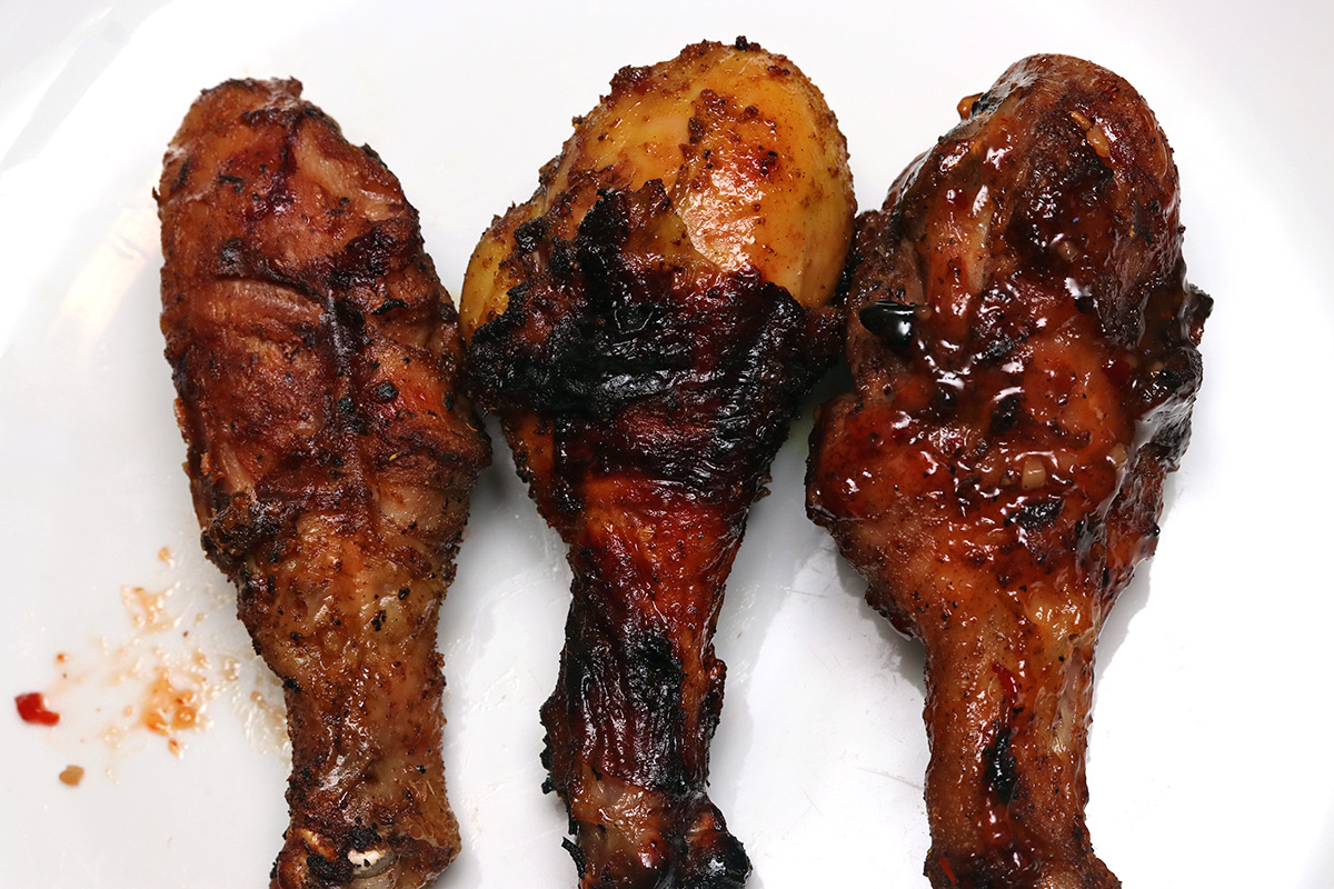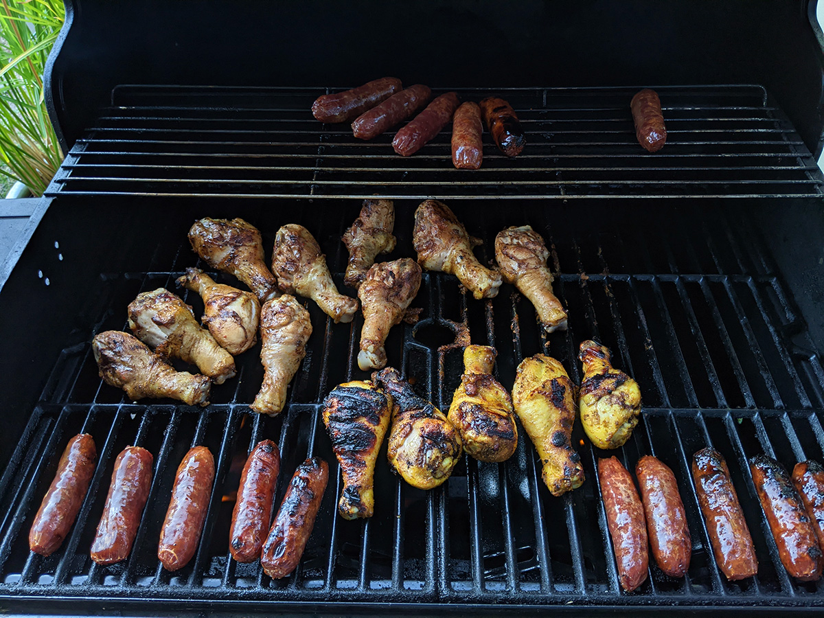 around 4pm my father fired up the barbecue grill. we hadn't used it since we replaced the burner shields. we were grilling some drumsticks and taiwanese sausages. the shields prevented flare ups (which in turn prevented the food from burning) but made it hard to see the flames. i learned the proper way to cook chicken is first on high heat, get the outer skin all crispy, before leaving it to cook on low heat (as long as an hour), then finally cooking it again on high heat with some sauce.